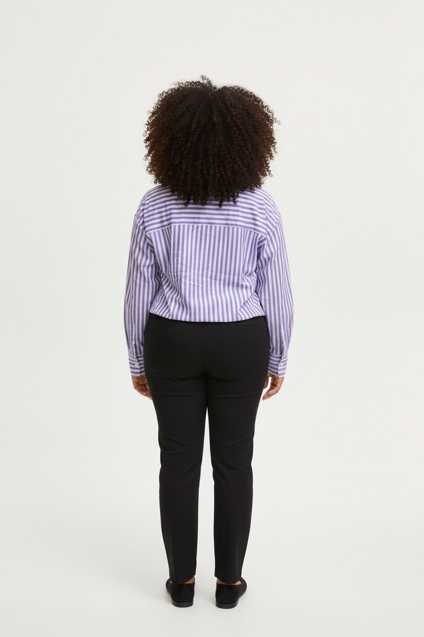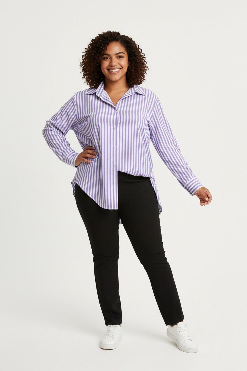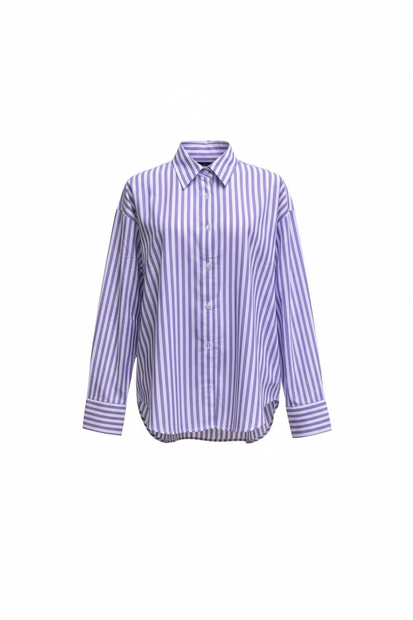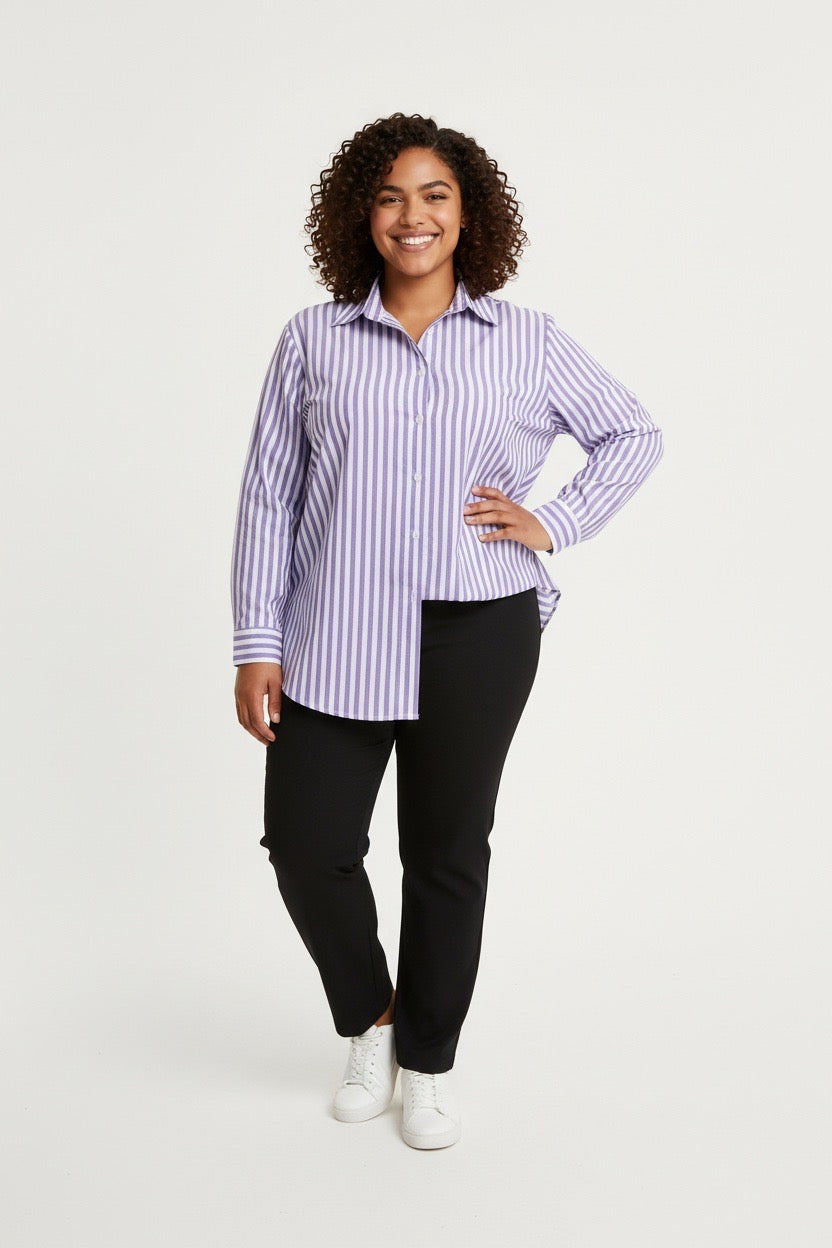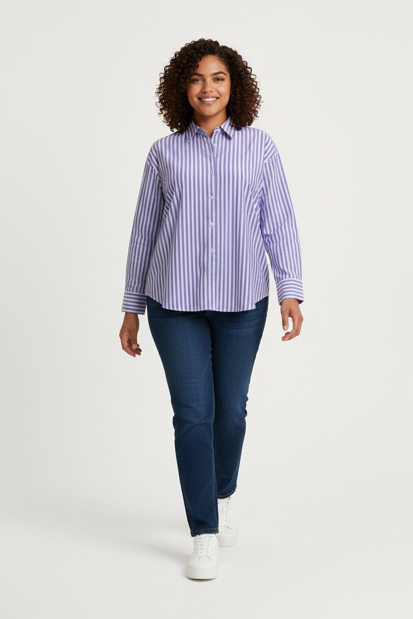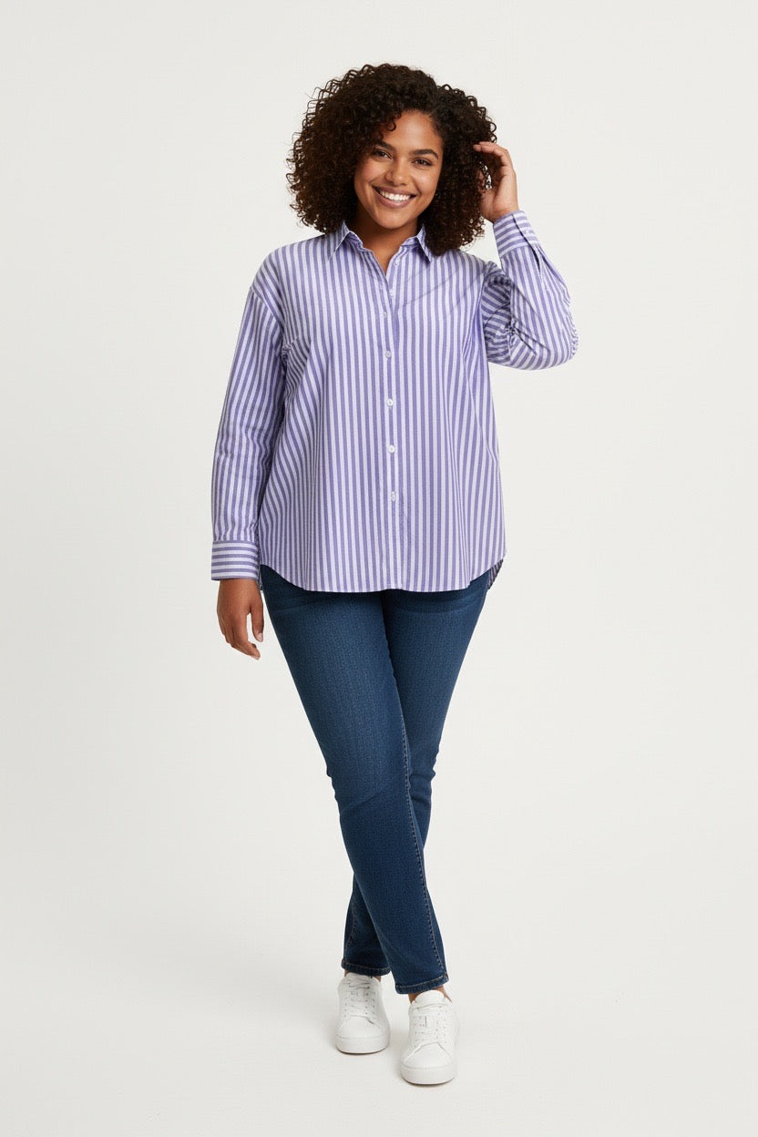 Item: Women's Relaxed-Fit Purple and White Vertical Striped Long-Sleeve Shirt.