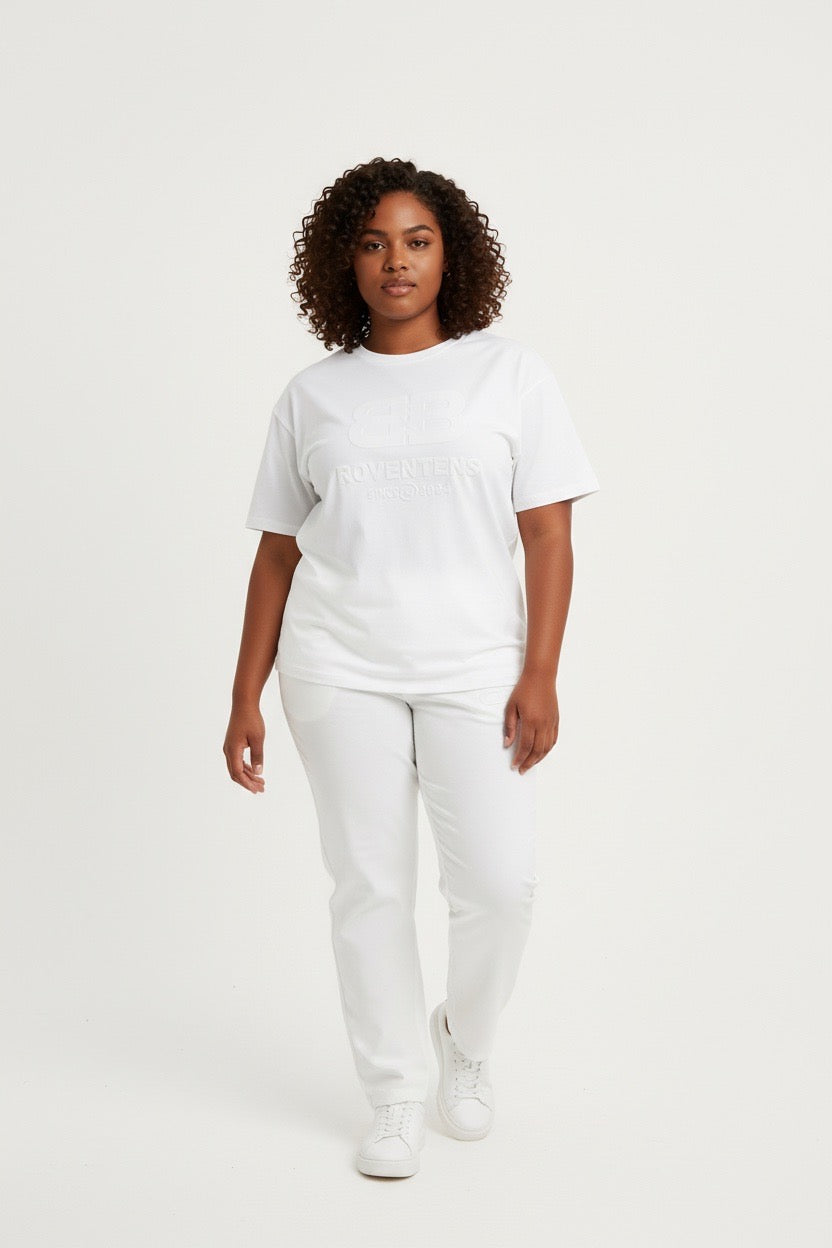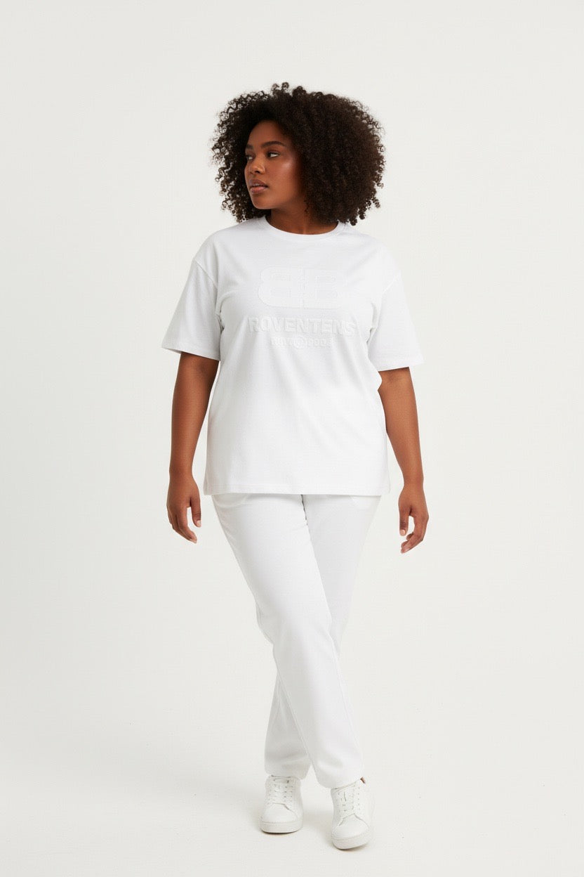 The outfit is characterized by its embossed tonal branding on both the chest of the t-shirt and the upper portion of the pants. The set appears to be made from a soft, textured material, likely a cotton blend or French Terry, designed for comfort and a relaxed "lived-in" look.