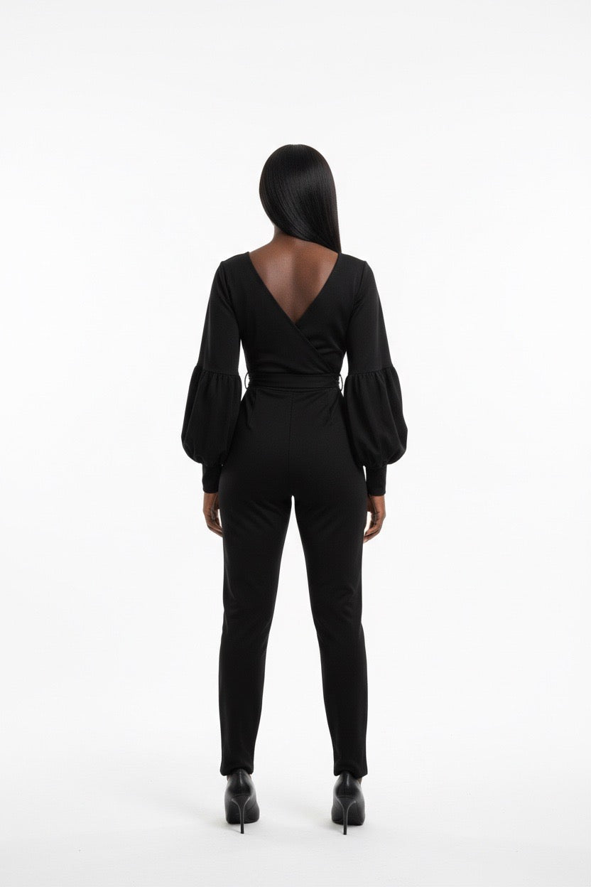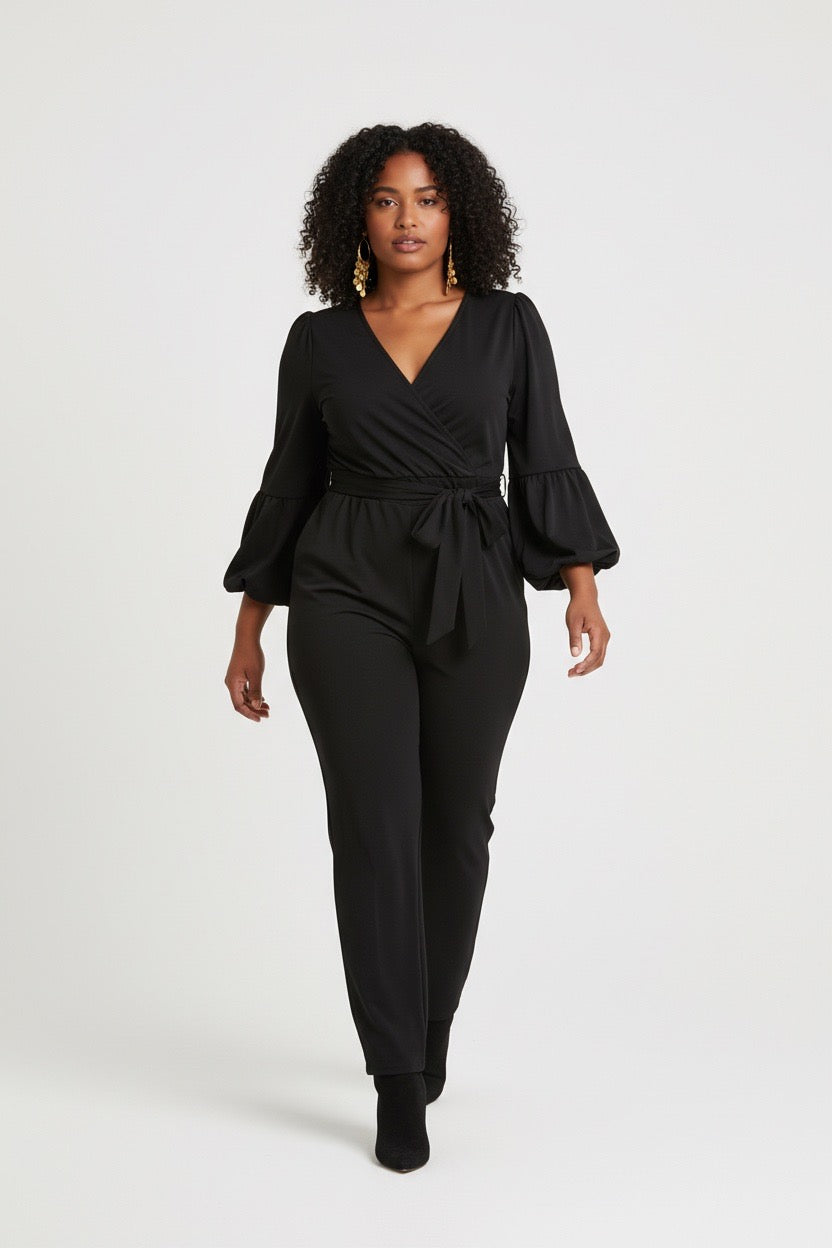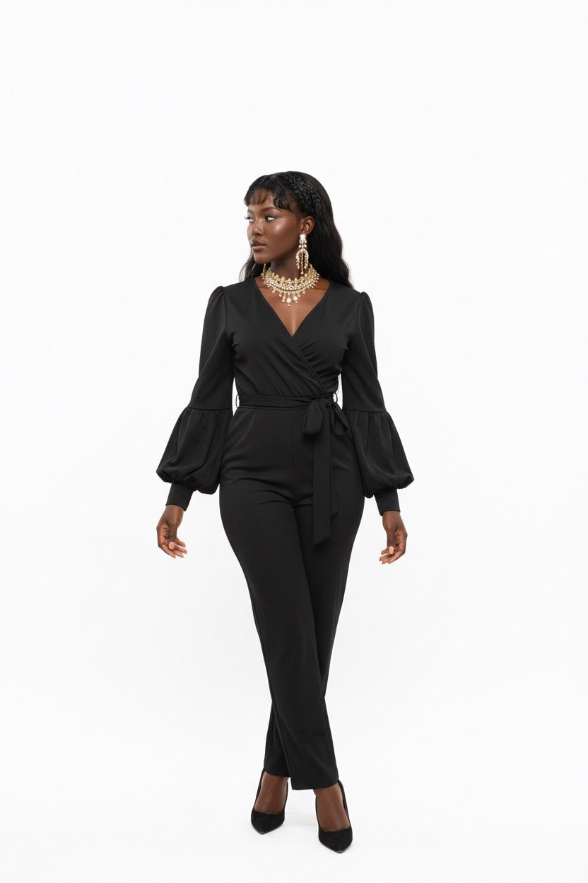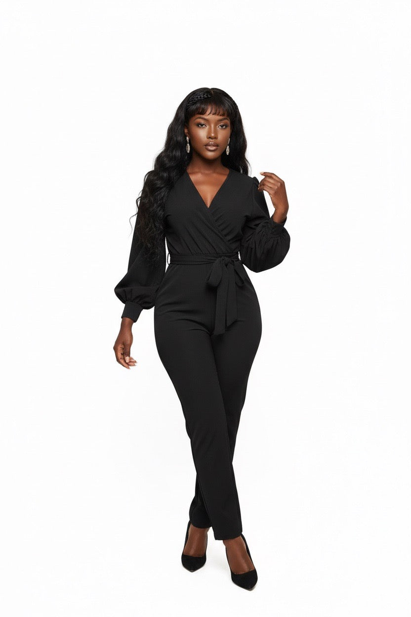 Item: Women's outfit is a v-neck, long-sleeved jumpsuit that features lantern or balloon sleeves and a matching waist tie belt.