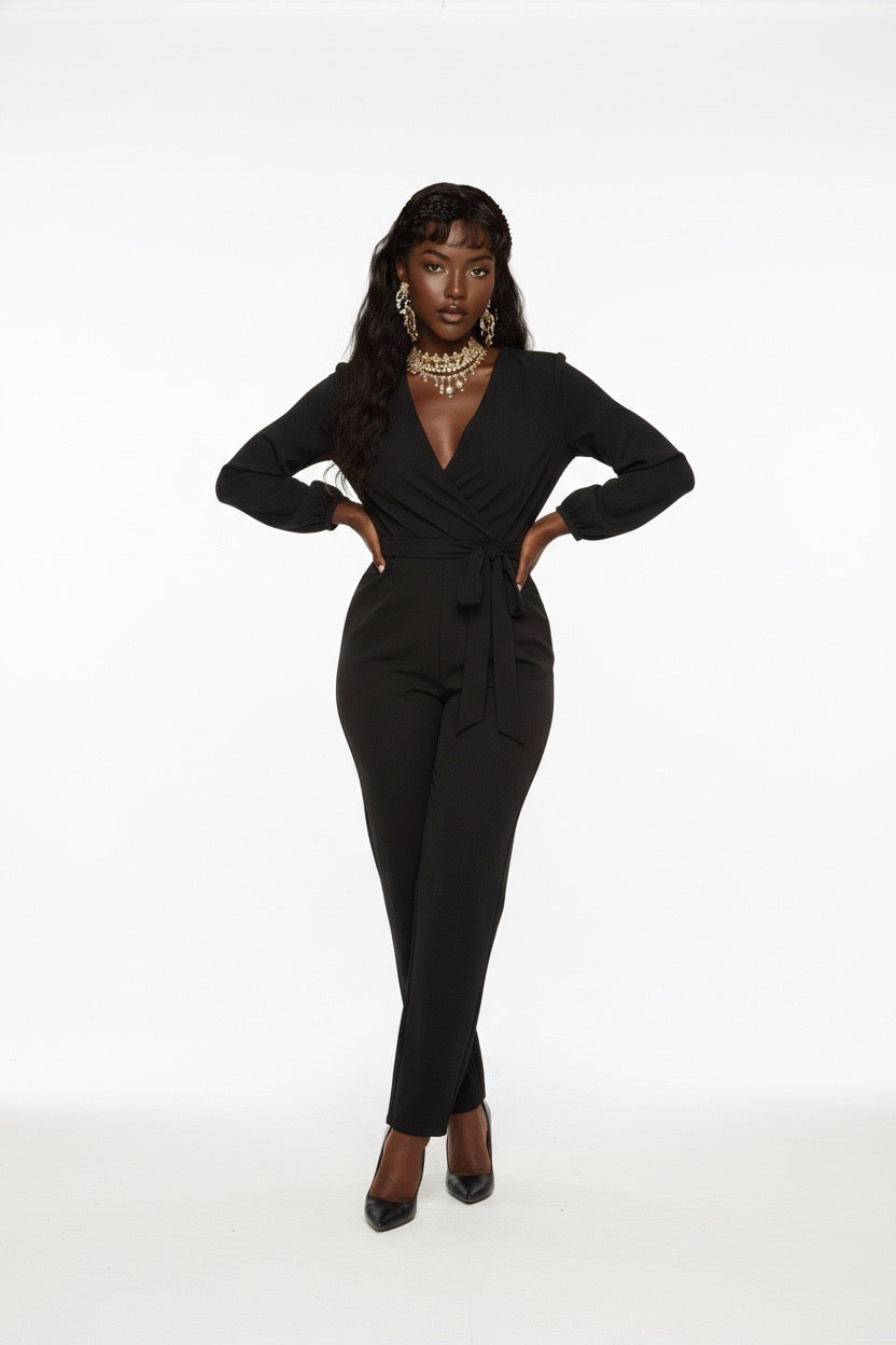 • Design & Silhouette: This elegant jumpsuit features a flattering wrap-style bodice with a deep V-neckline. It includes a high-waist design complemented by a matching adjustable tie-belt to enhance the silhouette.
