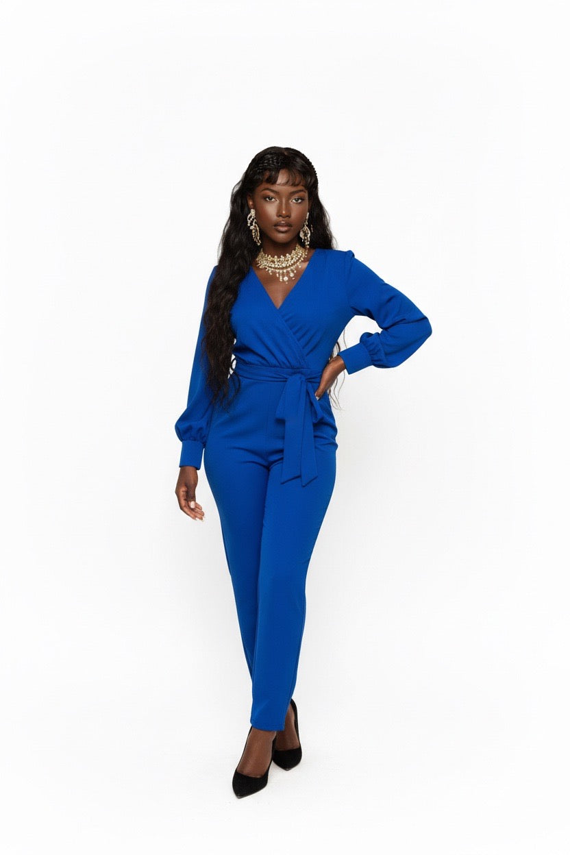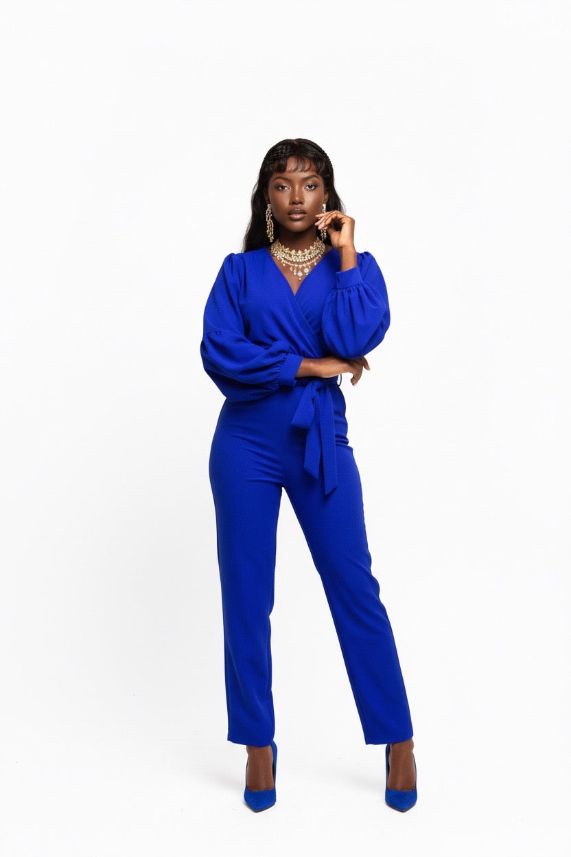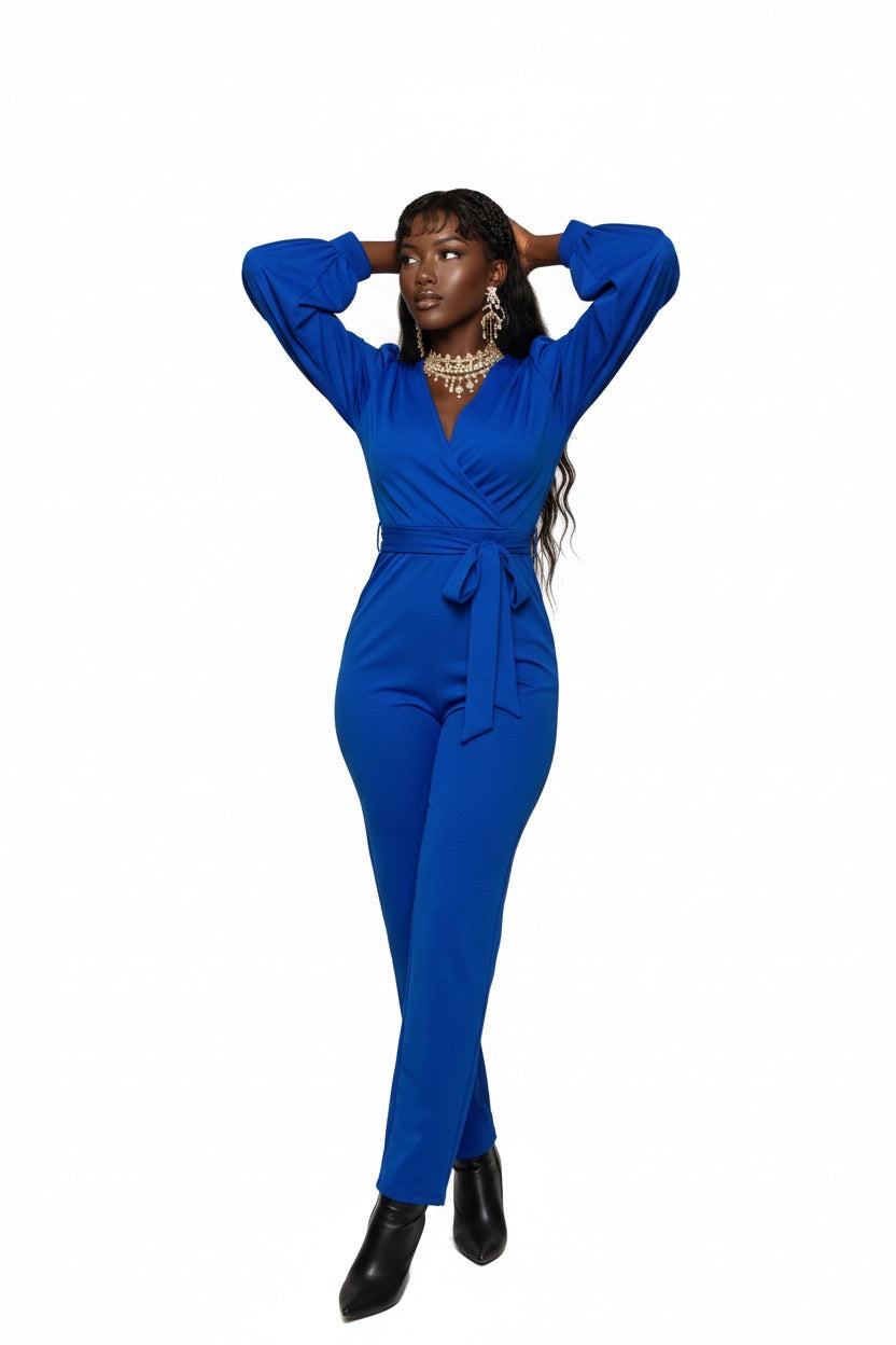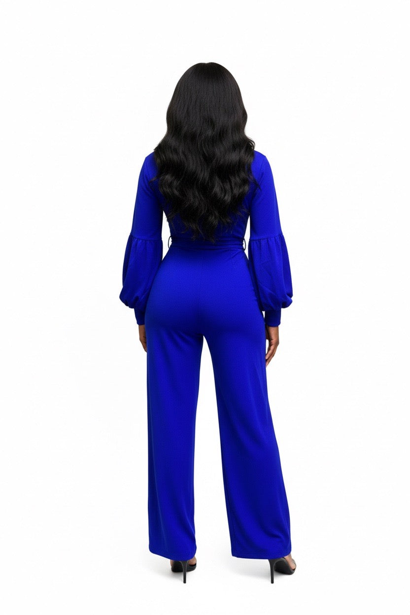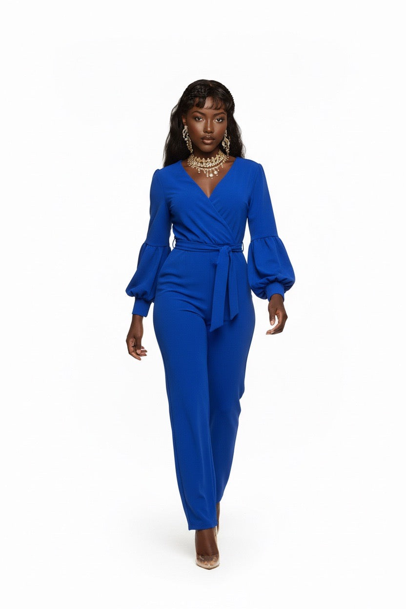 Item: Women's outfit is a v-neck, long-sleeved jumpsuit that features lantern or balloon sleeves and a matching waist tie belt.