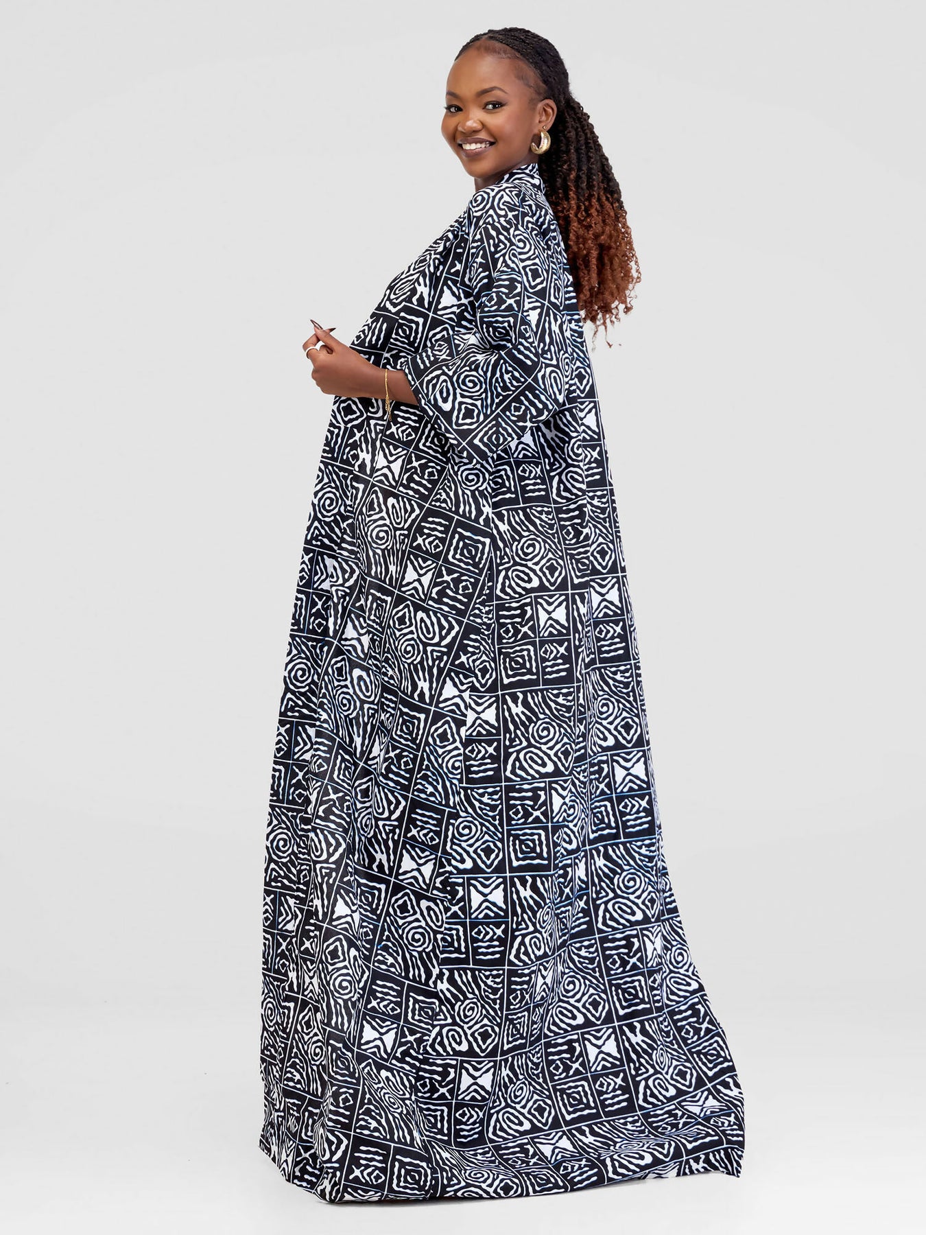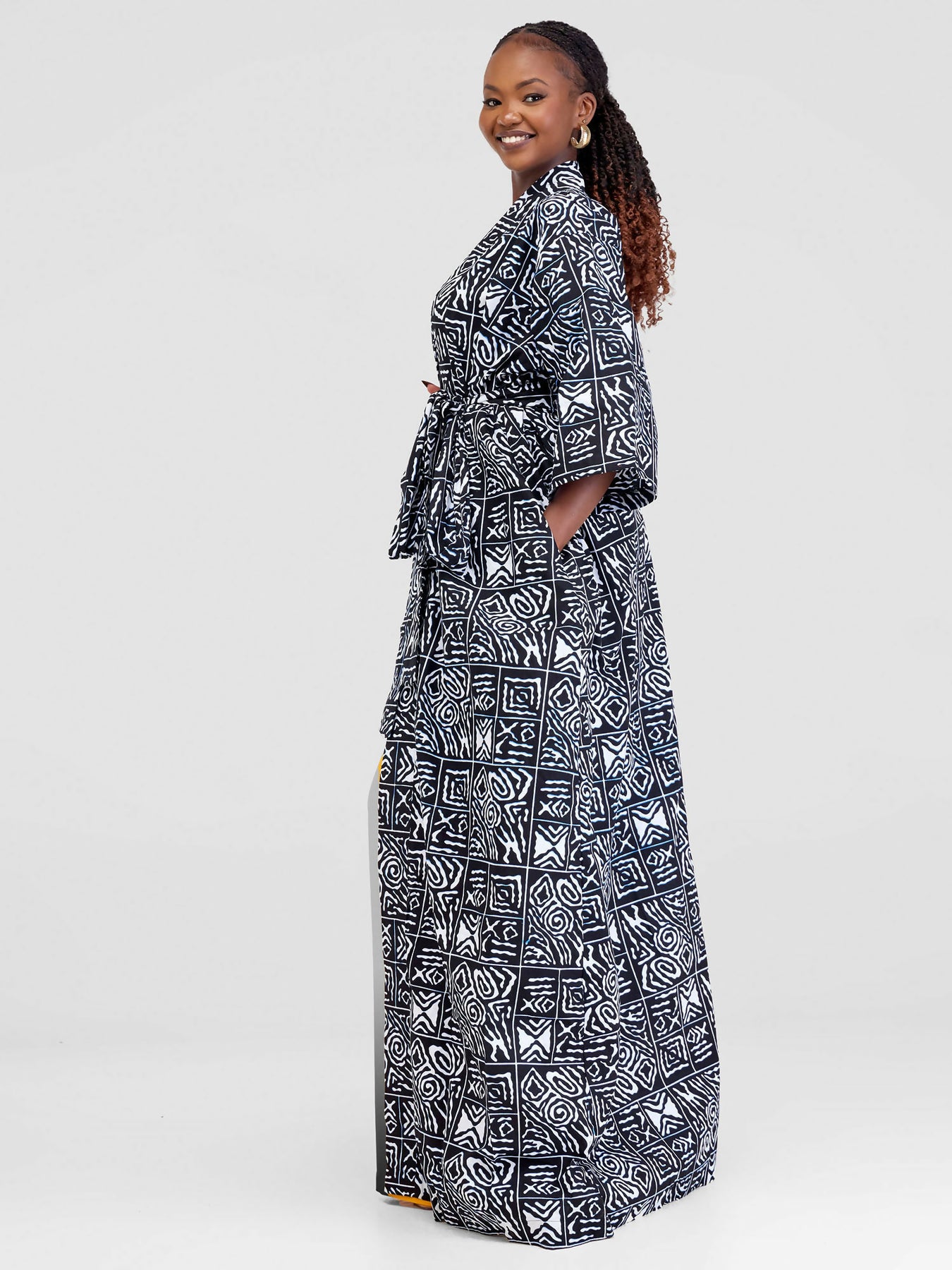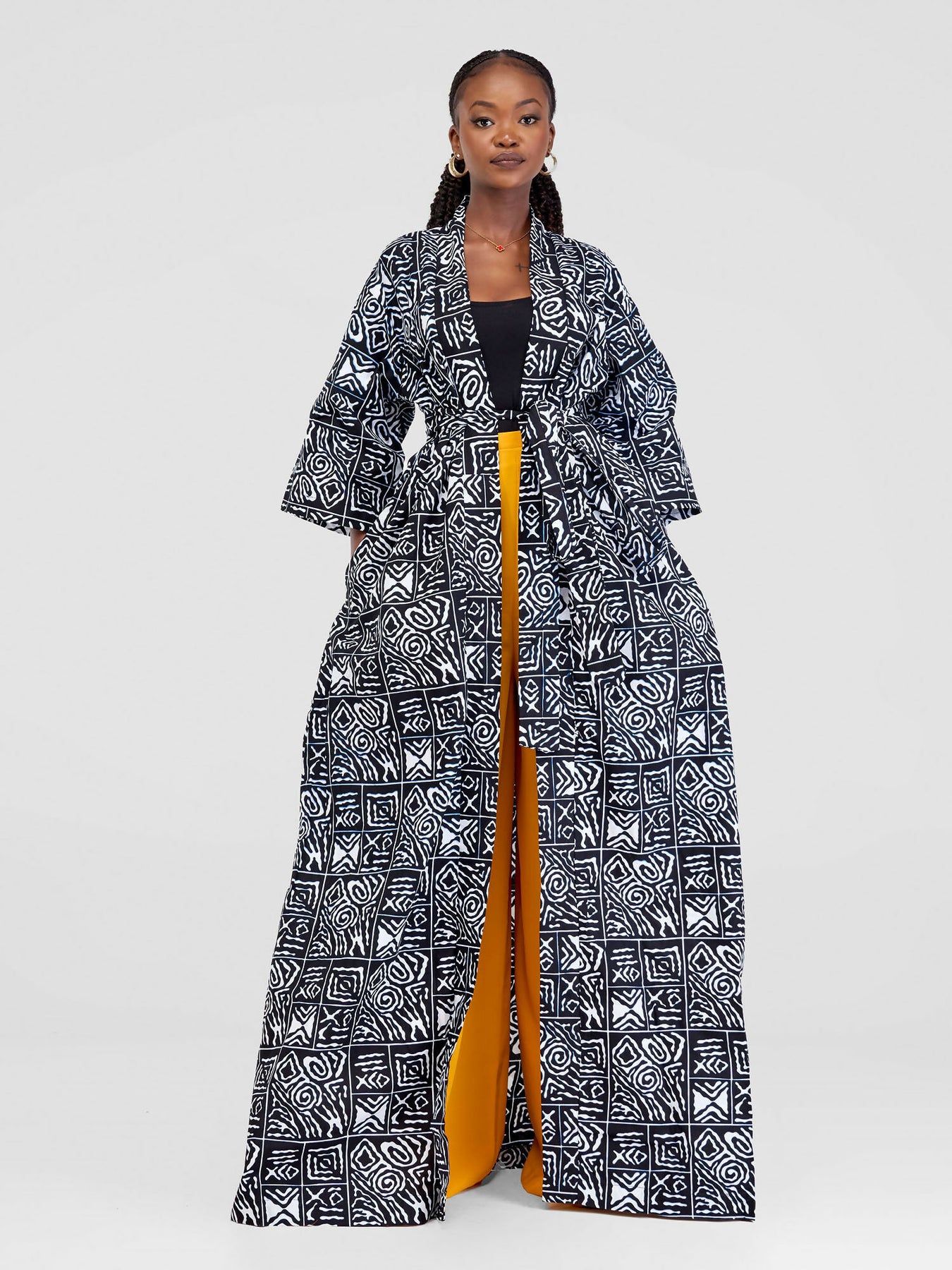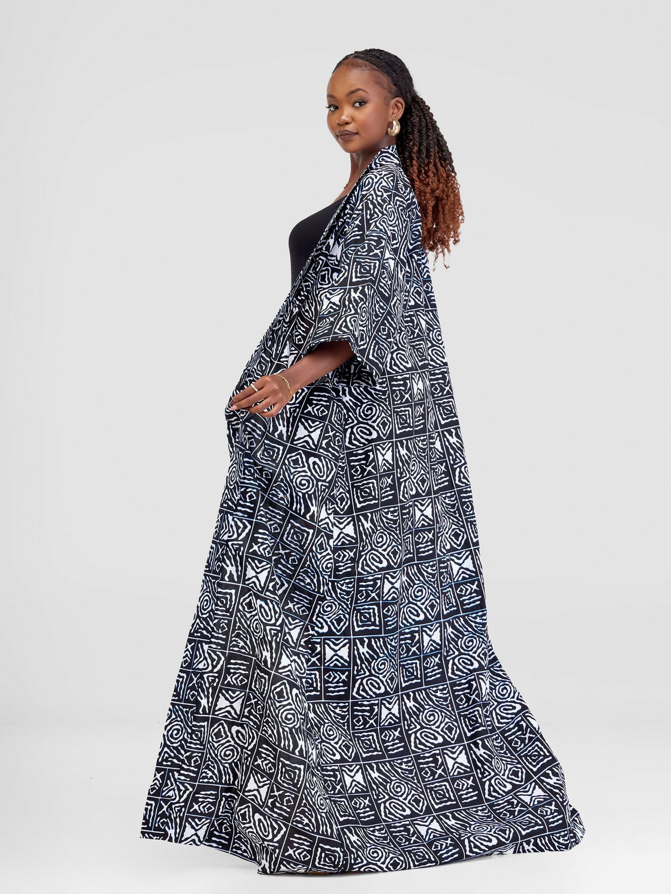A statement-making black and white African print kimono, designed for the fashion-forward individual. This floor-length kimono exudes style with its bold rectangular patterns, adding a contemporary twist to traditional African motifs. Crafted with meticulous attention to detail, it boasts a trendy and sophisticated look that is sure to turn heads.