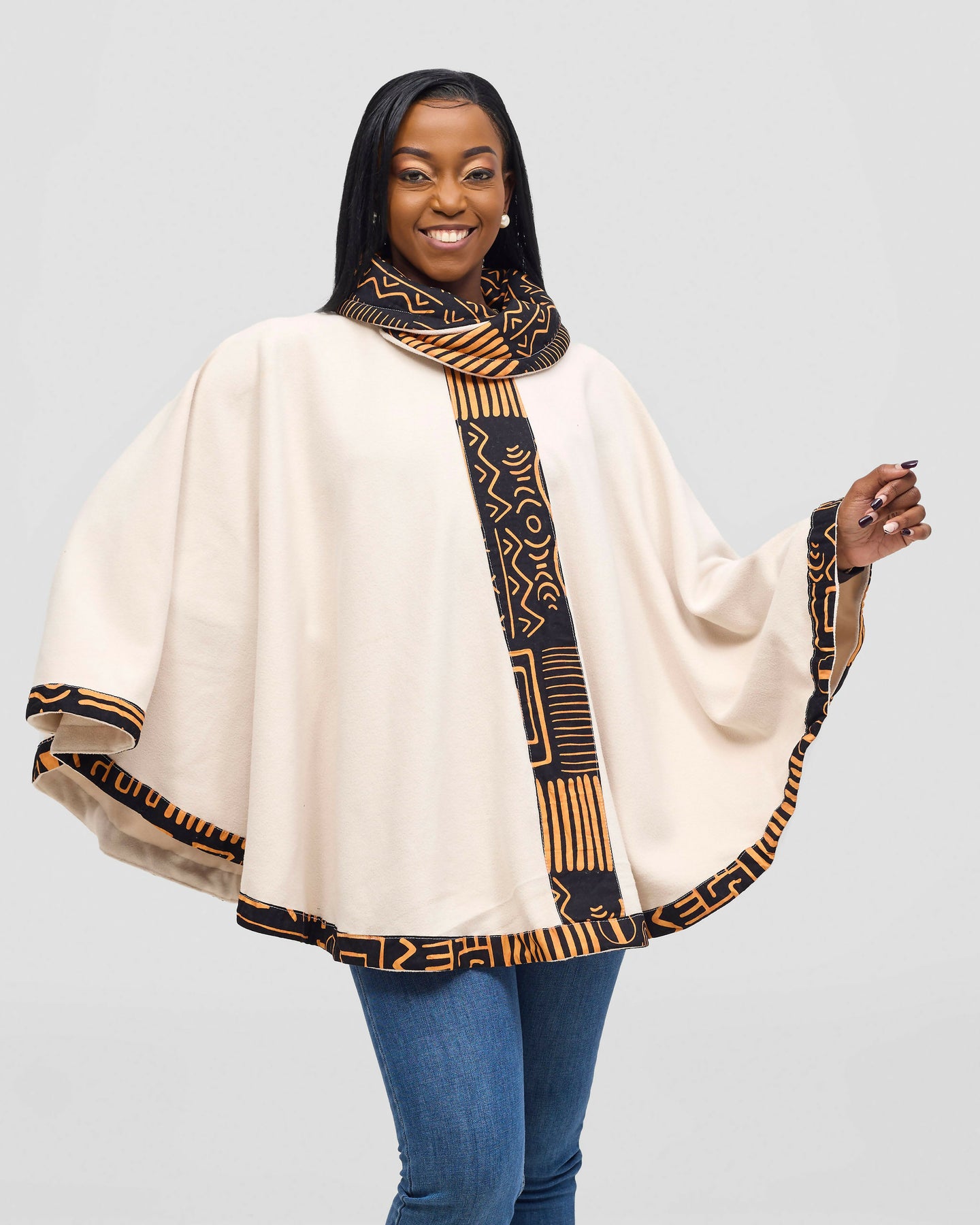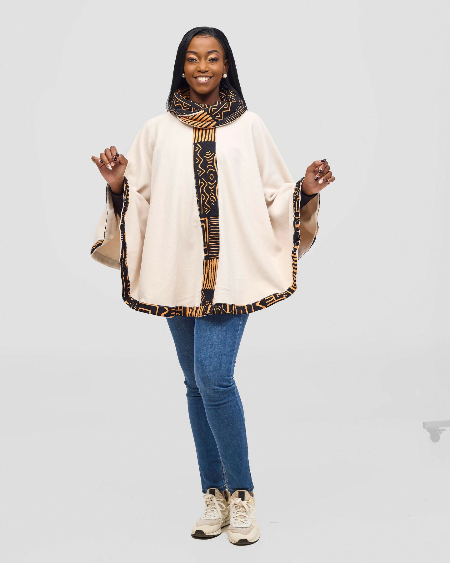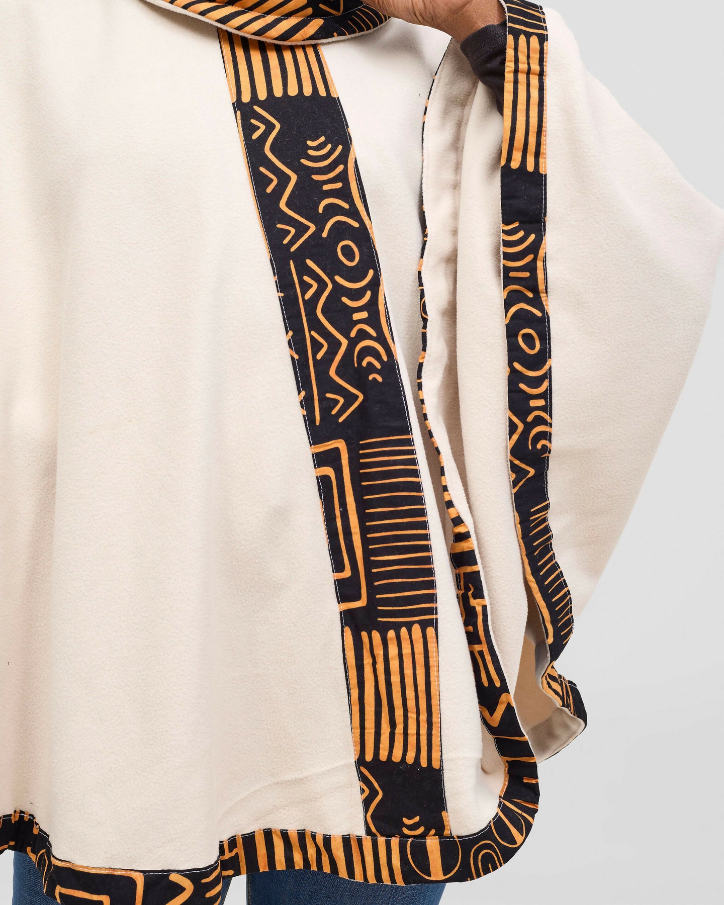 We've added a touch of African print fabric to this poncho, infusing it with vibrant patterns and cultural richness. It's a beautiful blend of contemporary and traditional aesthetics.
