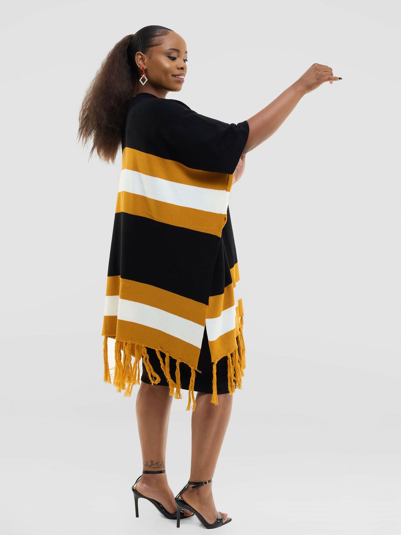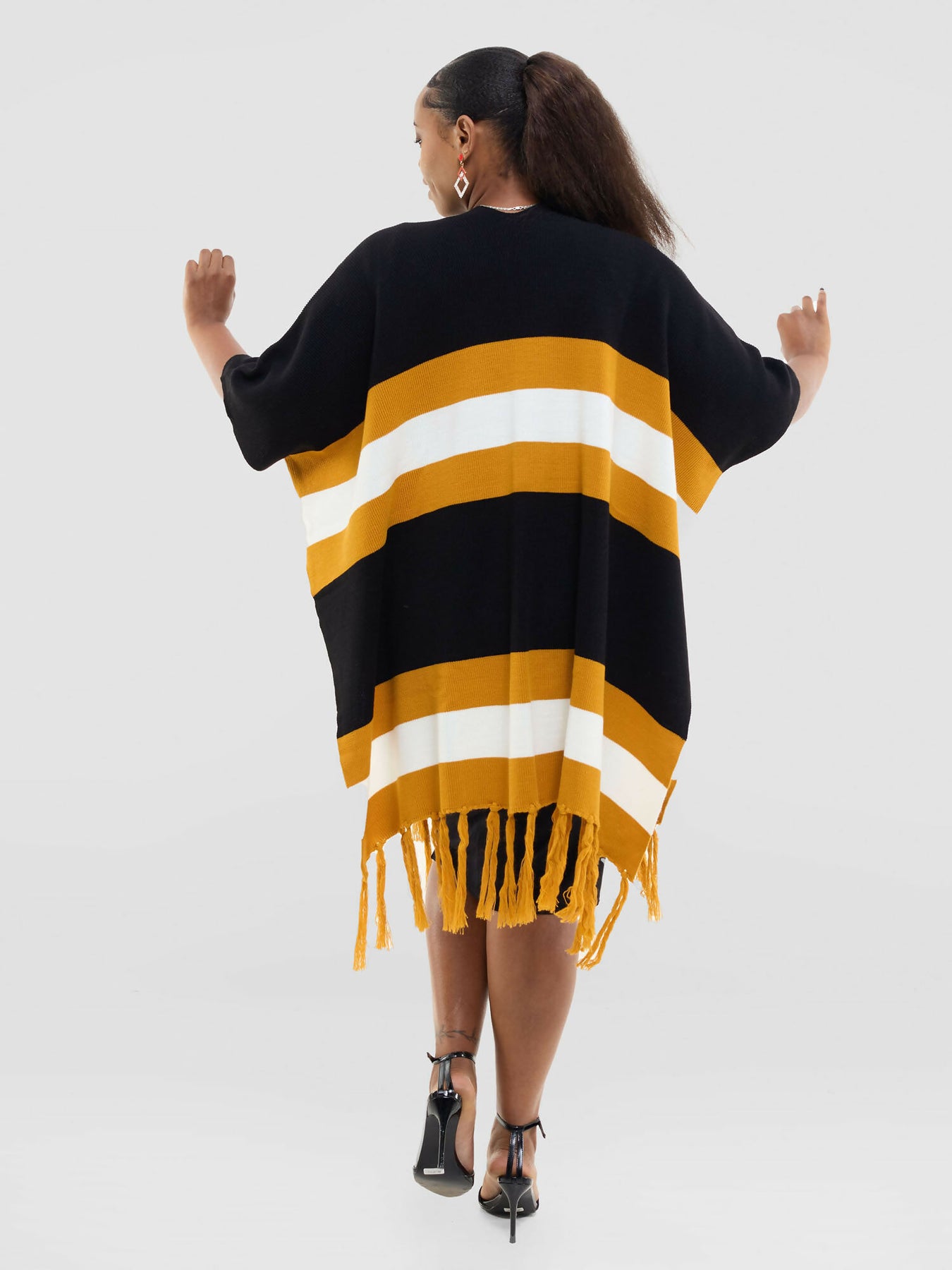 Make a statement with this bold and cozy striped kimono, crafted from soft acrylic yarn for ultimate comfort and warmth. Featuring wide mustard, black, and white color blocks, this open-front piece adds effortless flair to any outfit. The playful fringed hemline gives it a trendy, free-spirited finish, perfect for layering during cooler days.