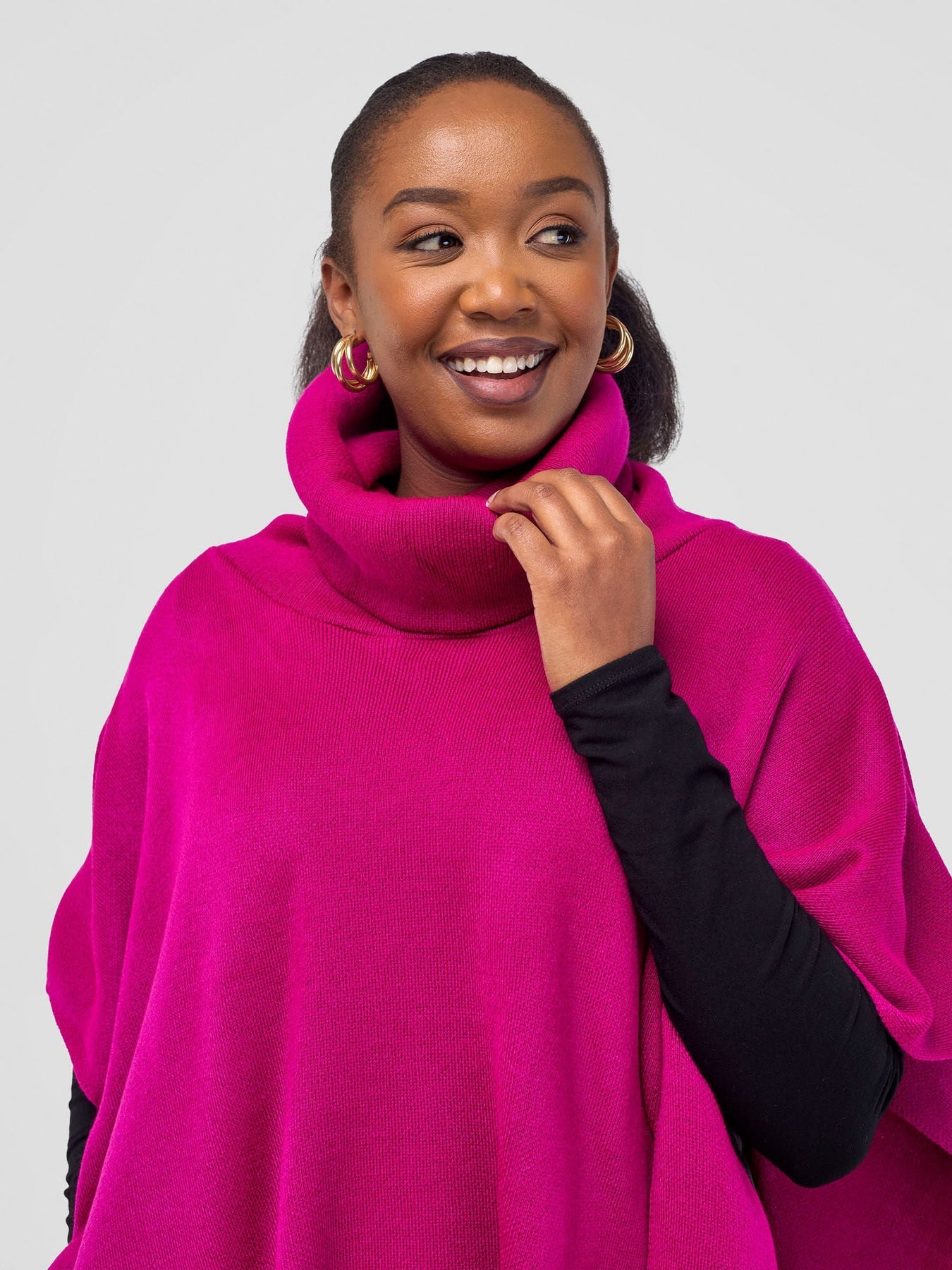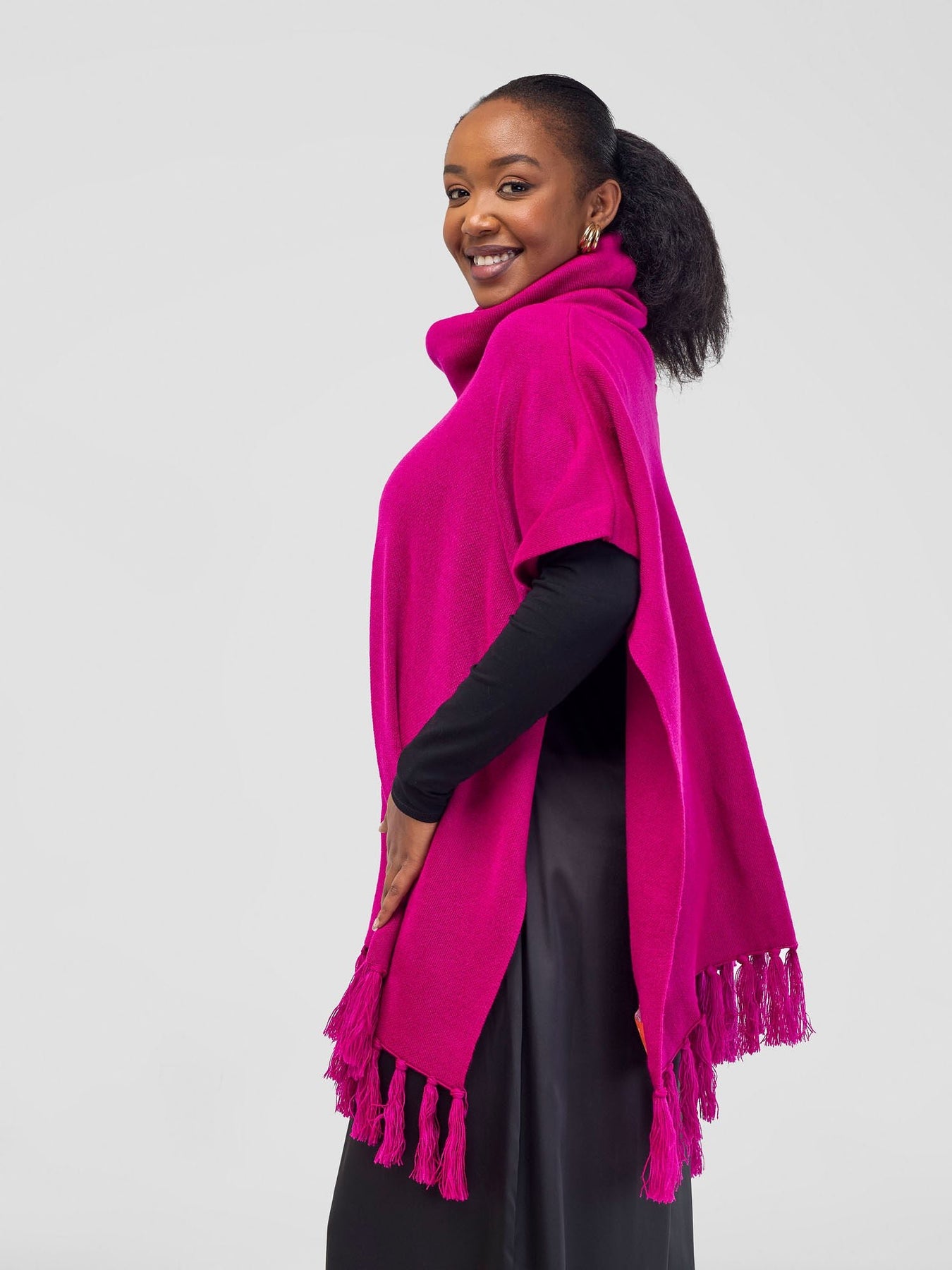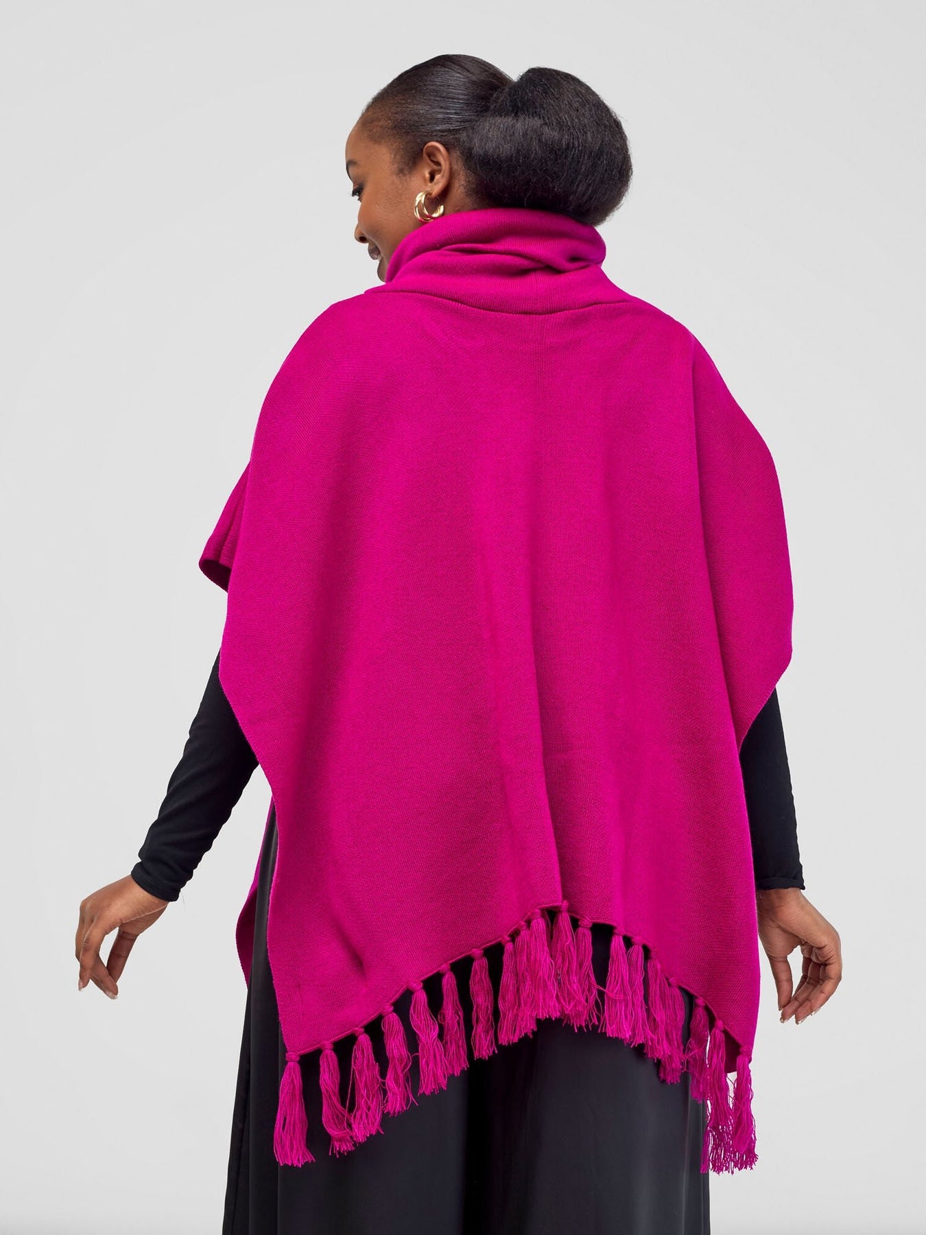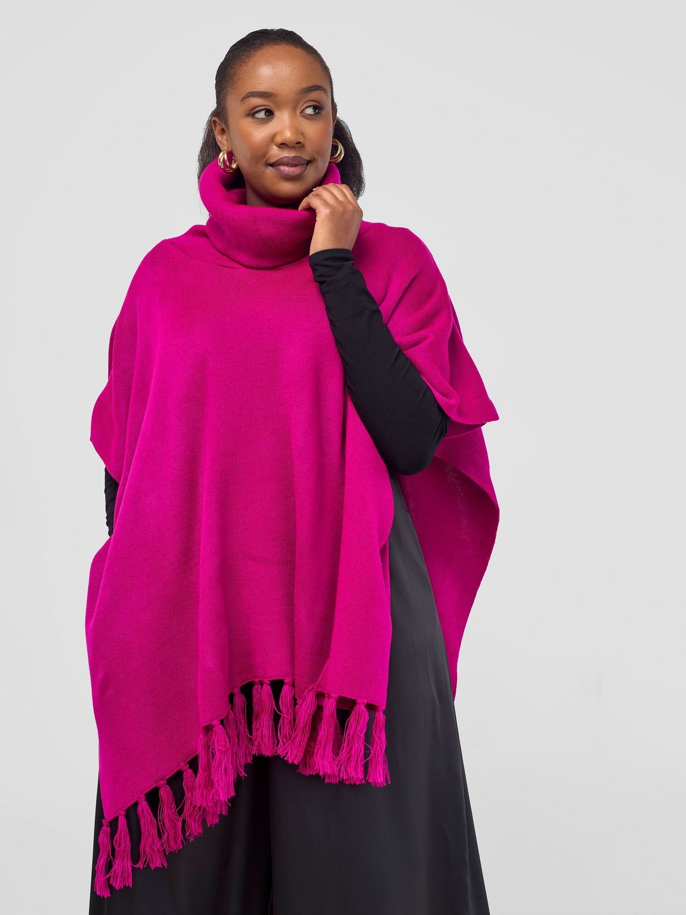 Vivo Turtleneck Knit Fringe Poncho - Fuchsia