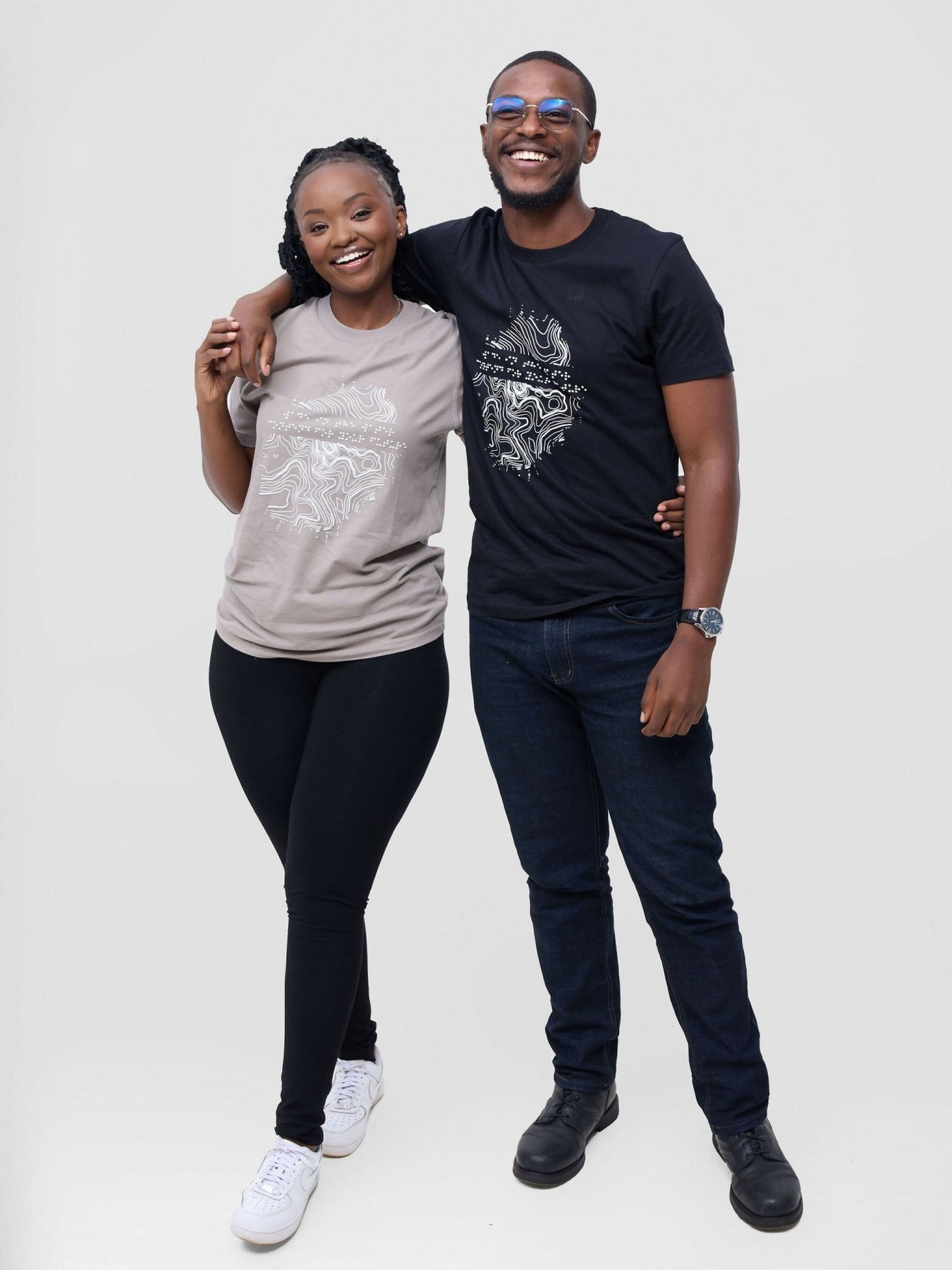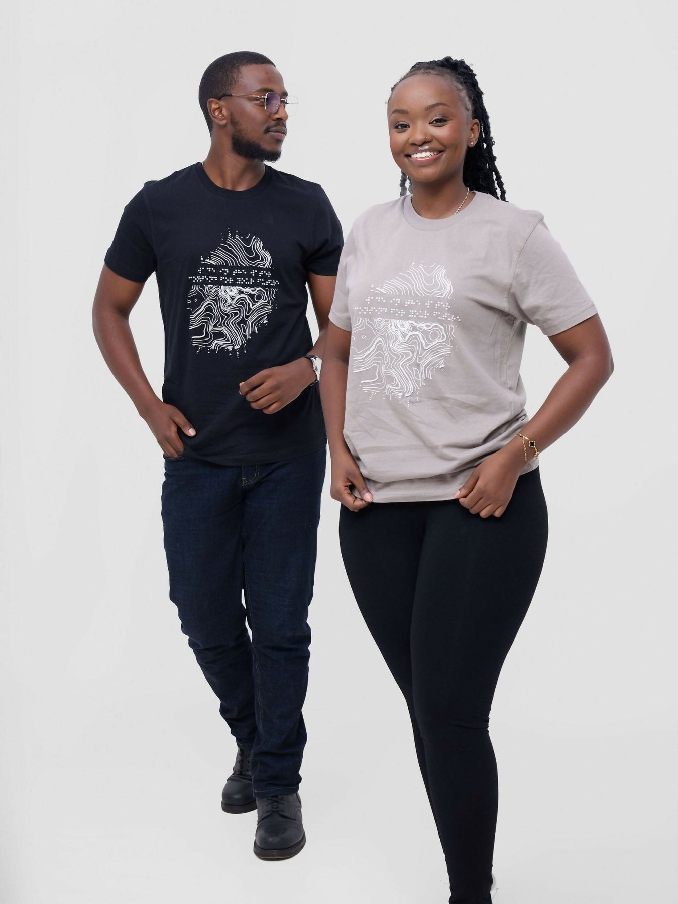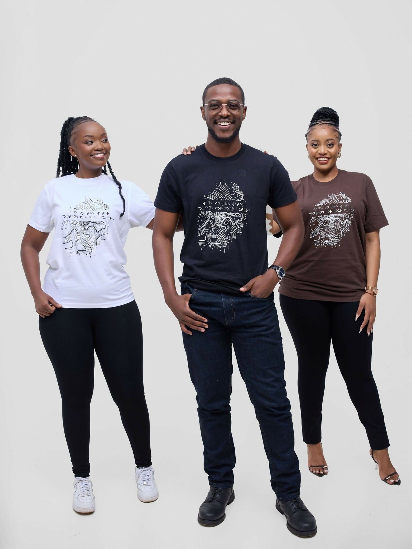 The inclusively designed t-shirt features a tactile frontal print is a thumb print shaped cut of the Kirima print-Mt. Kenya geographical contour lines- developed from our 2019/2020 2THUKU0 collection. The braille text reads; Wade in the water - Contend for your future.