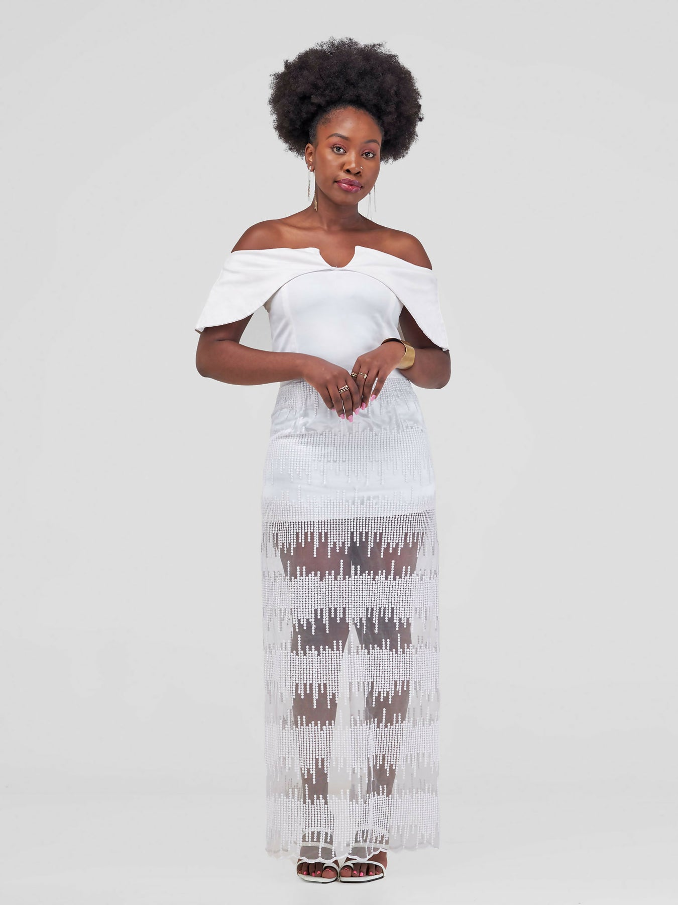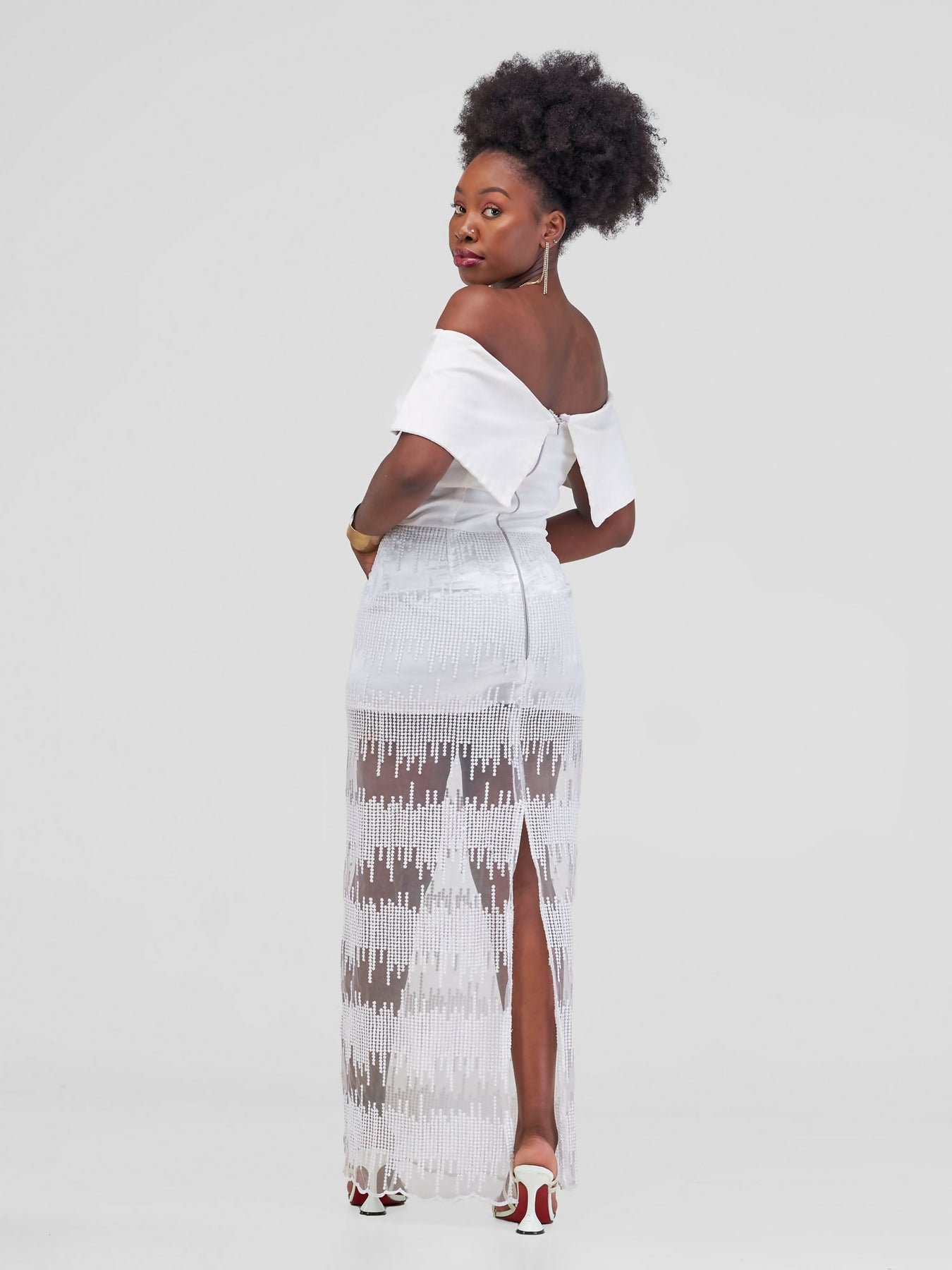 Our off shoulder white long elegant dress has a graceful, flowing silhouette that exudes sophistication and simplicity. The fabric is light and luxurious, allowing the dress to drape smoothly over the body.