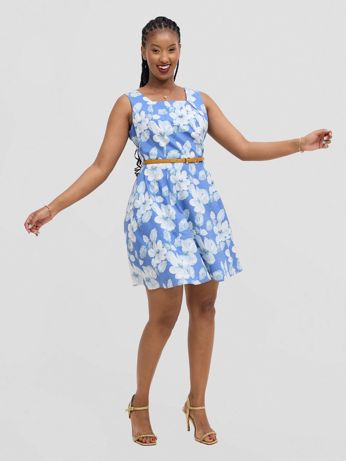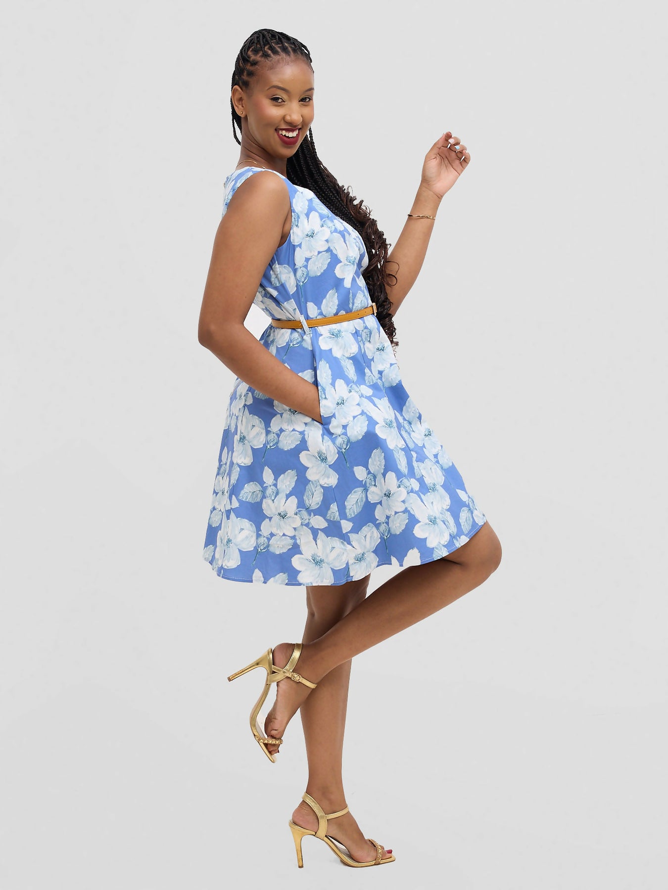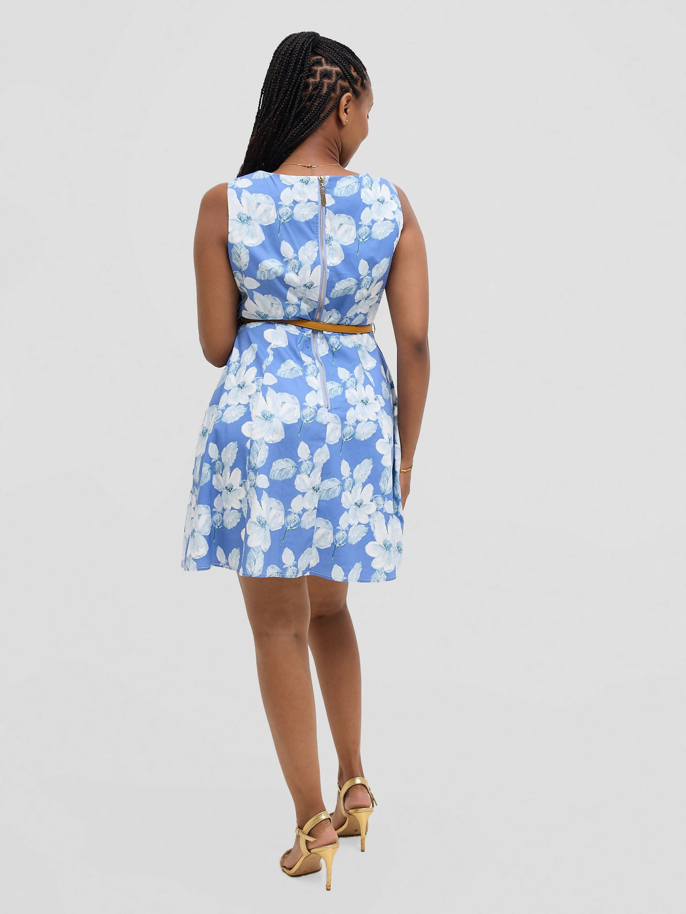 The Fashion Frenzy Belted Floral Skater Dress - Blue - Shopzetu
