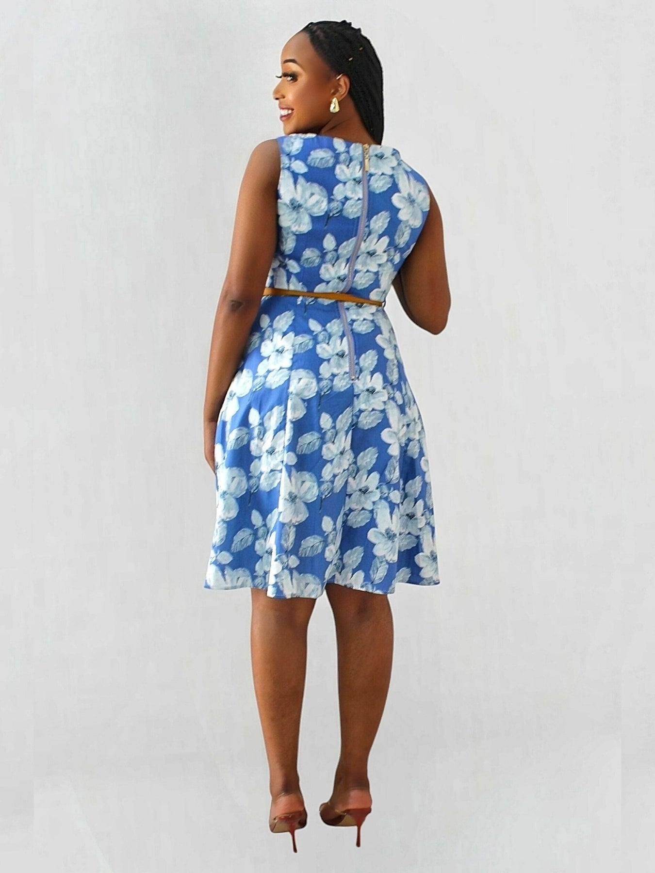 The Fashion Frenzy Belted Floral Skater Dress - Blue / White - Shopzetu