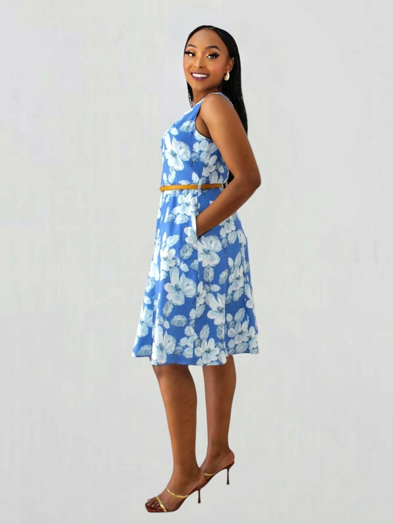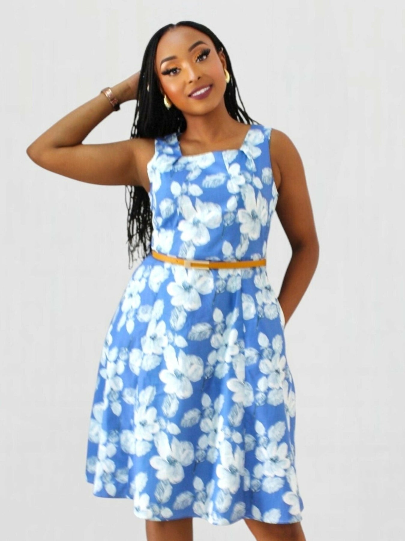 Elegant and playful, this yellow floral belted skater dress is a must-have for any wardrobe. Featuring a flattering fit-and-flare silhouette with a matching belt to accentuate the waist, it offers the perfect blend of comfort and style. The vibrant floral print adds a fresh, feminine touch, making it ideal for both casual outings and special occasions. Model wears size S.