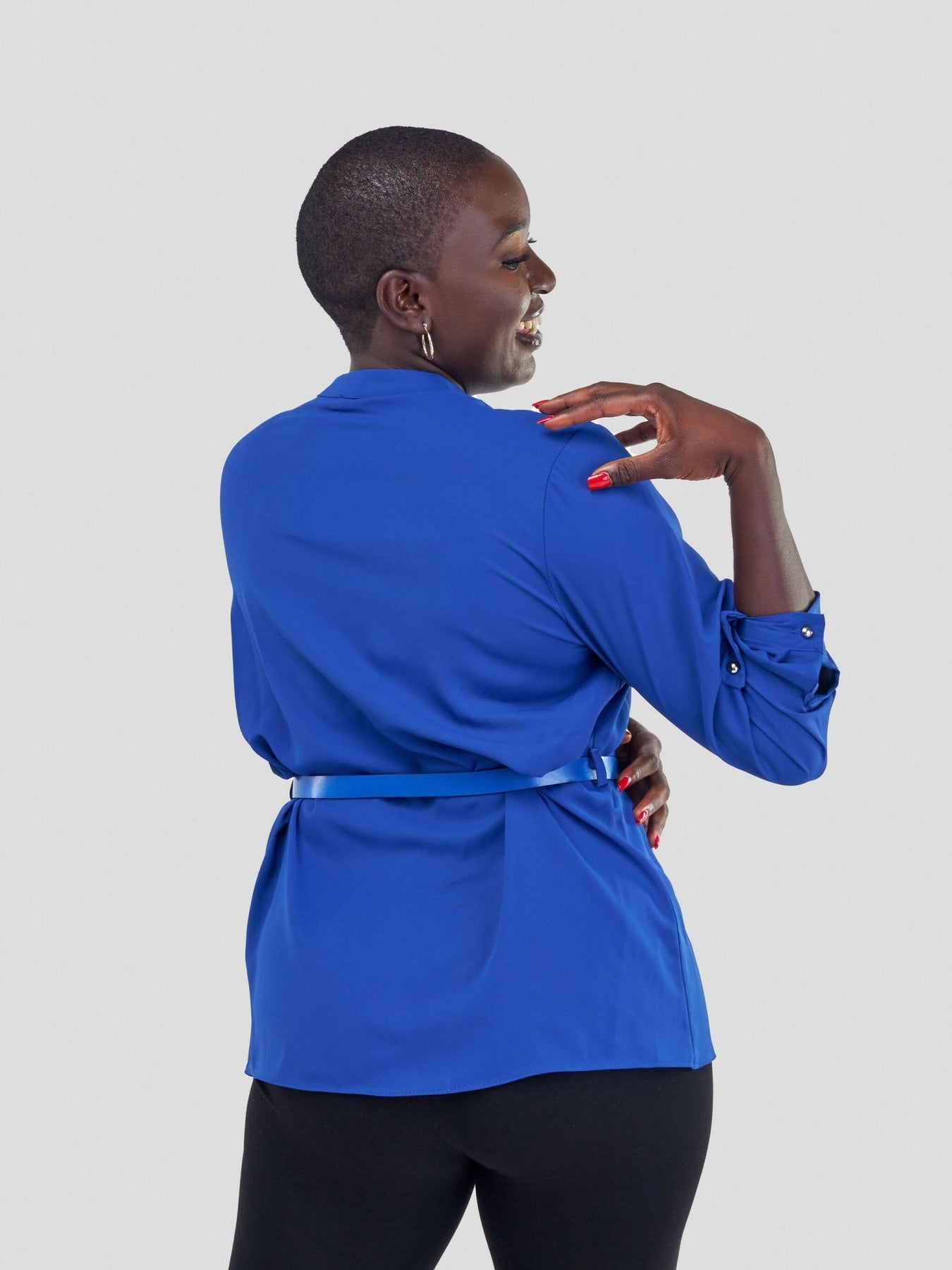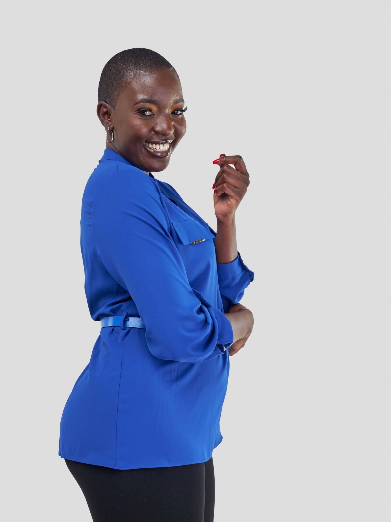 The Fashion Frenzy Belted Mock Pocket Long Sleeve Blouse - Blue - Shopzetu