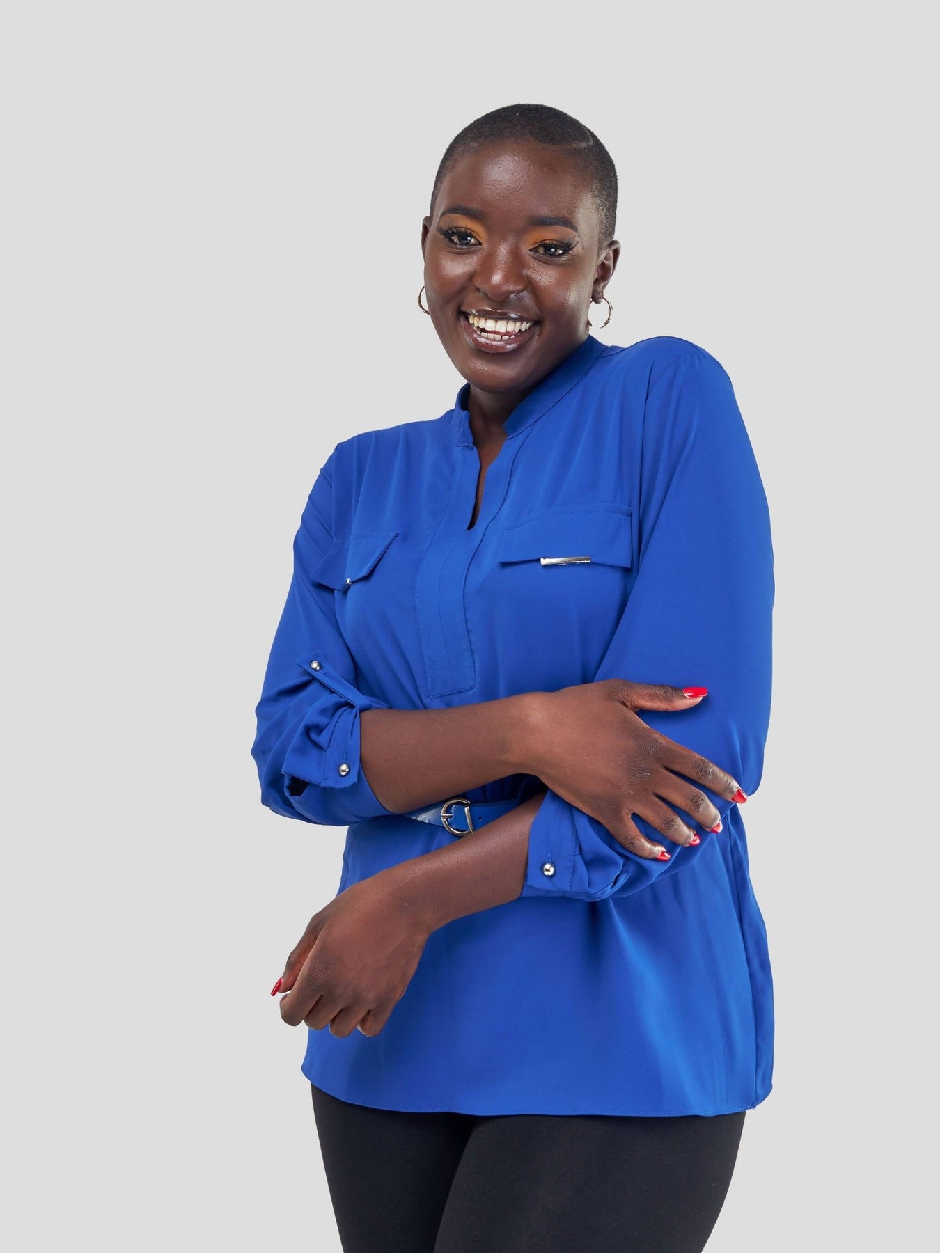 Introducing our Blue Mock Pocket Long Sleeve Blouse — a perfect fusion of timeless elegance and modern sophistication. The rich blue hue adds a touch of refinement, while the mock pocket detailing exudes contemporary charm. The included belt cinches at the waist, ensuring a flattering silhouette that effortlessly transitions from professional to casually chic. With long sleeves for added grace, this blouse is a versatile wardrobe essential. Elevate your style with this exquisite piece, designed to seamlessly blend comfort and sophistication in every setting.