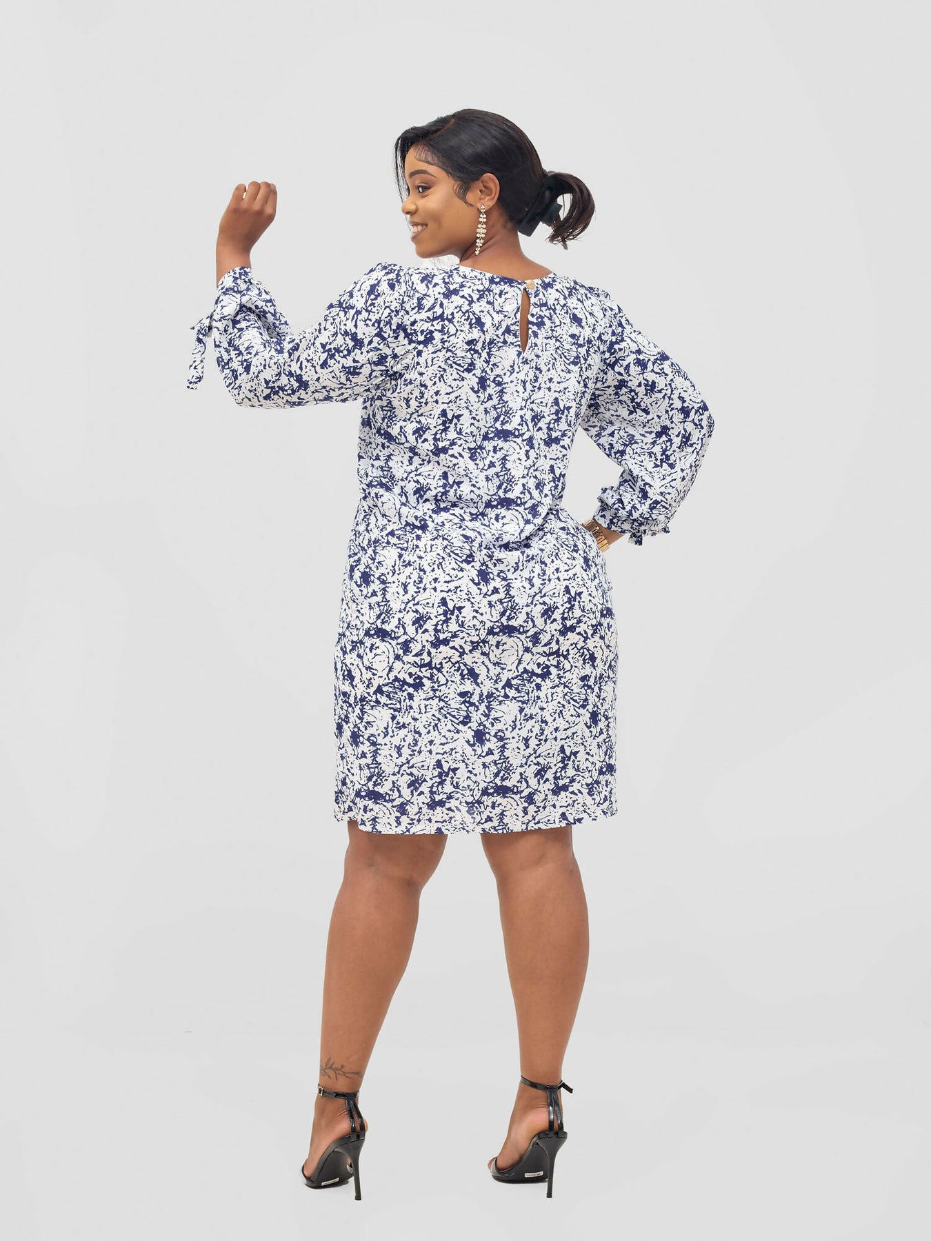The Fashion Frenzy White and Blue Printed Shift Dress - Navy Blue - Shopzetu