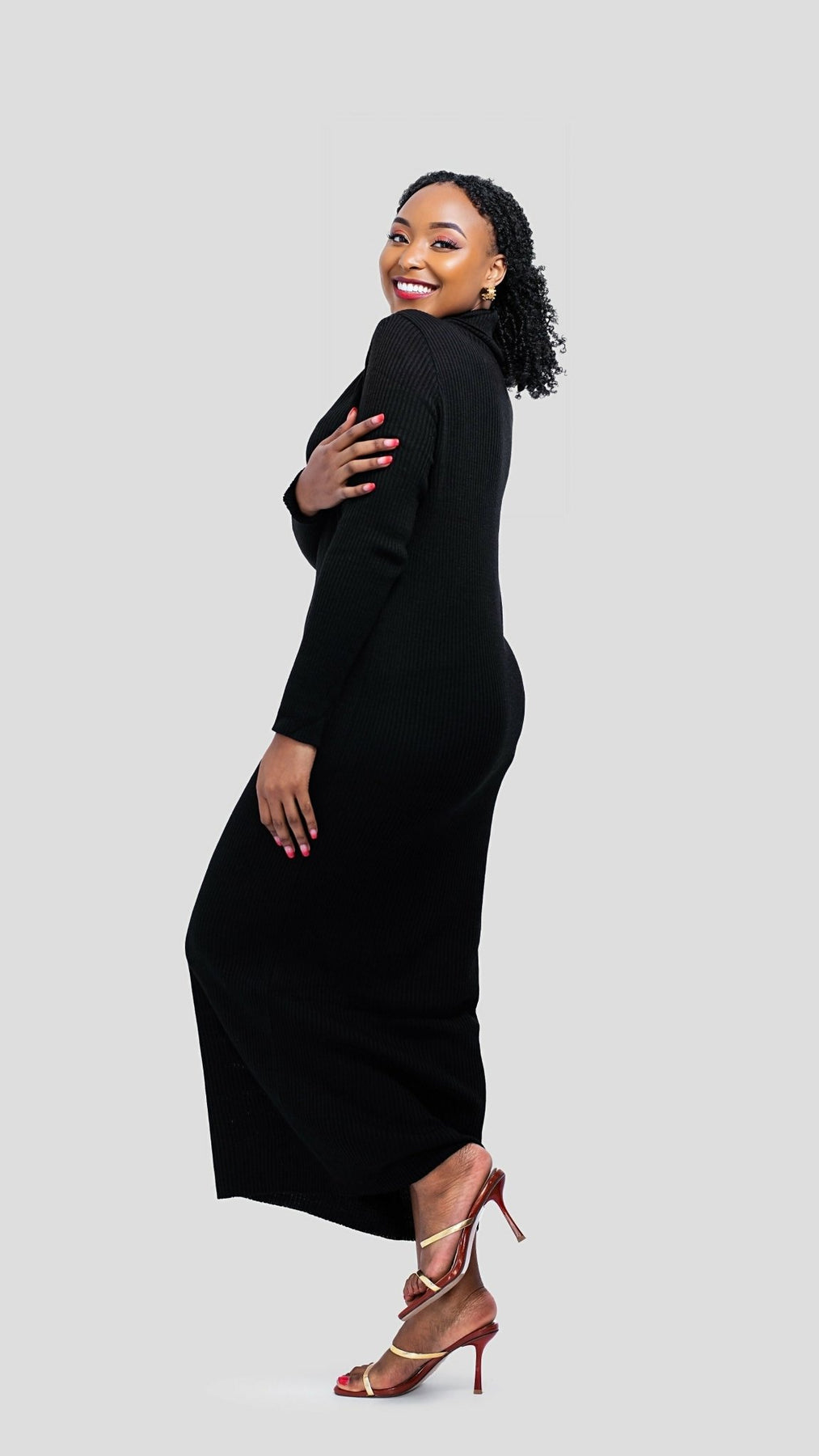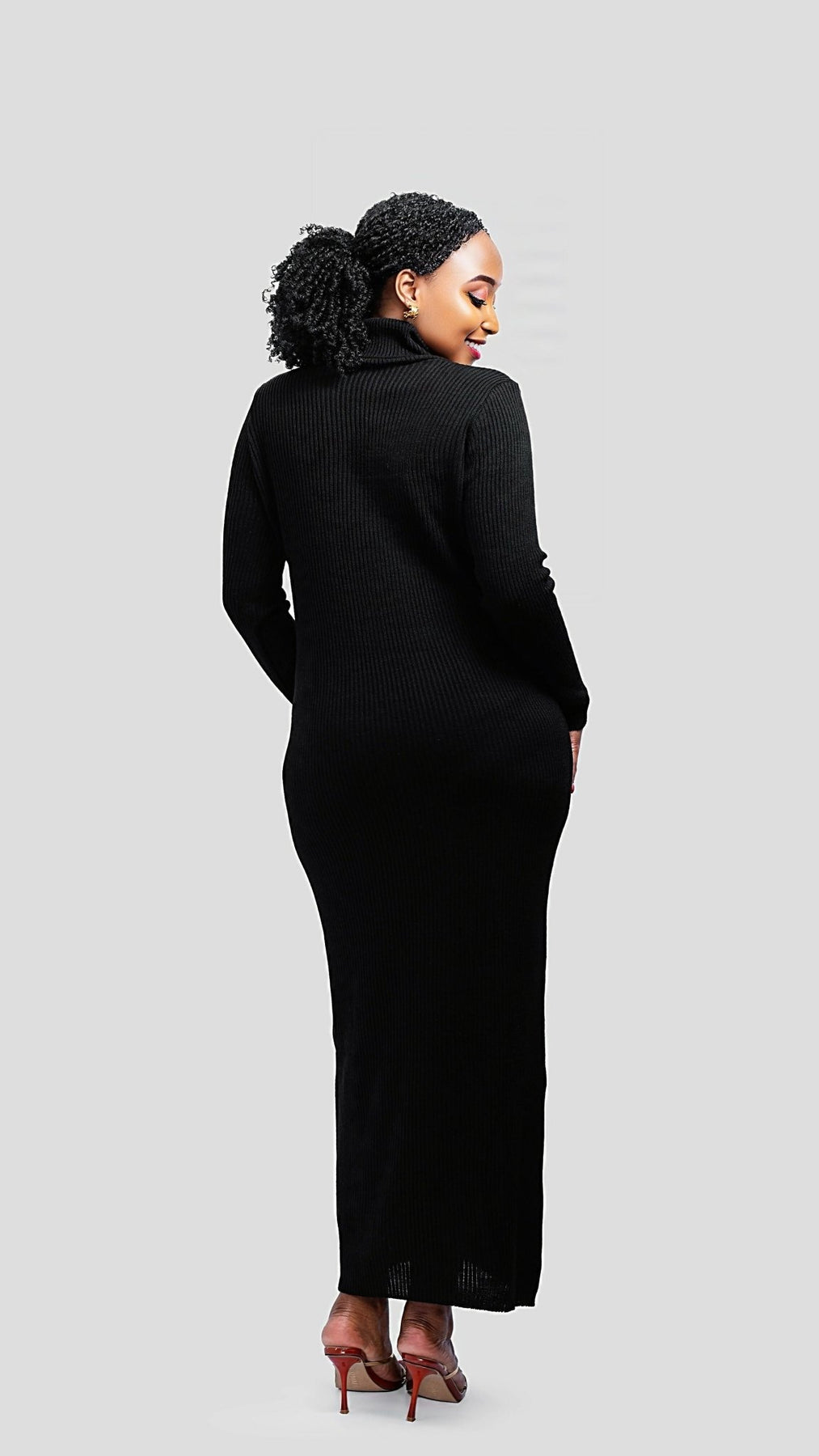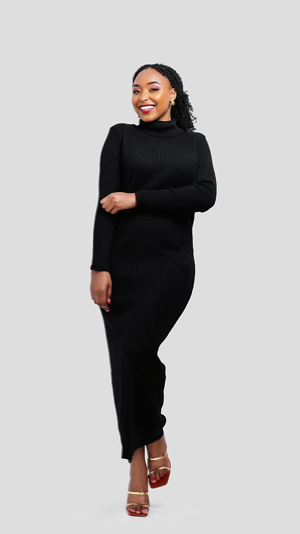 Classic. Sleek. Powerful. This black polo neck knit maxi dress is a wardrobe essential that blends comfort with confident style. Made from a soft, ribbed stretch knit, it features a figure-flattering bodycon fit and an elegant high neckline. Perfect for colder days or dressy evenings. Style it with ankle boots and a trench coat for a polished daytime look, or elevate it with heels and a bold lip for a night out.