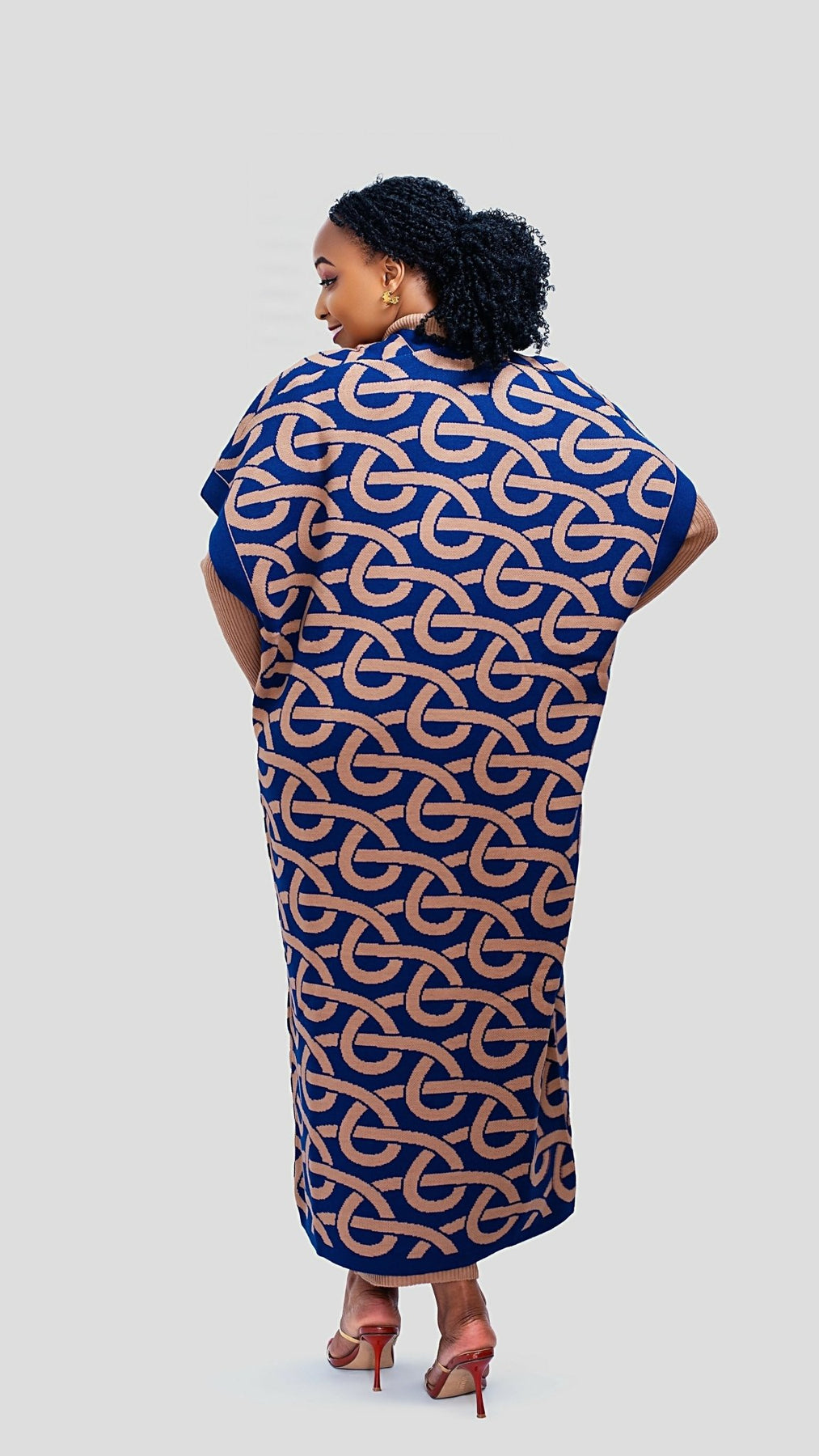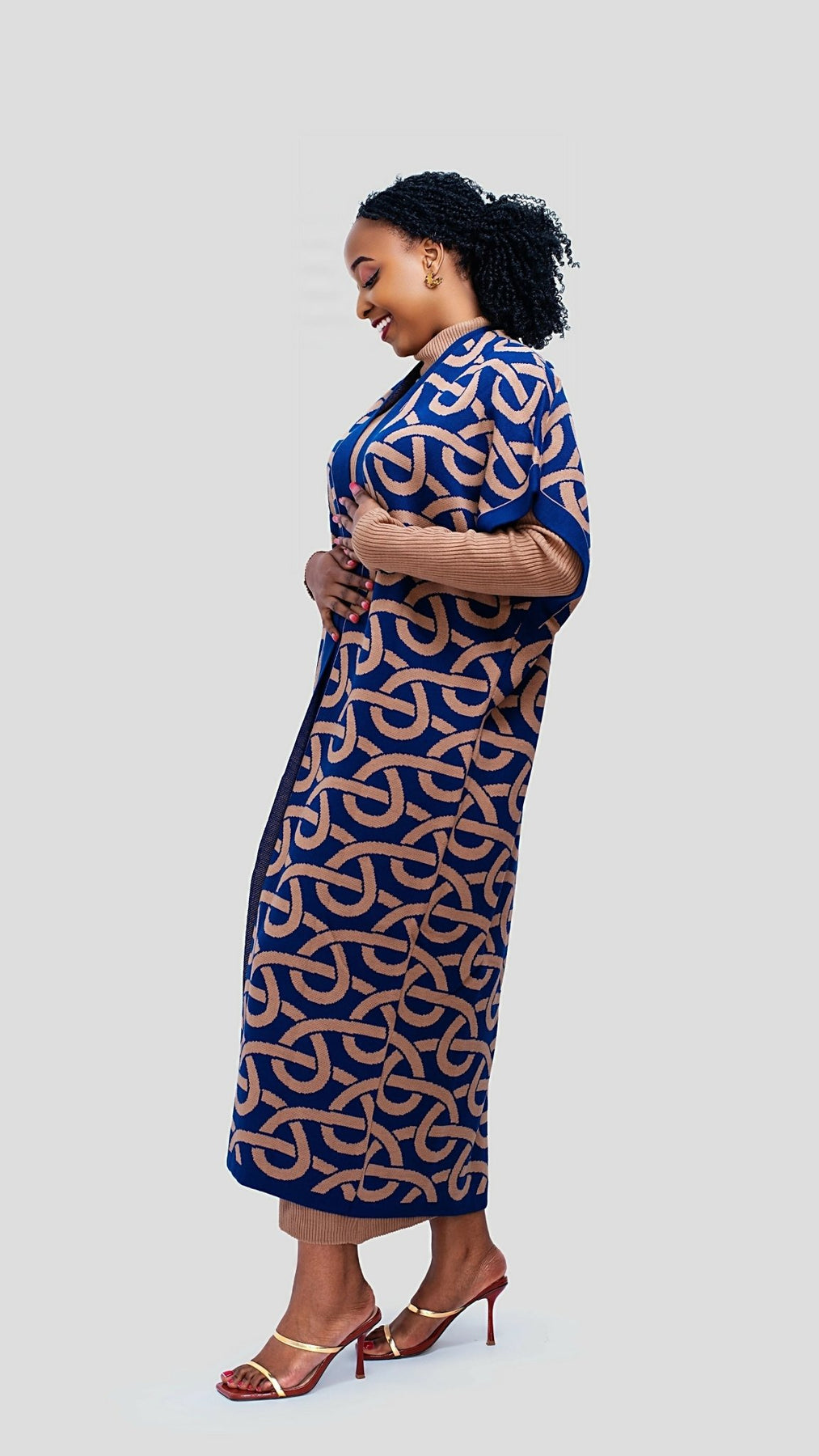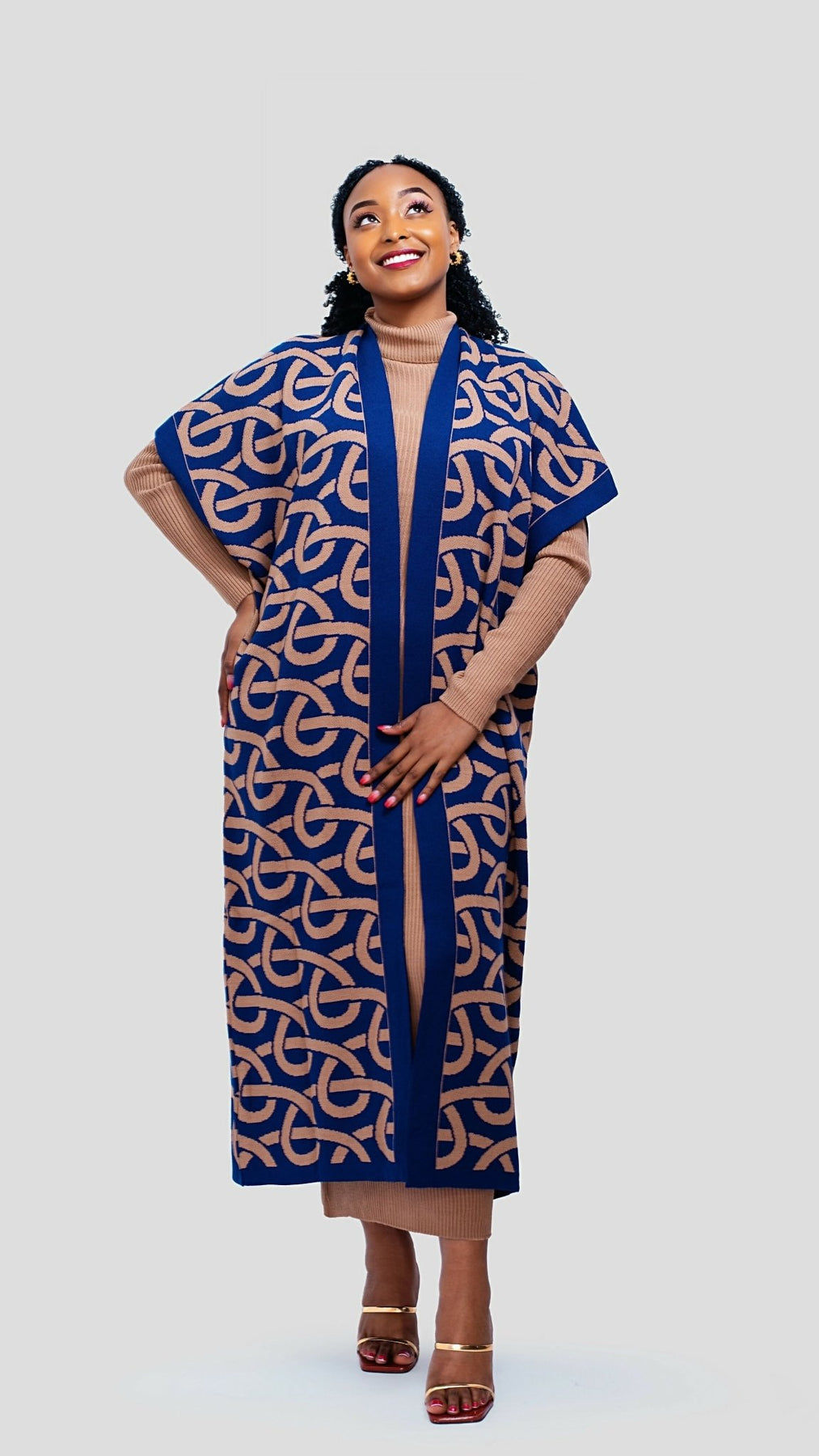 Wrap yourself in elegance with this Khaki and Blue knit kimono maxi. Designed in a flowing waterfall cut, it drapes beautifully over any outfit, adding warmth and effortless sophistication. The rich tones and soft knit texture make it a standout layering piece. Style it with tailored pants, classic jeans, or throw it over a bodycon dress to beat the cold while staying stylish. It's your go-to for cozy layering with a fashionable twist.