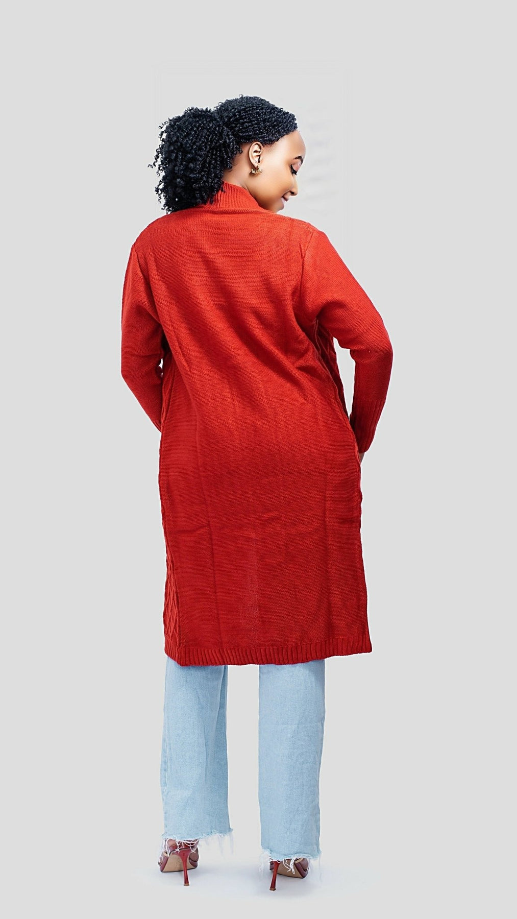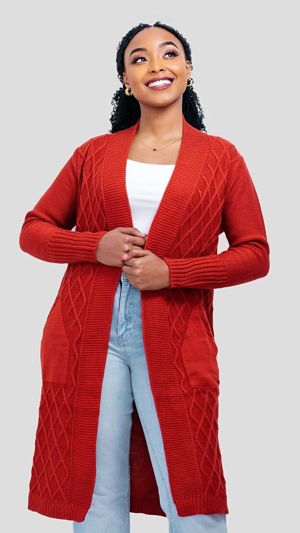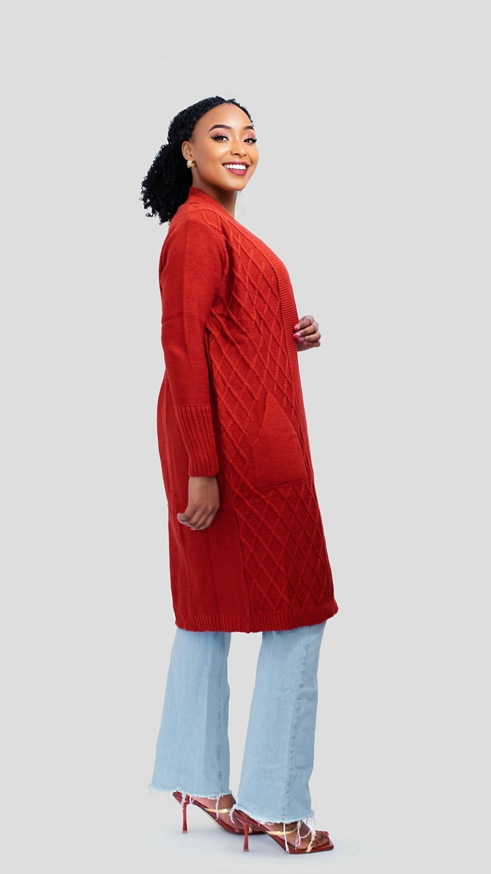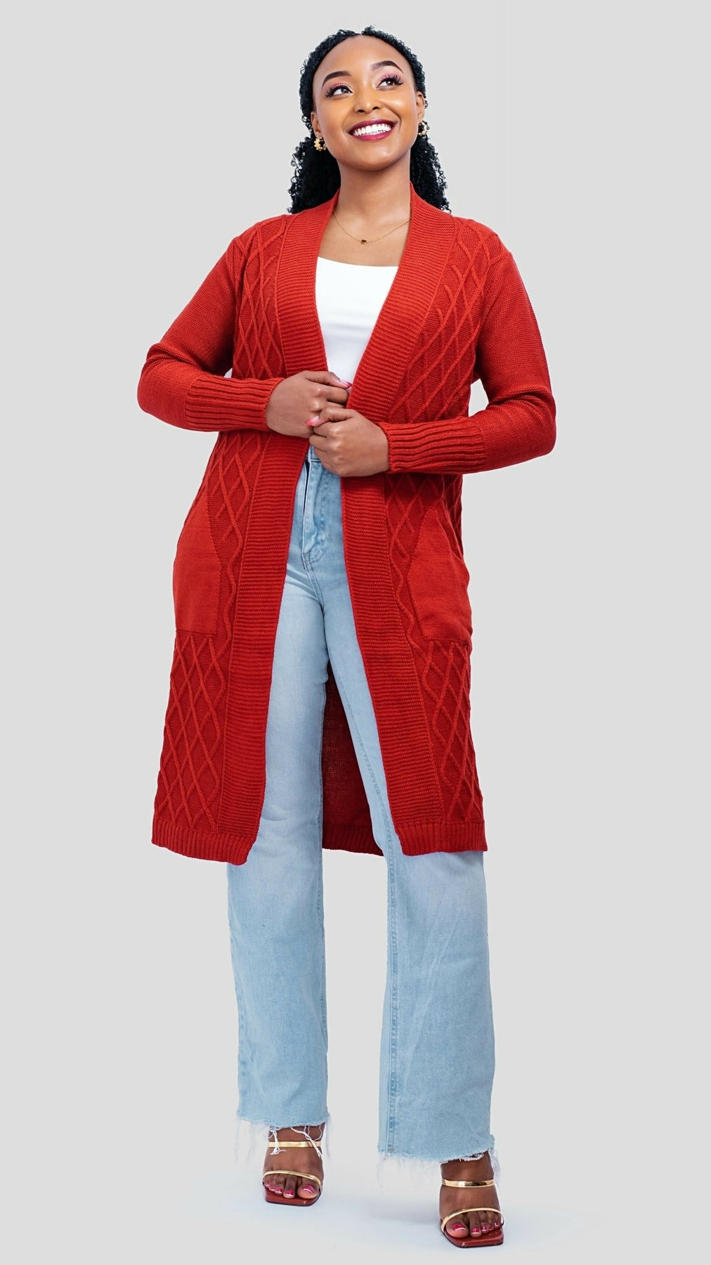 Wrap up in rich warmth with this burnt orange knit waterfall cardigan. Designed in a flattering midi length with long sleeves, it flows effortlessly over any outfit, adding both comfort and elegance. The soft knit fabric and open-front waterfall cut make it the perfect layering piece. Style it over a fitted dress, wide-leg pants, or jeans to instantly elevate your look with a pop of autumn-inspired color.