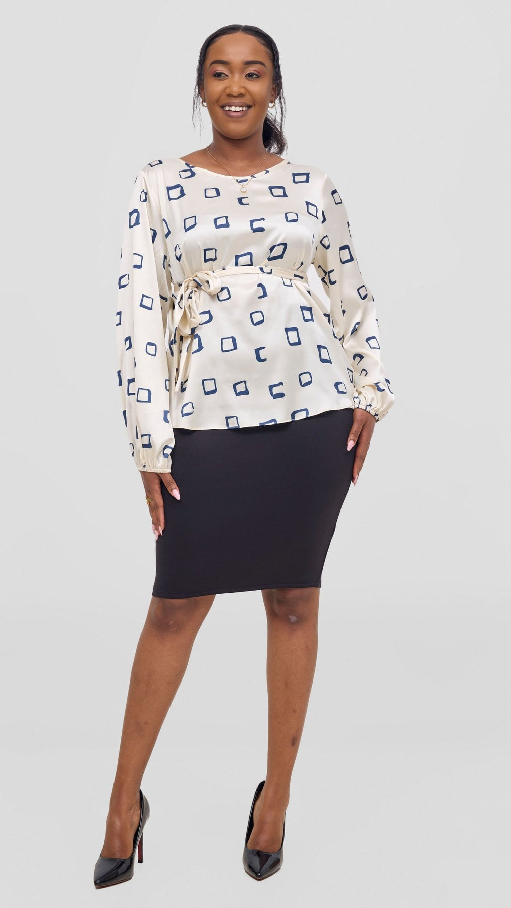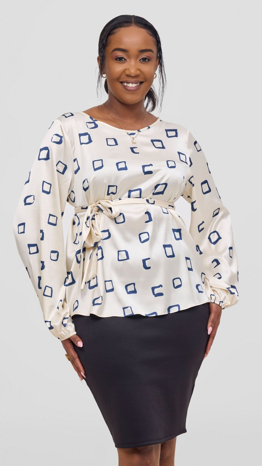 The Vivo Basic Satin Bishop Sleeve Top in Off white with Navy Nita Print offers a graceful blend of style and comfort. Crafted from smooth satin, its bishop sleeves add volume and drama, while the subtle contrast of sea green and navy print provides a chic, sophisticated look suitable for both office wear and elegant outings.