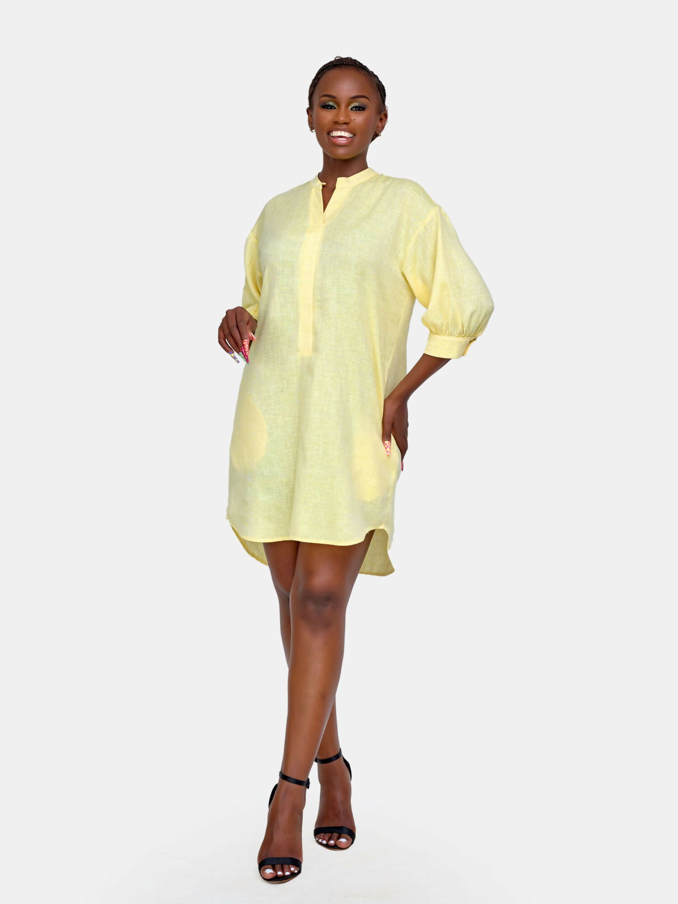 Product Details: Get ready to make a statement with our Nuru Shirt Dress featuring a high-low silhouette and 3/4 Balloon sleeves with cuffs. The 1 button detail at the cuffs adds a touch of playfulness to this must-have piece.