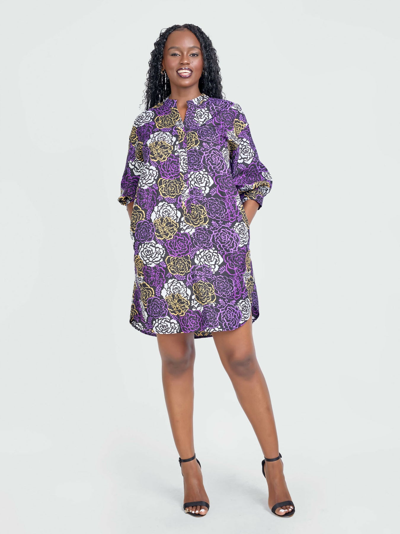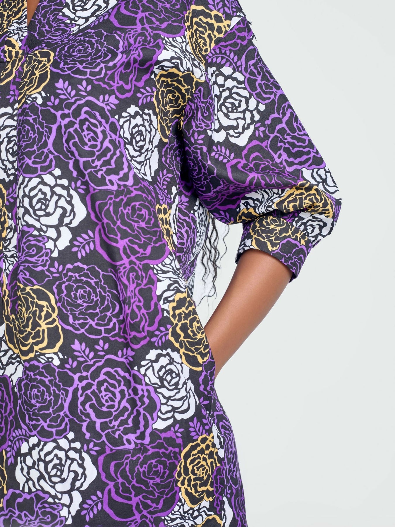 Product Details: Get ready to make a statement with our Nuru Shirt Dress featuring a high-low silhouette and 3/4 Balloon sleeves with cuffs. The 1 button detail at the cuffs adds a touch of playfulness to this must-have piece.