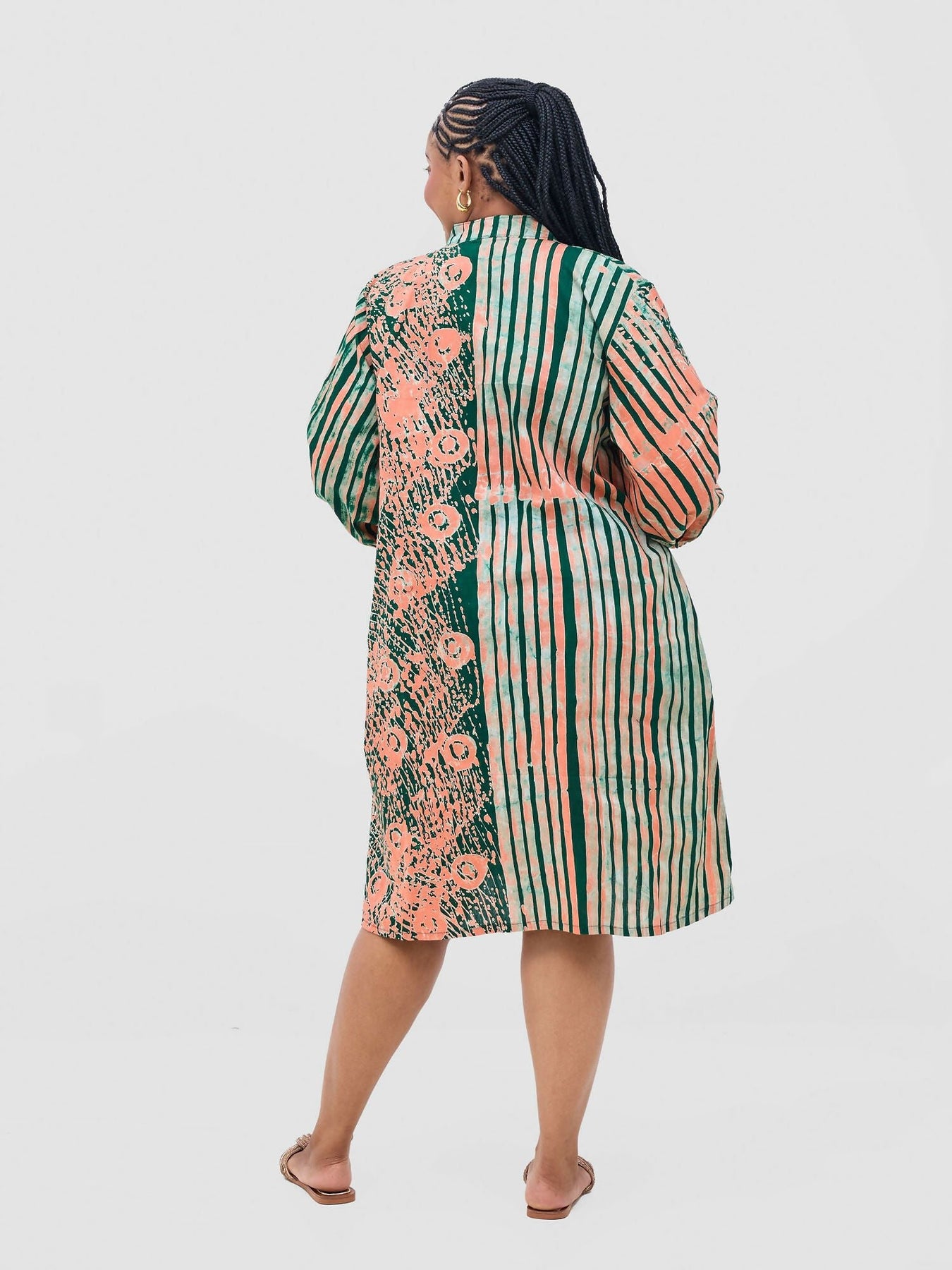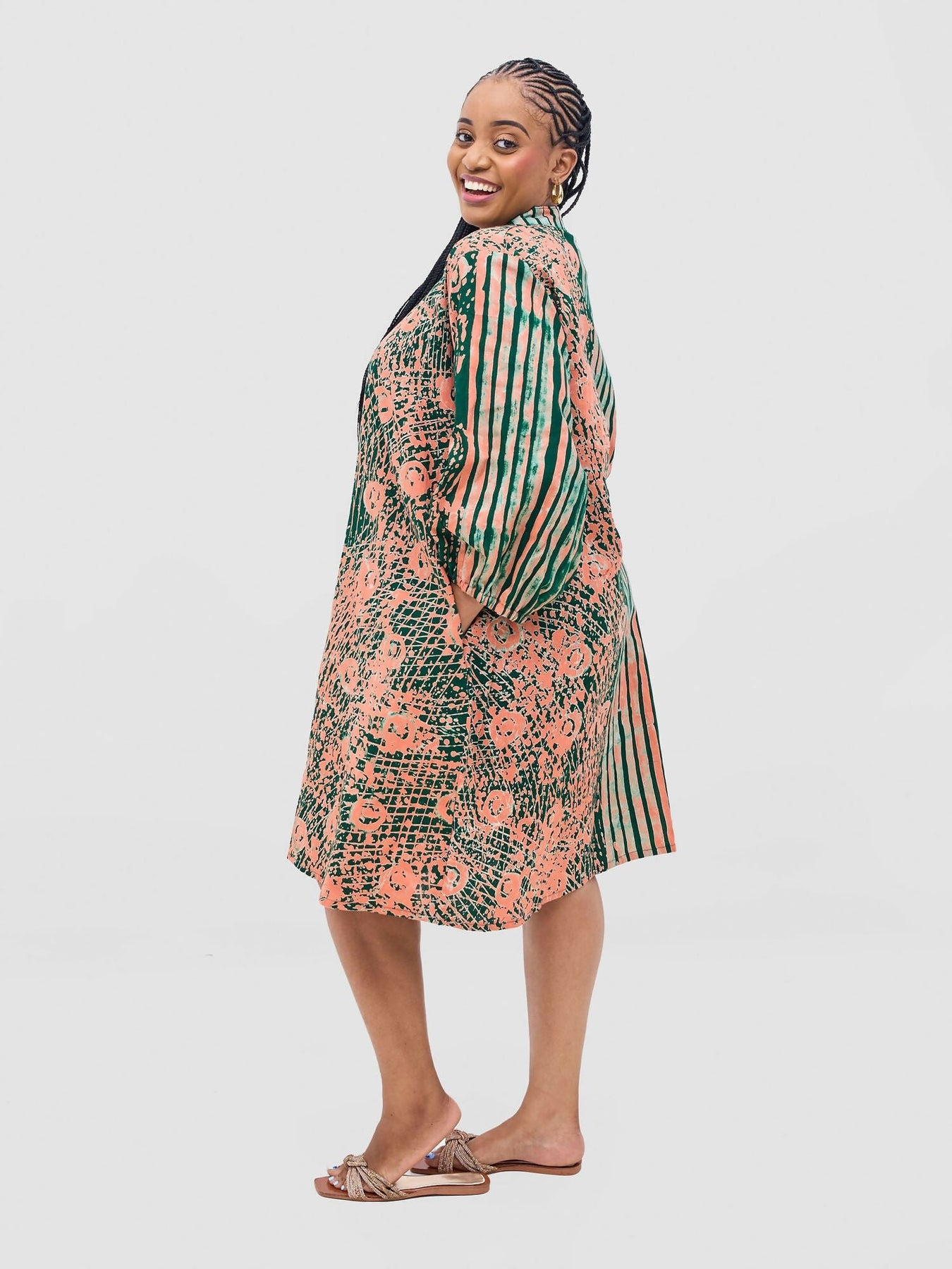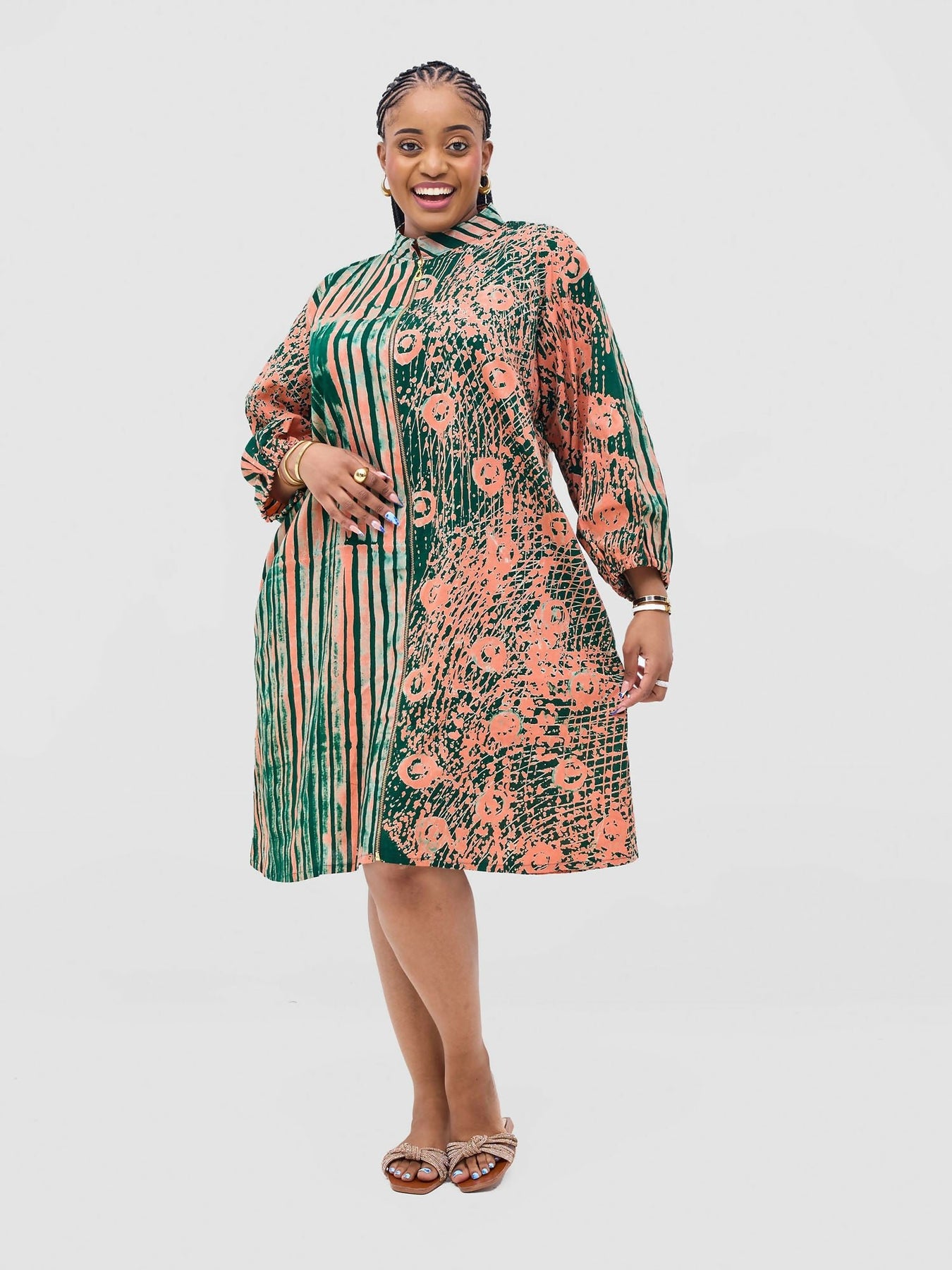 Zinduka Zipper Dress – A trendy and edgy knee-length dress that makes a statement with its bold Batik fabric. Designed for both style and comfort, it features a front zipper for a modern touch, elegant bell sleeves for added flair, and a flattering silhouette that suits any occasion.