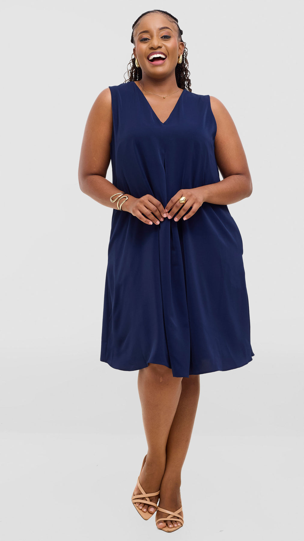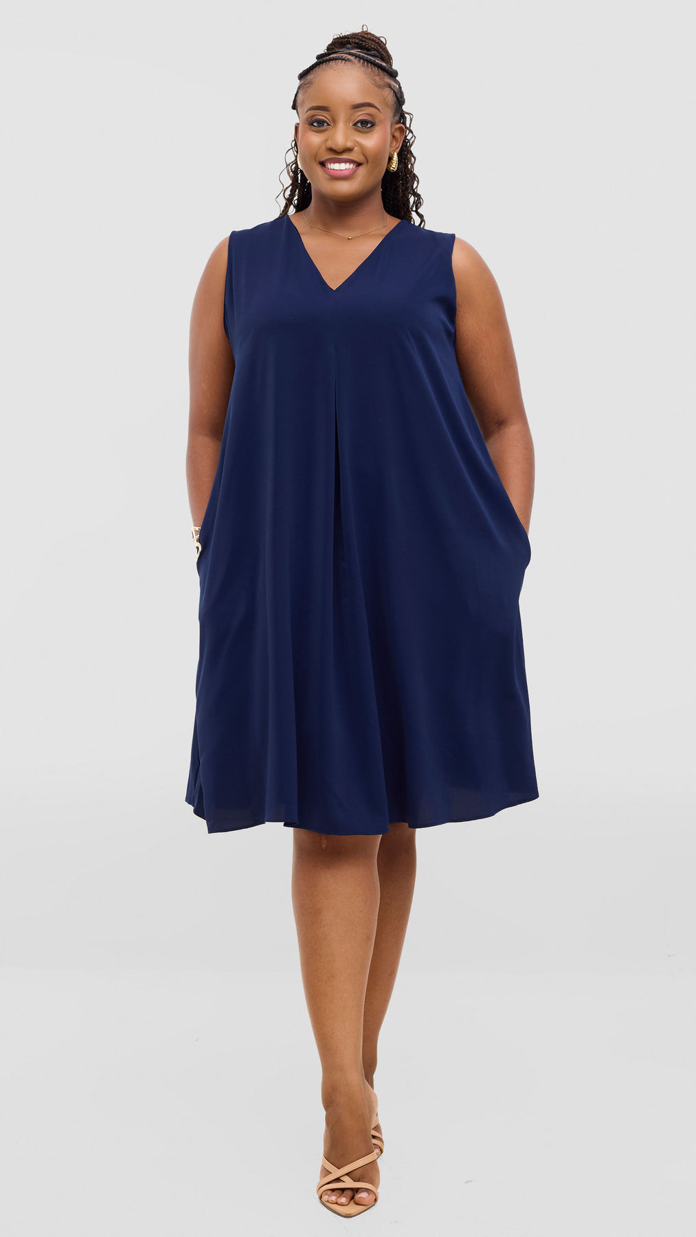 Elevate your everyday wardrobe with the Vivo Ava Front Pleat Knee Length Dress in Navy Crepe. This versatile piece features elegant front pleats that add dimension and movement, while the knee-length cut offers a flattering, timeless silhouette. Crafted from quality crepe fabric, it drapes beautifully and provides comfortable wear throughout the day. Perfect for the office, casual outings, or dressed up for special occasions, this dress is a reliable staple that works hard in your closet. Effortlessly chic and endlessly wearable.