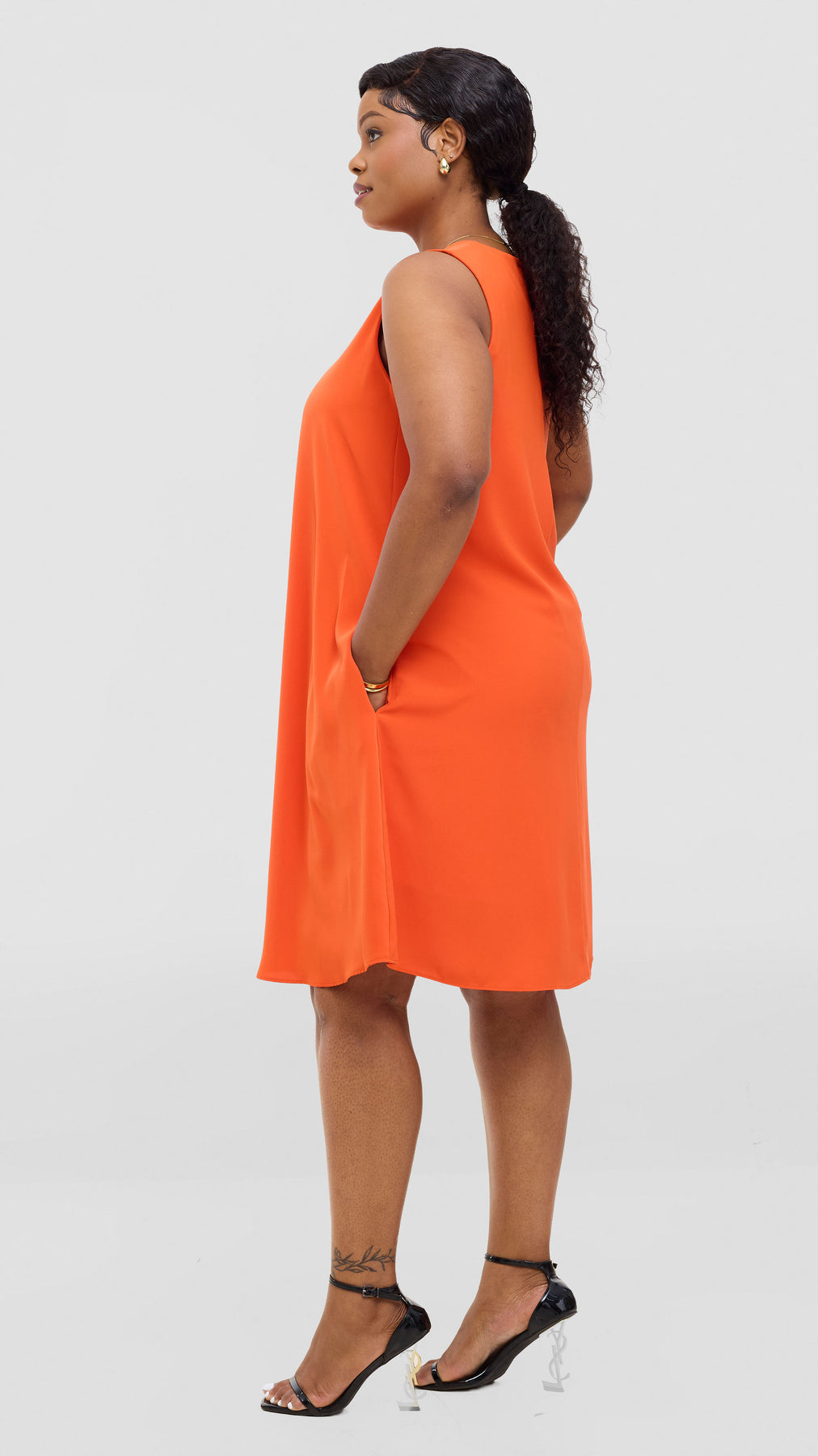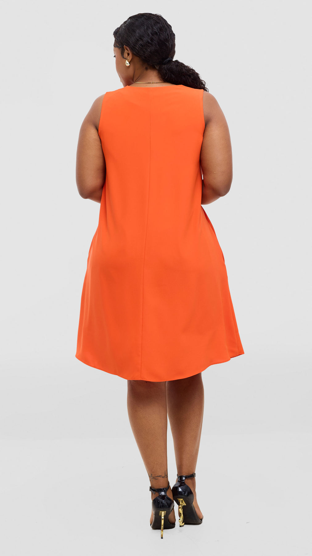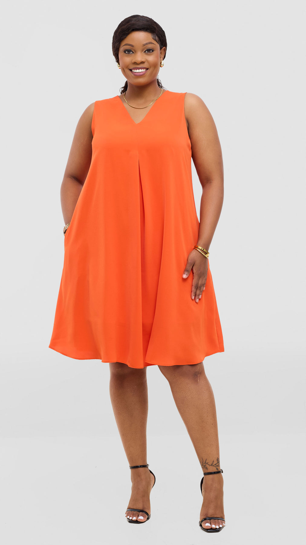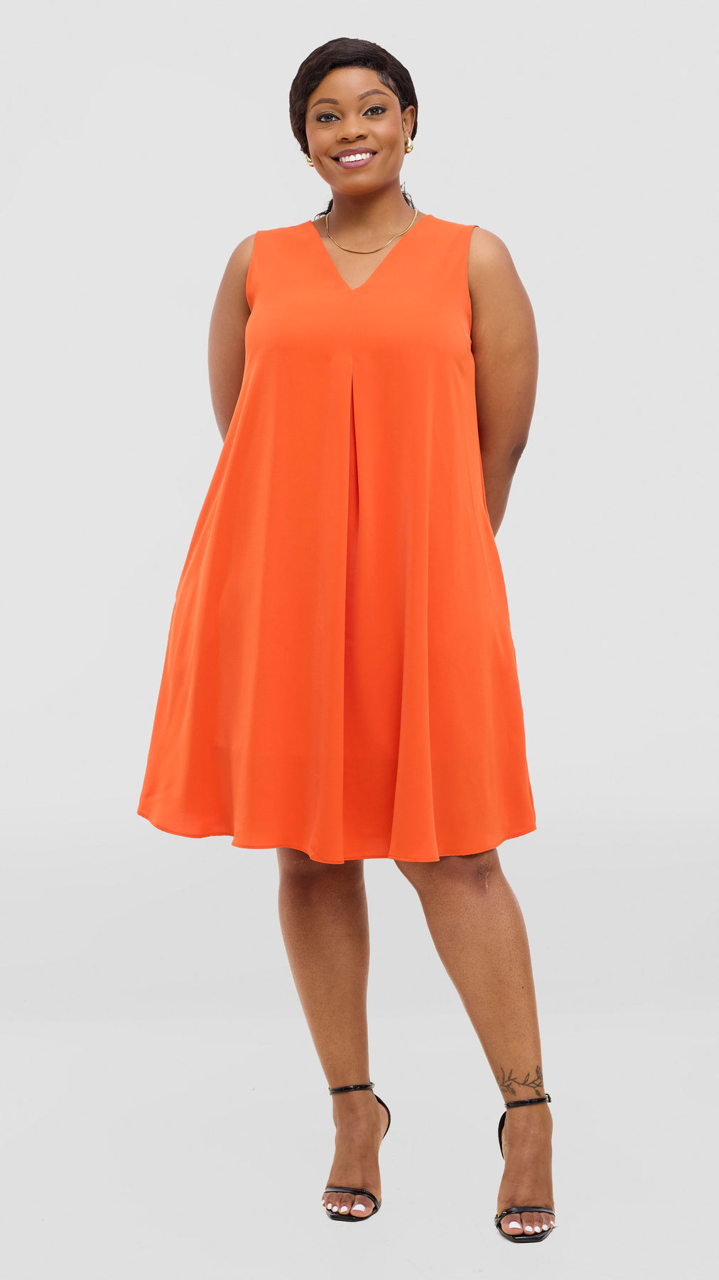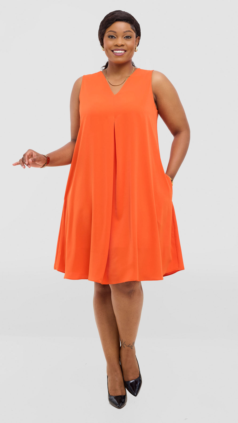Elevate your everyday wardrobe with the Vivo Ava Front Pleat Knee Length Dress in Orange Crepe. This versatile piece features elegant front pleats that add dimension and movement, while the knee-length cut offers a flattering, timeless silhouette. Crafted from quality crepe fabric, it drapes beautifully and provides comfortable wear throughout the day. Perfect for the office, casual outings, or dressed up for special occasions, this dress is a reliable staple that works hard in your closet. Effortlessly chic and endlessly wearable.