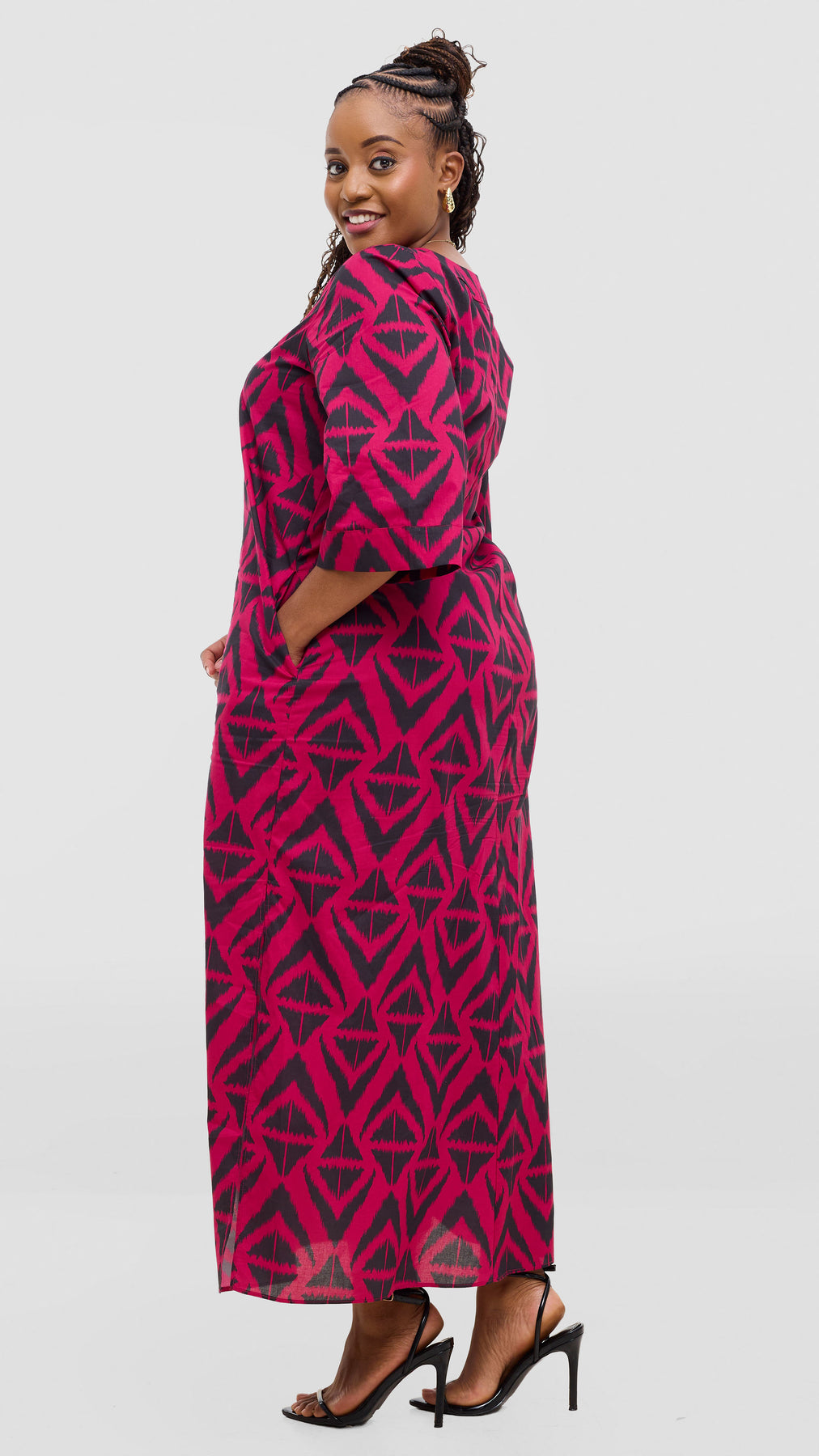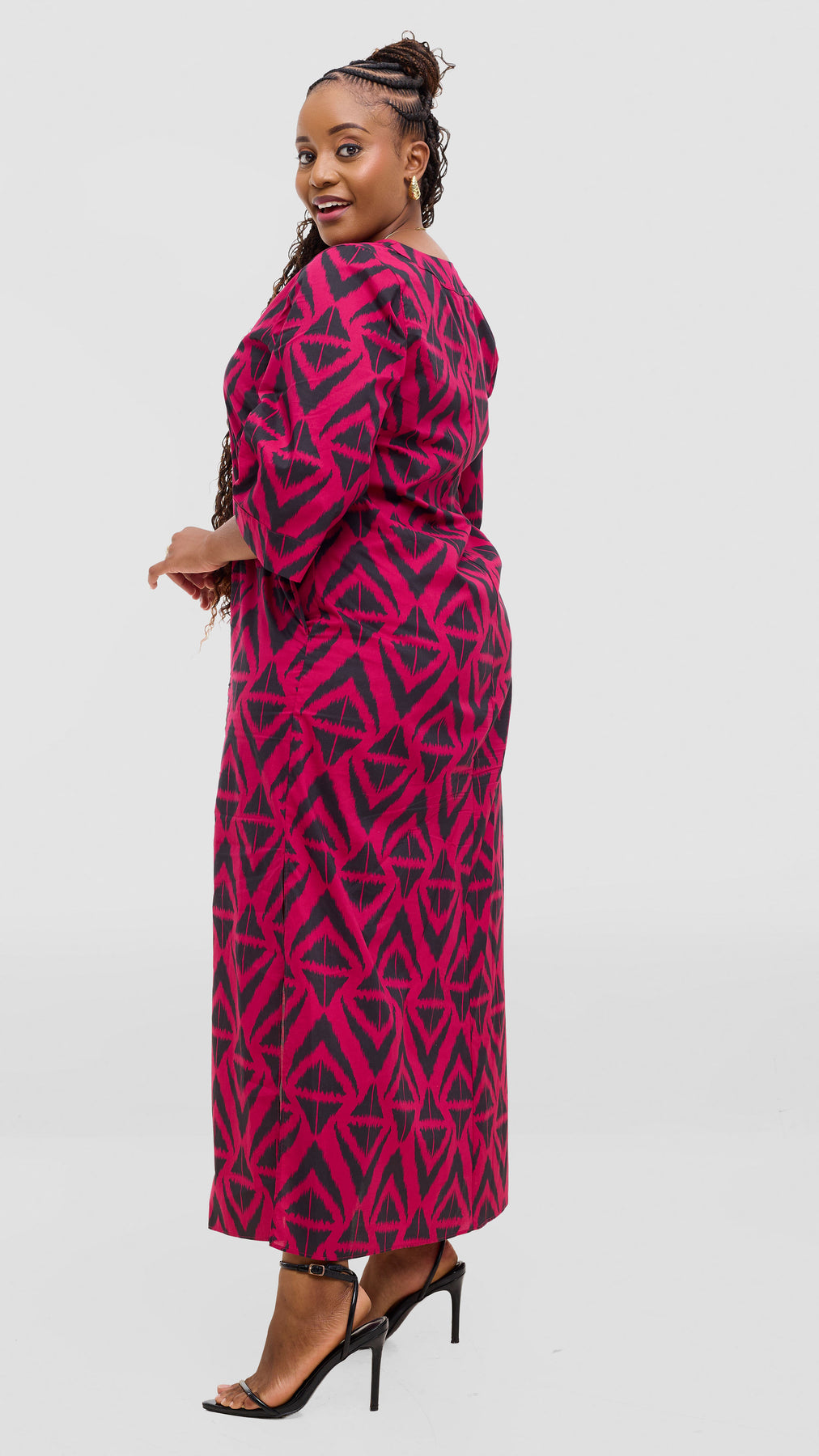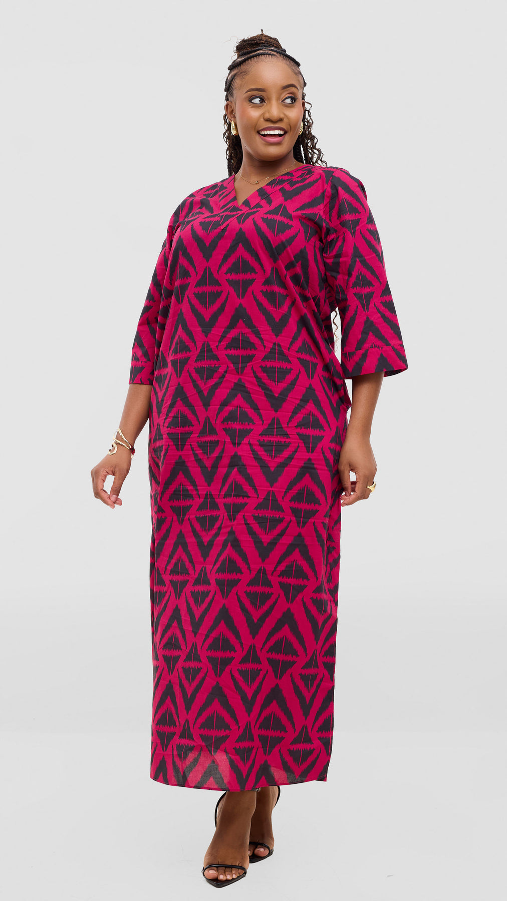 Introducing the Vivo Lulu 3/4 Sleeve Maxi Kaftan—a beautifully balanced blend of comfort and contemporary style. With its graceful, unstructured silhouette and three-quarter sleeves, this piece offers an effortlessly sophisticated aesthetic that works for any occasion. The bold fuschia and black print makes a confident statement, adding depth and personality to your ensemble. Ideal for warm weather wear or layering, this kaftan moves with your body and your lifestyle—from casual brunches to intimate gatherings to peaceful downtime. The relaxed fit ensures you feel supported and at ease all day long, making it the kind of versatile essential