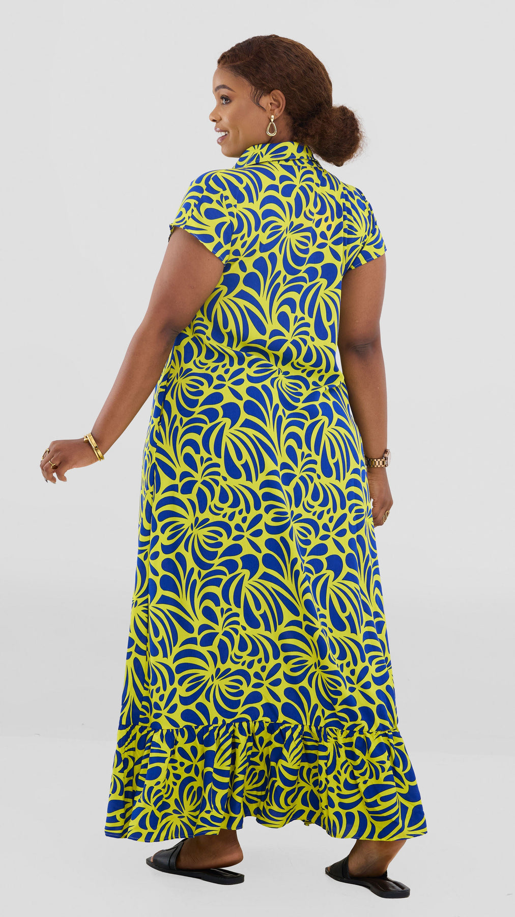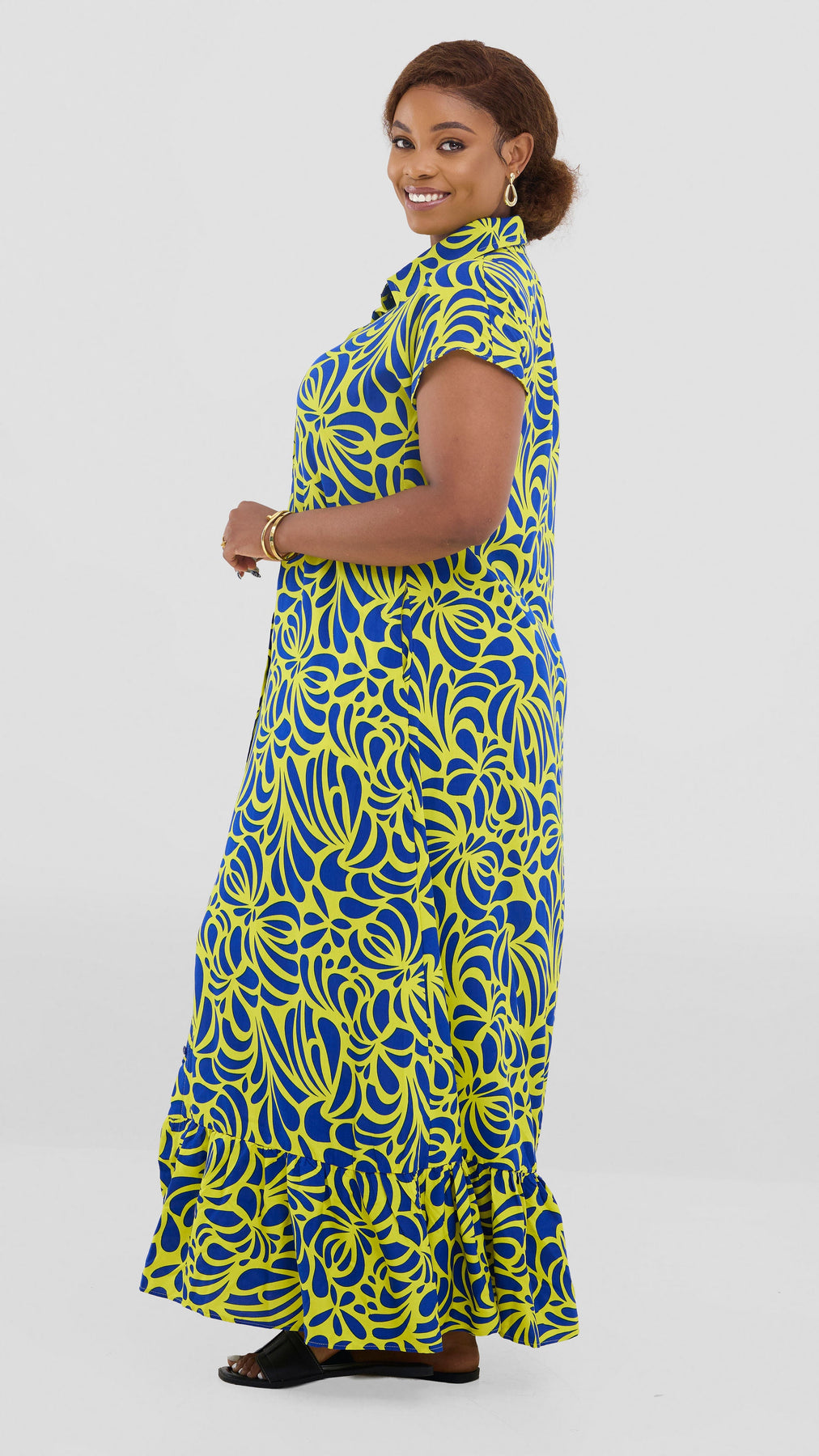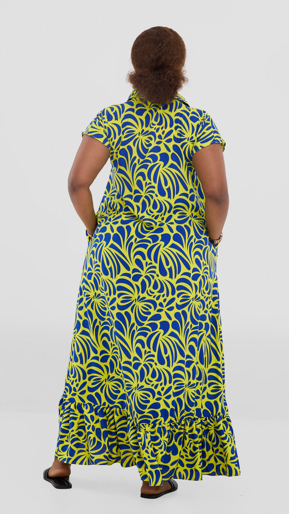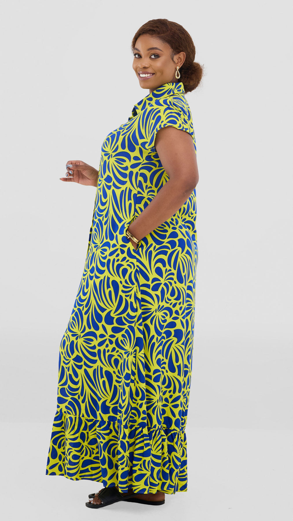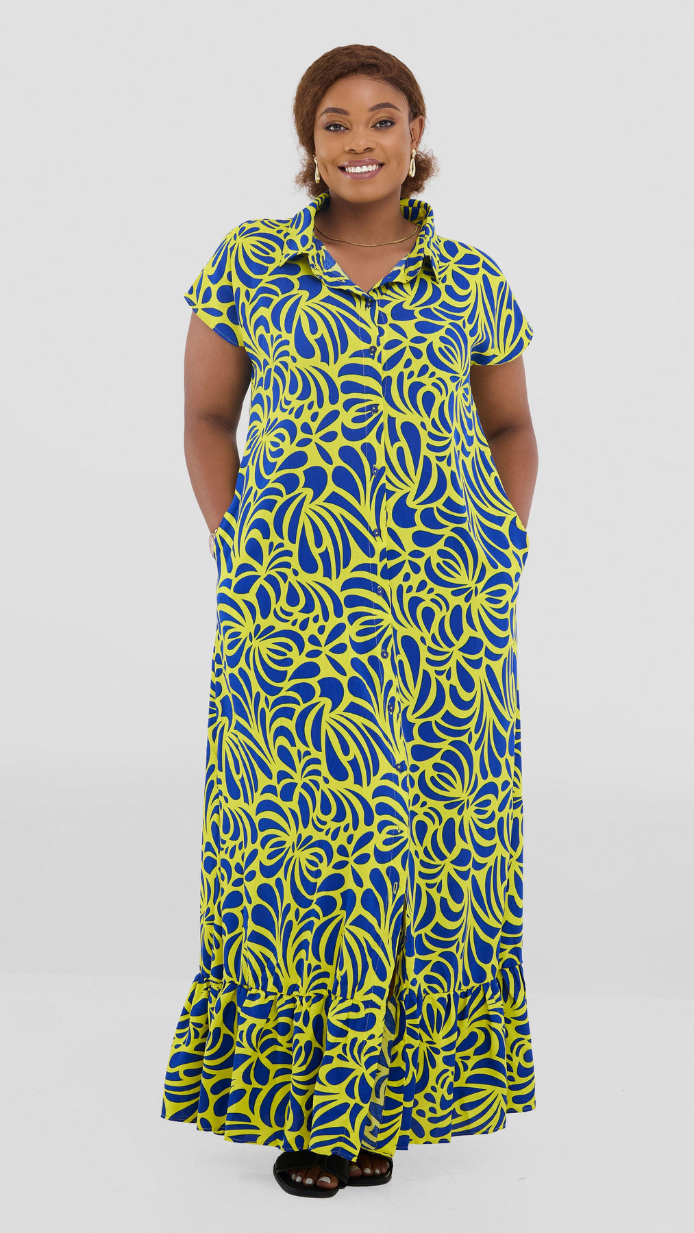 Embrace effortless elegance with the Vivo Maisha Drop Shoulder Maxi Dress. Crafted from breathable rayon, this striking yellow and navy print design features relaxed drop shoulders that create a flattering, contemporary silhouette. The flowing maxi length offers versatility for both casual days and evening occasions, while the timeless print adds visual interest to your wardrobe. Perfect for warm weather styling, this dress combines comfort with understated sophistication.