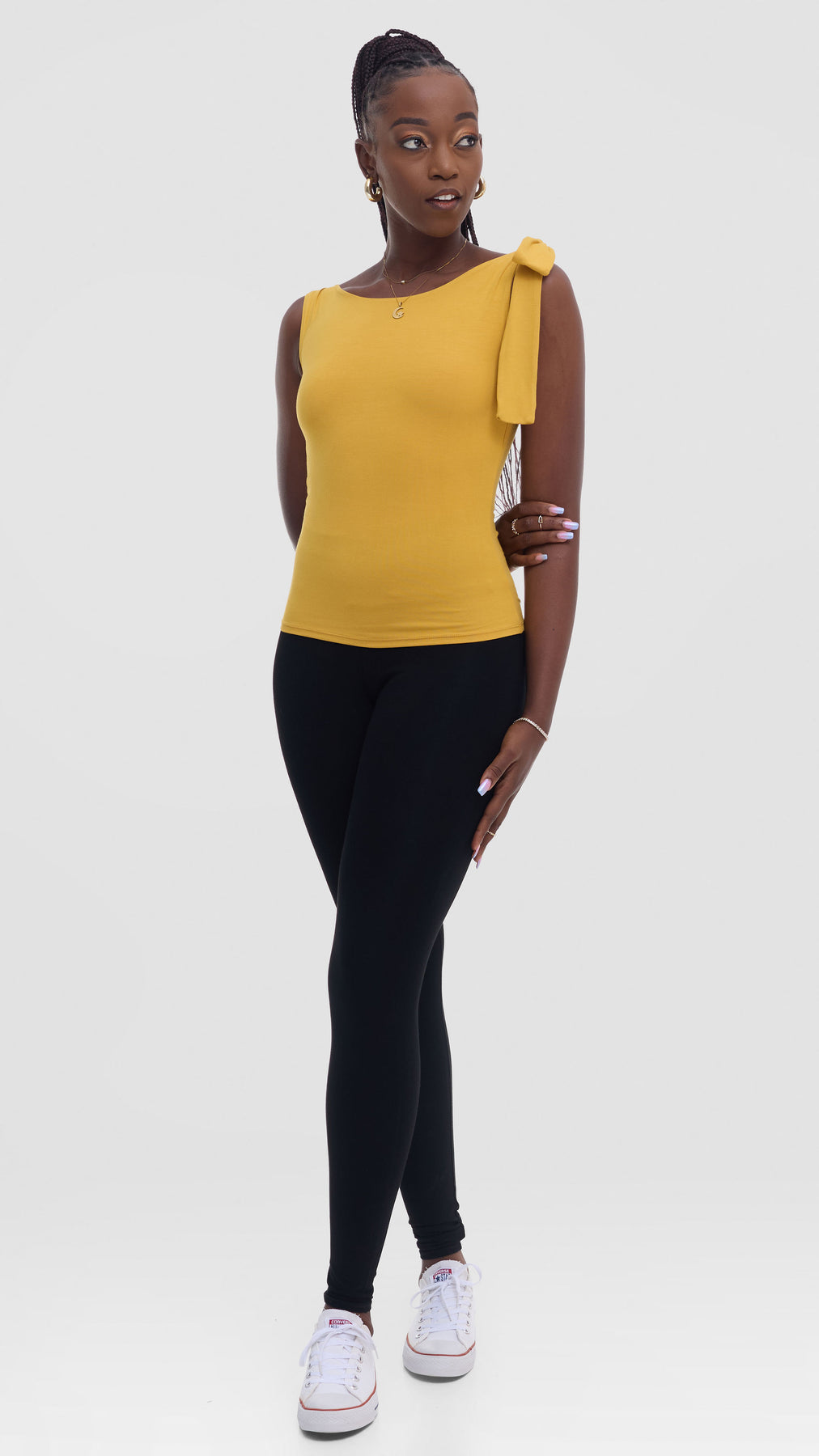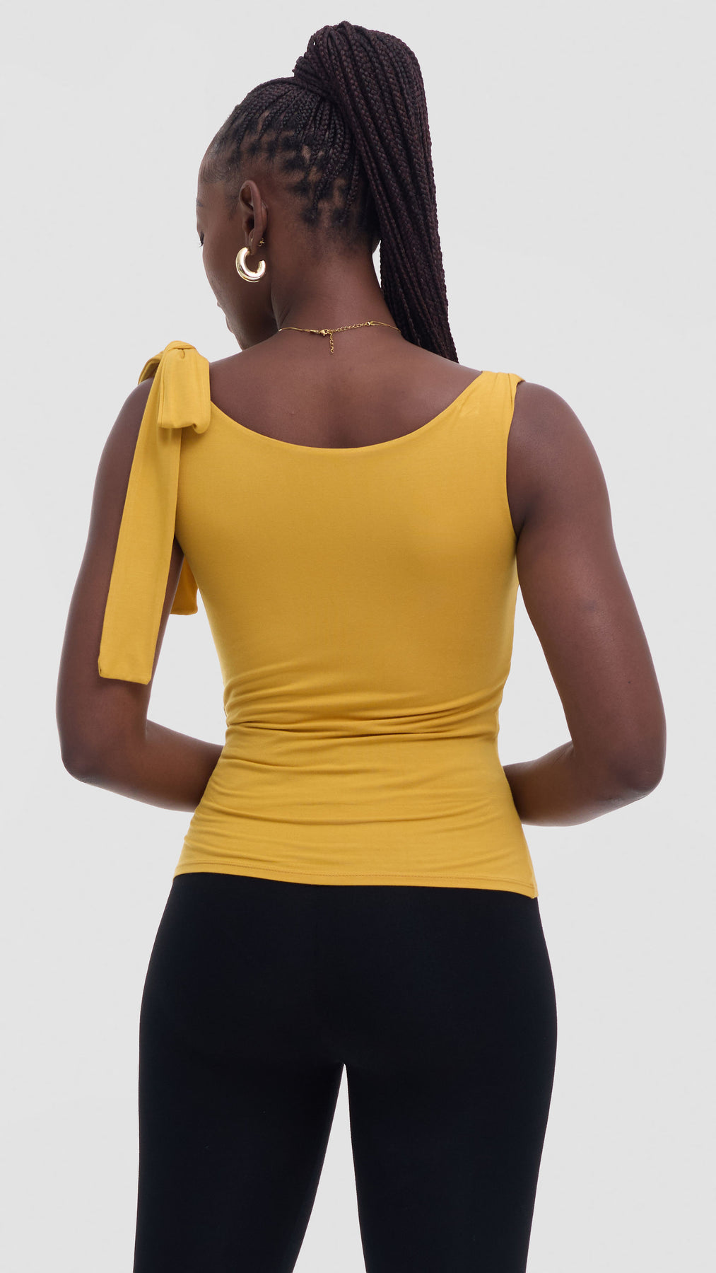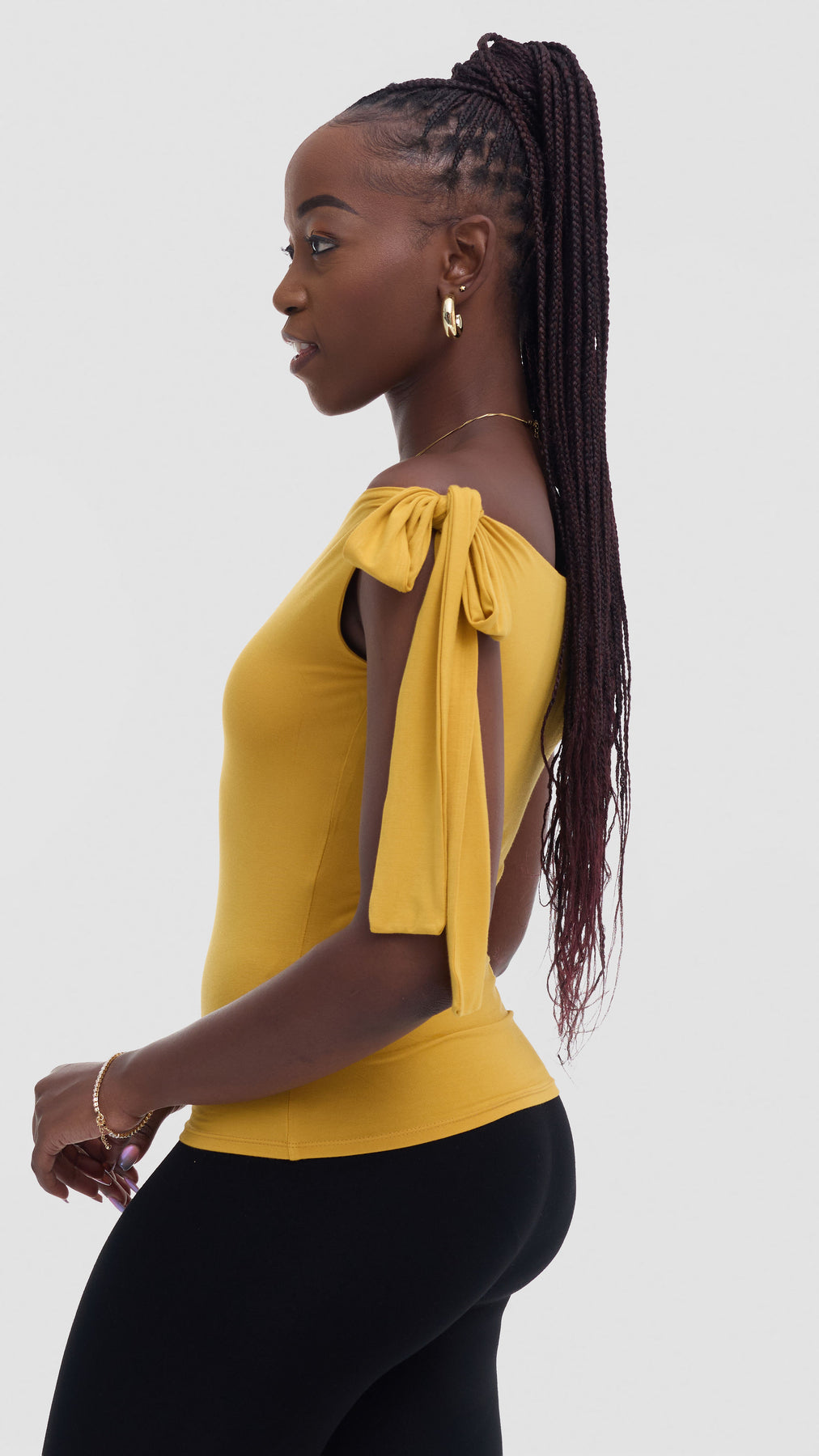 Elevate your everyday wardrobe with this versatile Studio Shoulder Tie Top, crafted from soft, breathable jersey fabric. The distinctive shoulder tie detail adds a modern twist to a classic silhouette, creating an effortlessly chic look. Perfect for layering or wearing solo, this mustard piece transitions seamlessly from day to night. The relaxed fit ensures comfort without compromising on style, making it an essential addition to your collection.