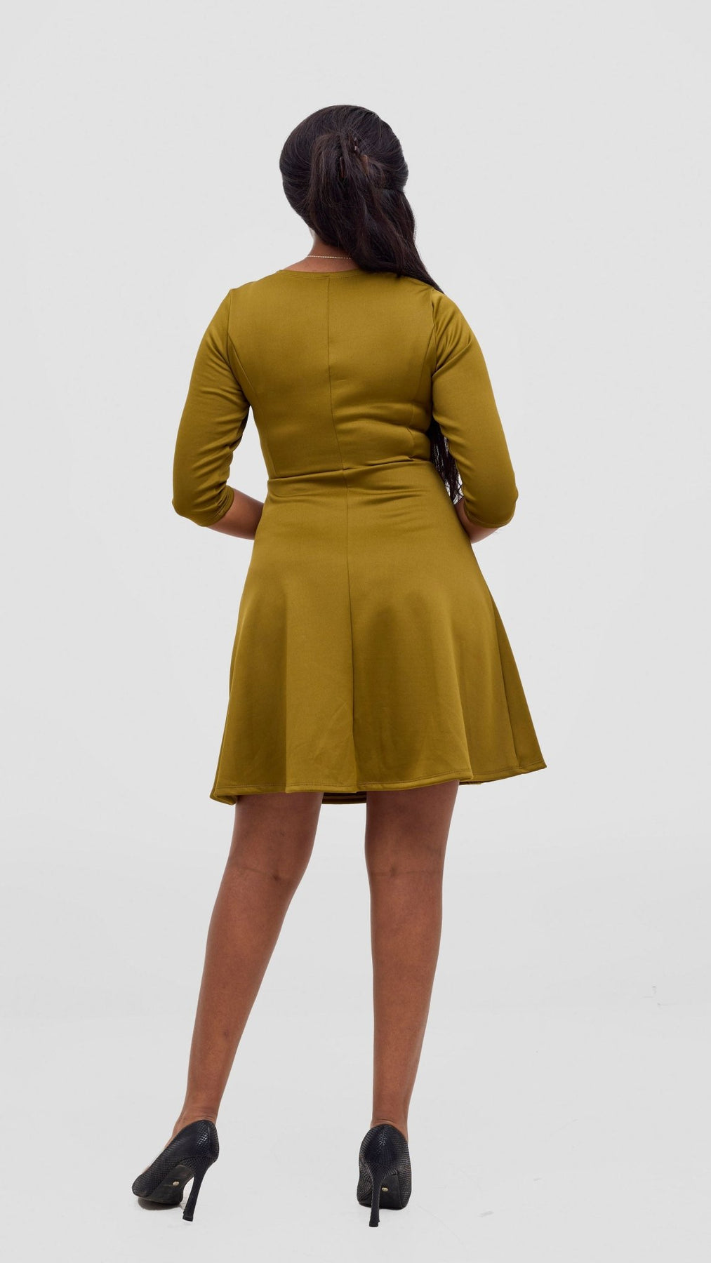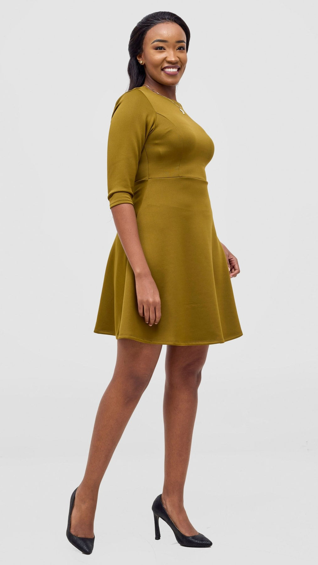The Vivo Diella 3/4 Sleeve A-Line Dress in dark olive offers a refined silhouette that effortlessly transitions from day to night. Its elegant cut flatters every figure, while the versatile hue complements a range of accessories. Perfect for both casual outings and more formal occasions, this dress combines comfort with timeless style.
