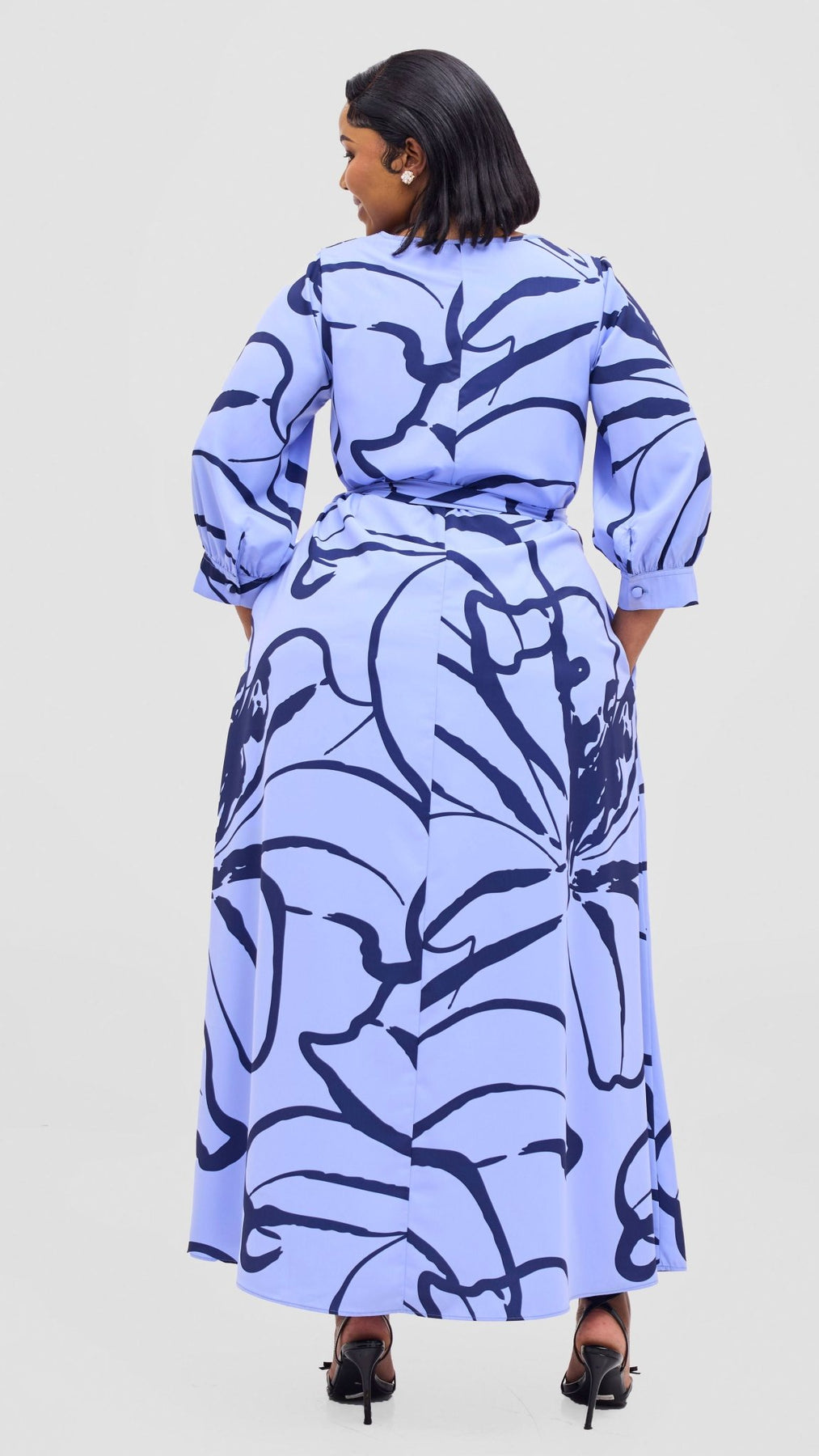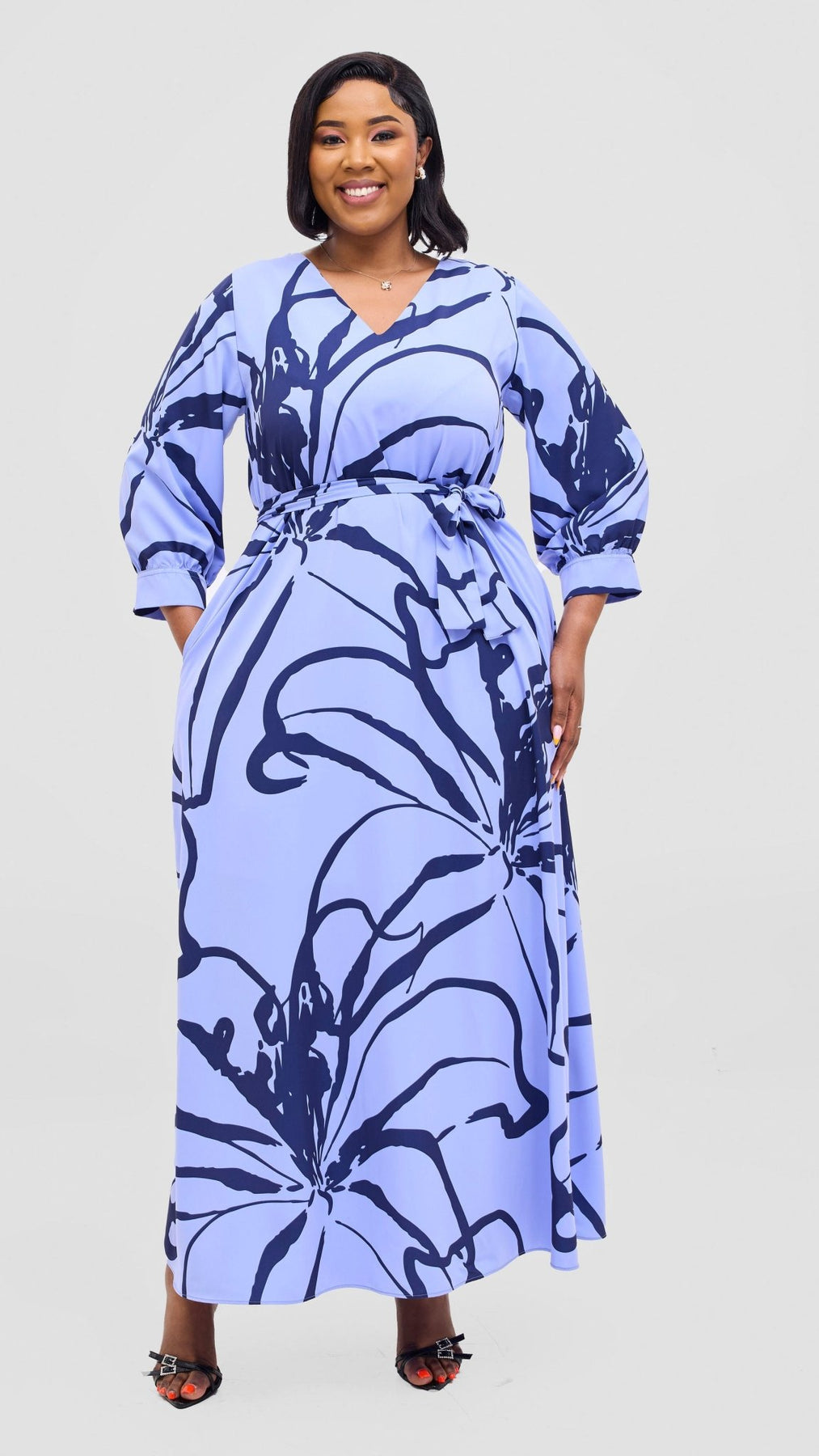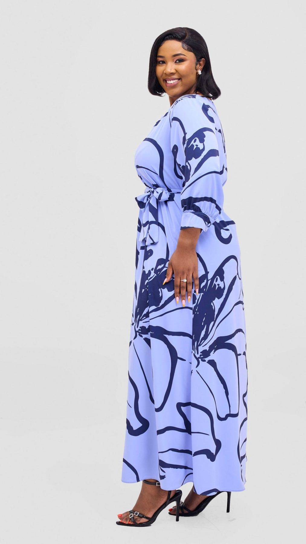 The Vivo Hadiya Tie Maxi Dress features a flattering V-neck design and a flowing maxi silhouette in a sophisticated light blue and black Luwe print. Its tie detail adds a customizable fit, enhancing comfort and style. Perfect for elegant occasions or casual outings, this dress combines effortless grace with expert tailoring.