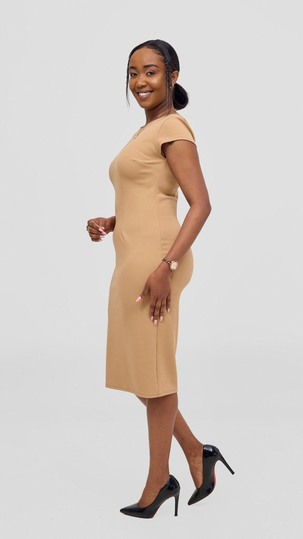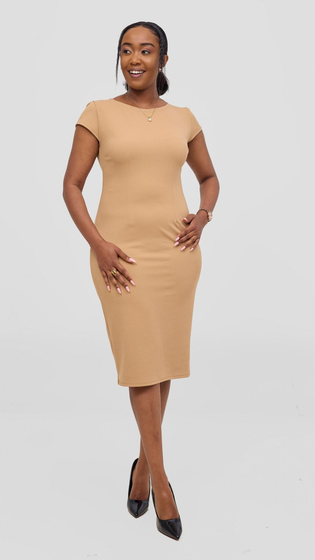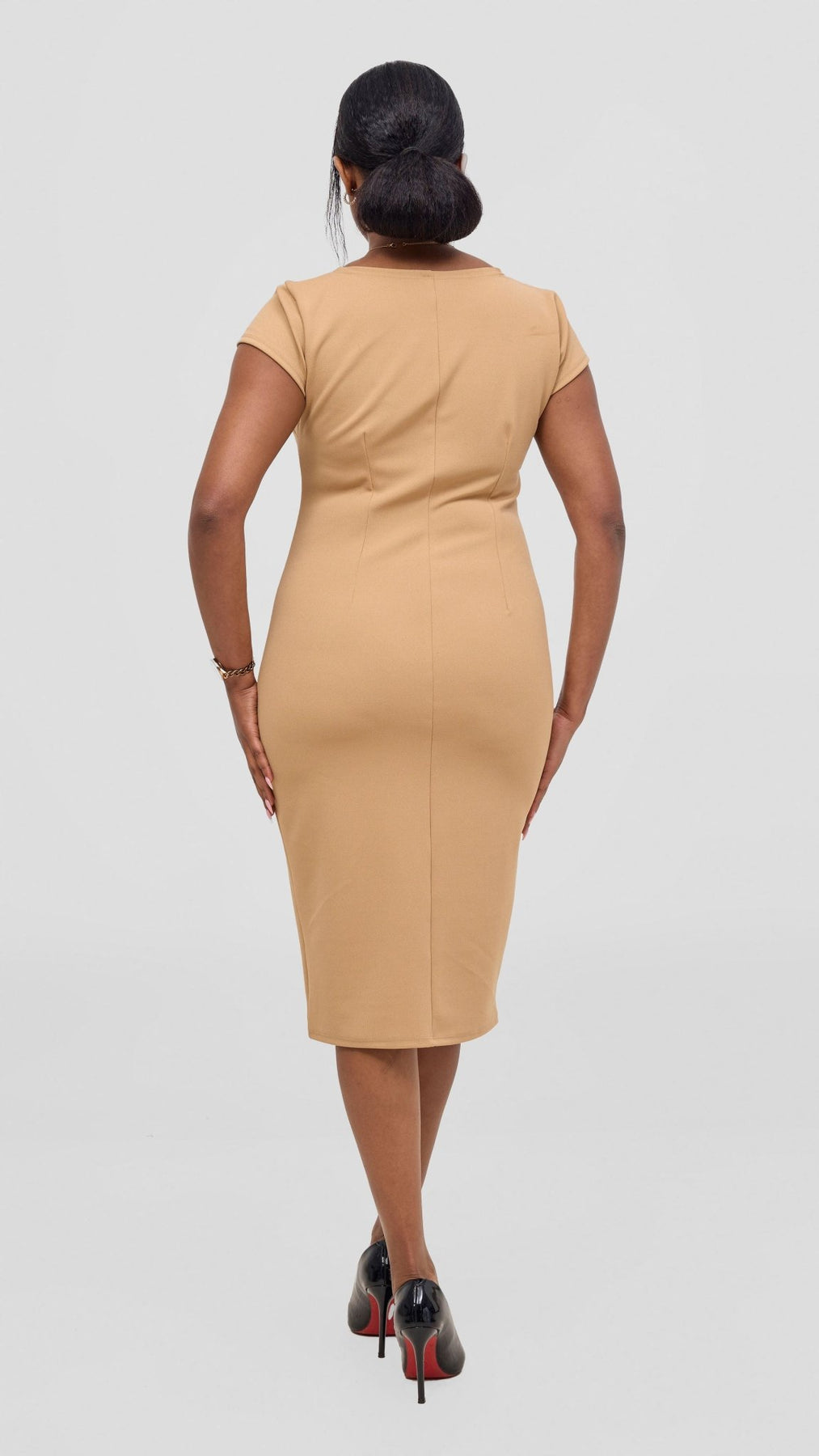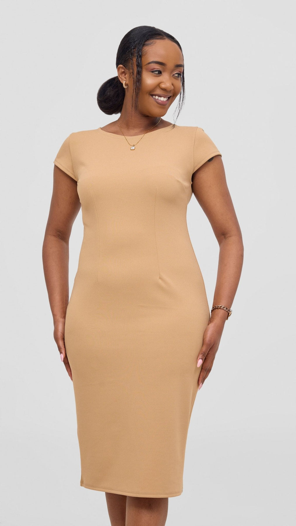 The Vivo Imara Cap Sleeve Sheath Dress in taupe combines refined tailoring with understated elegance. Its structured silhouette and cap sleeves offer a flattering fit that enhances your natural shape, perfect for professional settings or sophisticated events. The neutral taupe tone ensures versatile styling options, making it a timeless addition to your wardrobe. Crafted for confidence and comfort, this dress balances style with ease of wear.