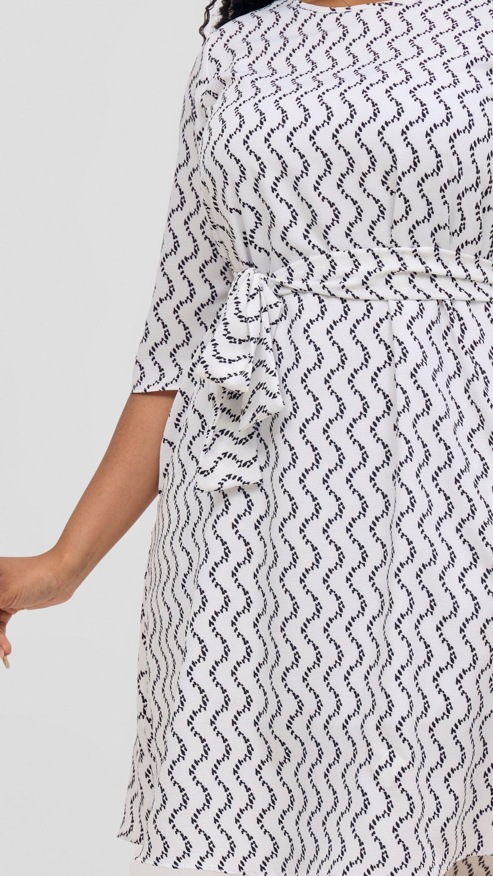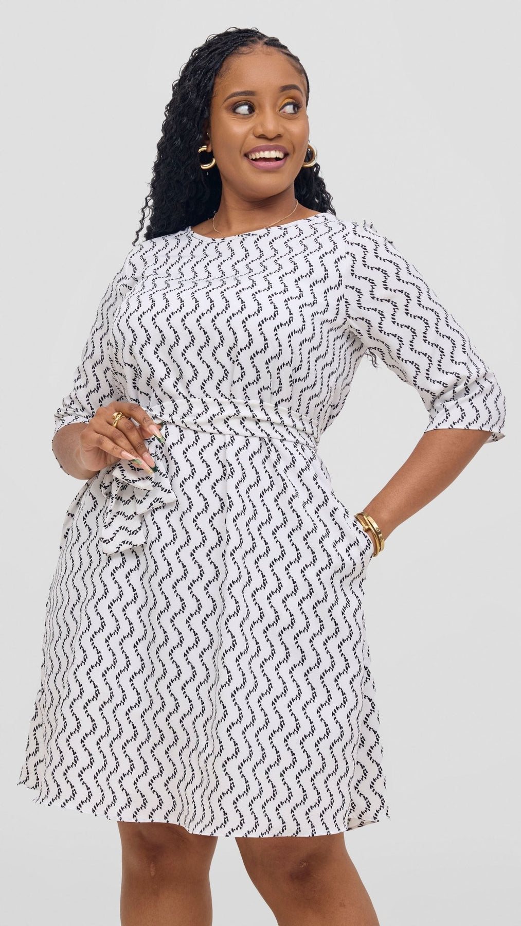 Elevate your wardrobe with the Vivo Laika 3/4 Sleeve Tent Dress in a striking white and black print. Its relaxed silhouette and three-quarter sleeves offer effortless sophistication and comfort for any occasion. The flowy design allows ease of movement while maintaining a polished, modern look. Perfect for day-to-night wear, this dress combines timeless style with contemporary ease.