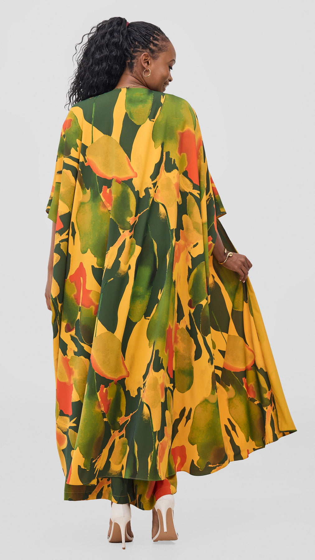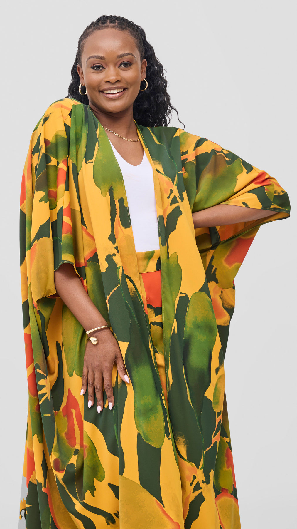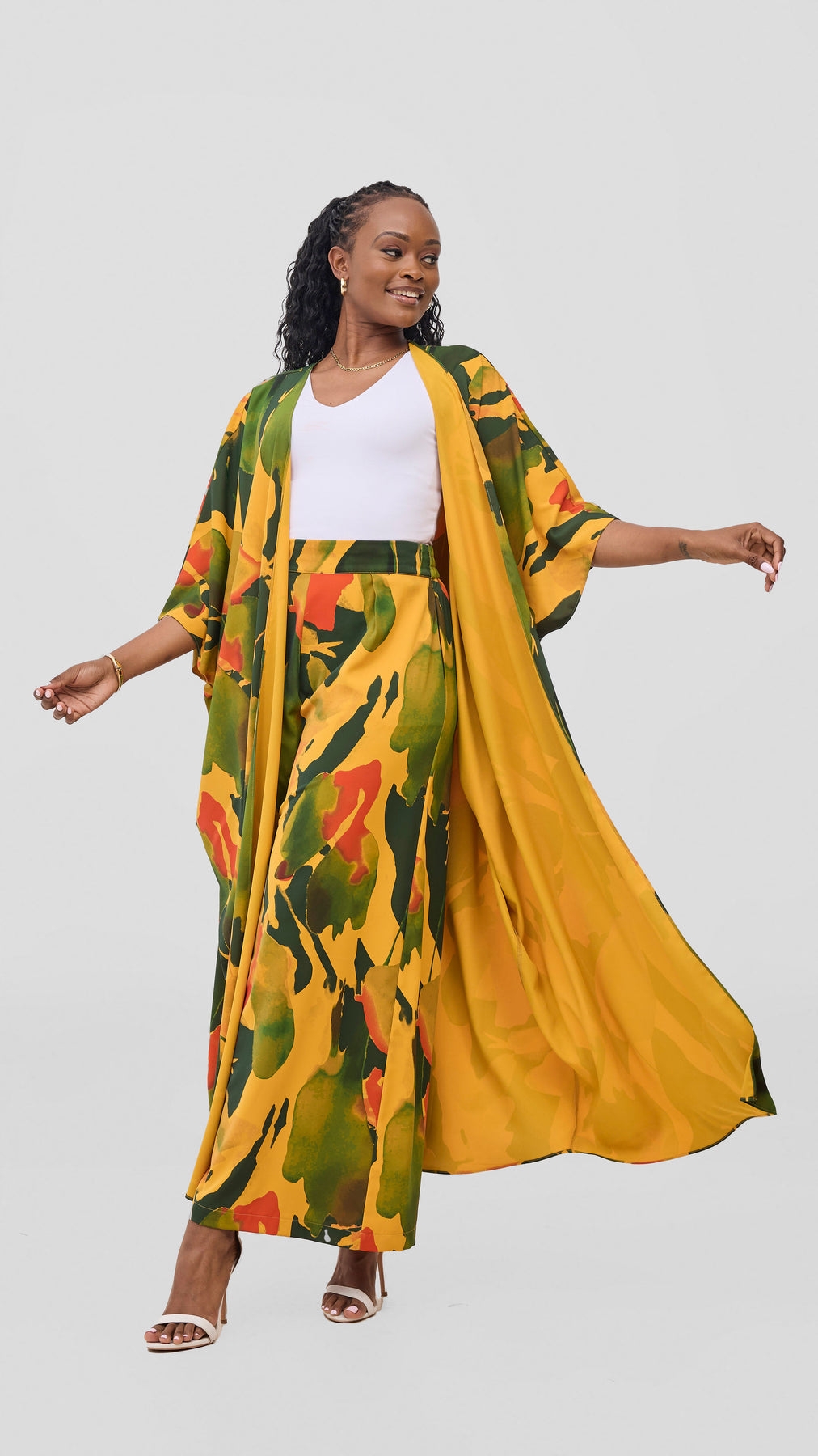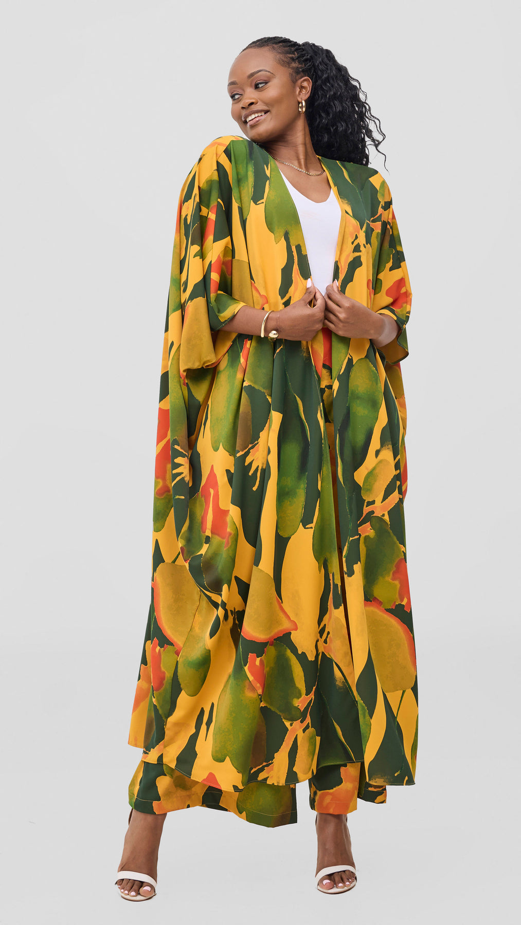 The Vivo Ayla Maxi Kimono in mustard with green dola print offers a stylish and comfortable layering option. Its flowing silhouette enhances any outfit while the vibrant print adds a unique touch. Pair it with the matching pants to create a coordinated and effortless look perfect for both casual and dressy occasions.