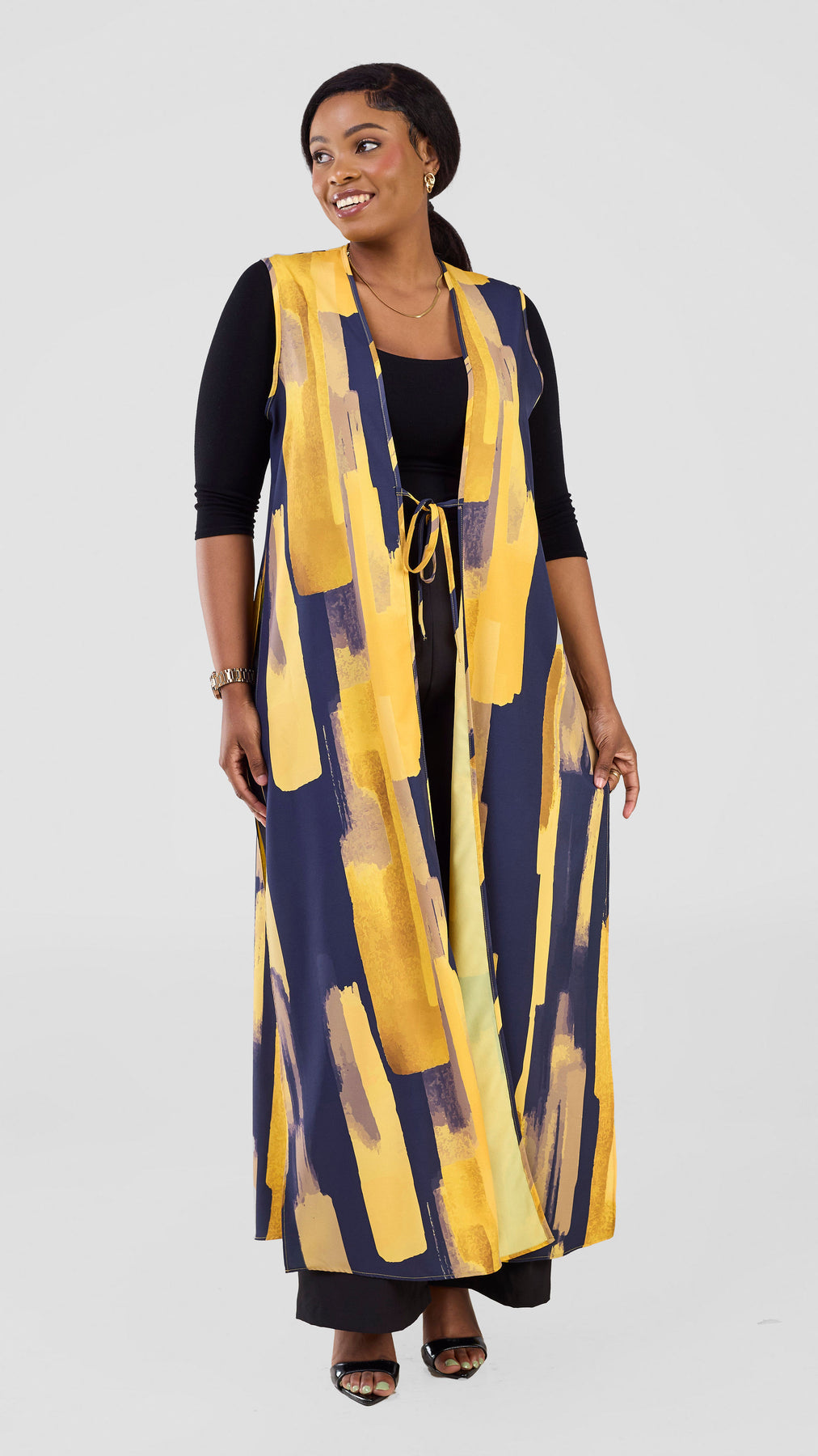 The Vivo Isabi Sleeveless Kimono in dark navy with a yellow pasi print offers a stylish yet comfortable layer for your wardrobe. Its sleeveless design ensures ease of movement and breathability, while the delicate print adds a touch of vibrant personality. Perfect for layering over your favorite tops or dresses, this kimono supports your everyday style with effortless grace and comfort.