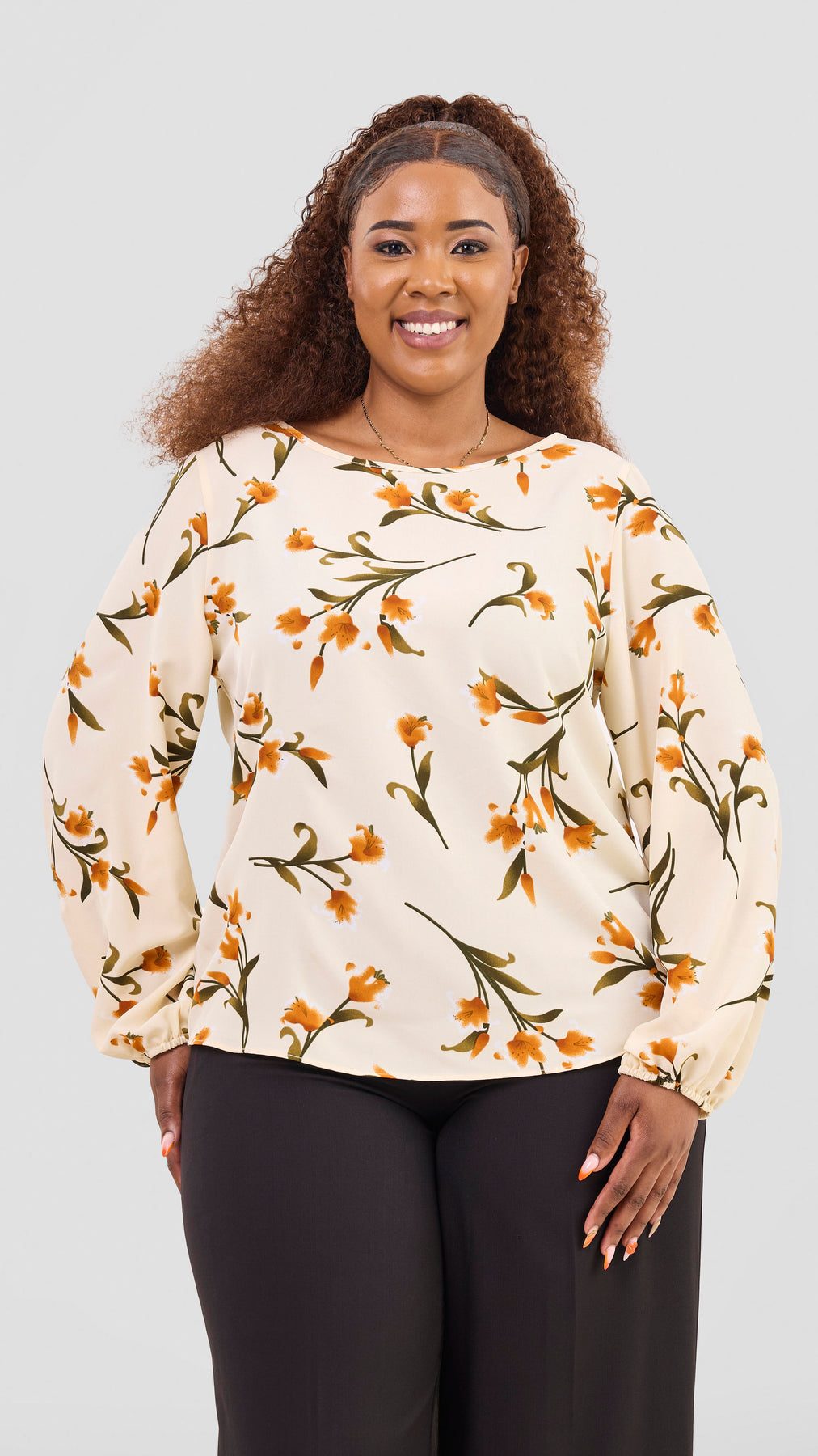 This Vivo Basic Crepe Bishop Sleeve Top in cream with a olive print features soft, breathable fabric and elegant bishop sleeves that offer both comfort and style. Its relaxed fit makes it perfect for everyday wear while adding a touch of sophistication to your look. Ideal for pairing with jeans or skirts, this top supports your confidence with effortless elegance throughout the day.
