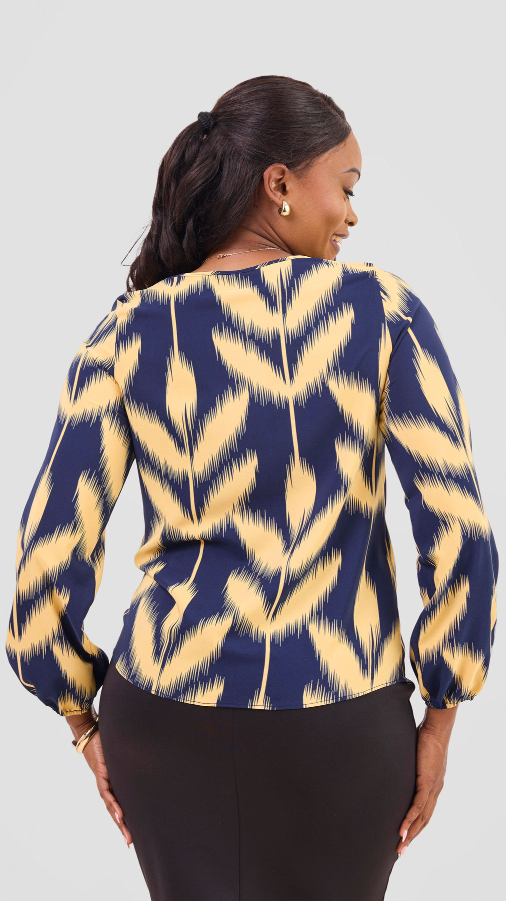 Vivo Basic Crepe Bishop Sleeve Top - Navy / Mustard Print
