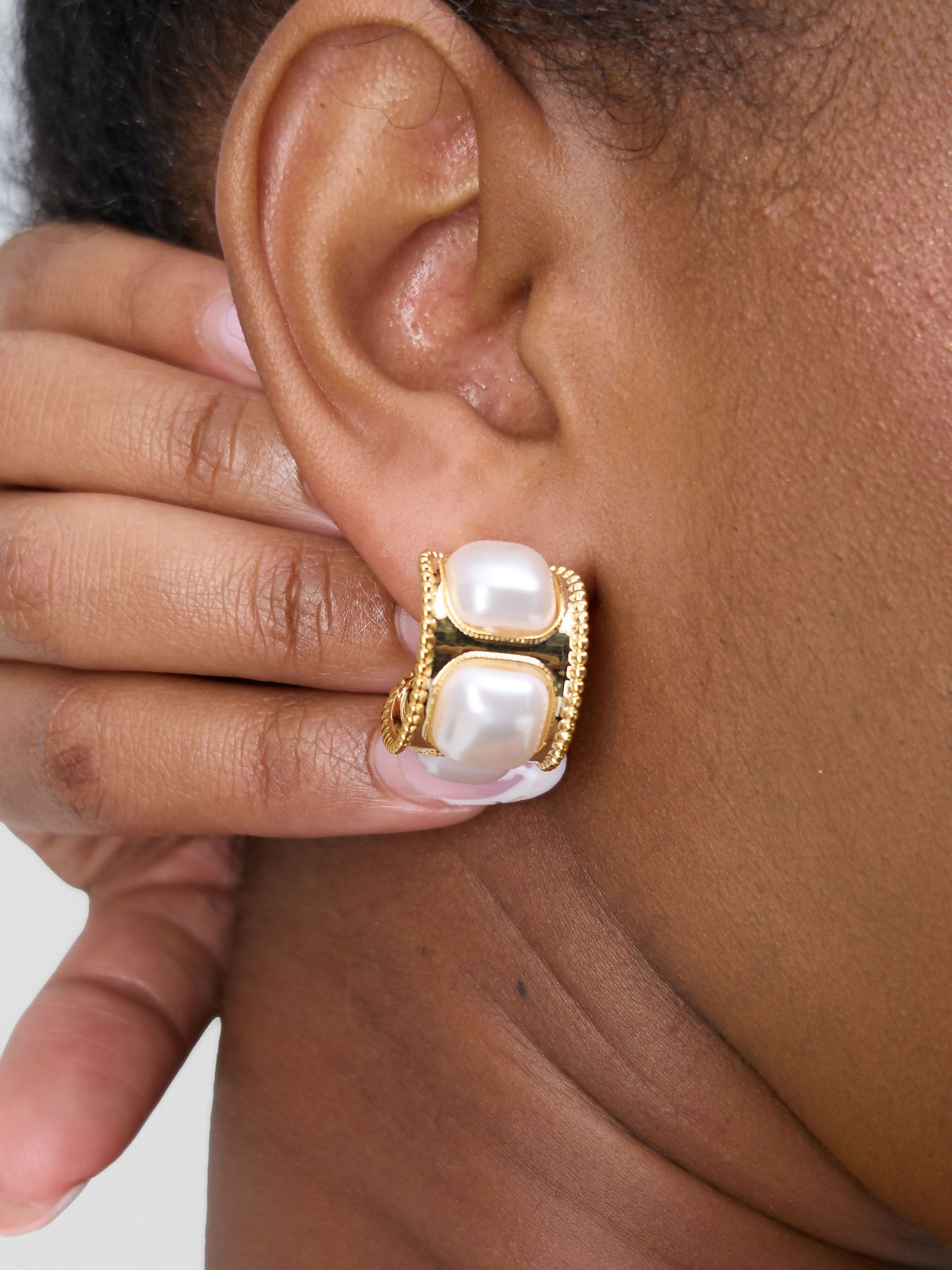 These chic earrings feature a rectangular, gold-toned base with a distinct beaded or ridged texture along the edges, framing two prominent, lustrous white or cream-colored pearls. The pearls are set vertically, creating a sophisticated and timeless design with a touch of classic elegance.
