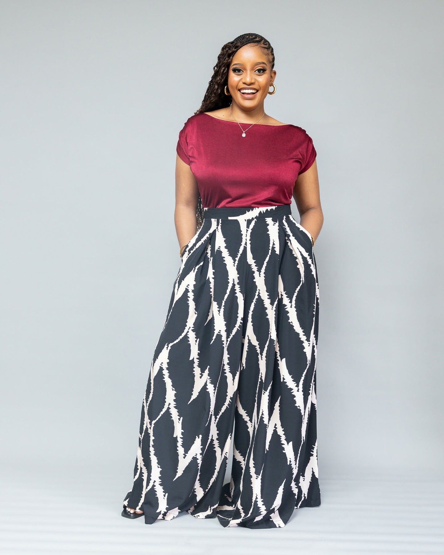 The Ayira Palazzo Pants bring subtle sophistication to everyday style. In a soft beige tone with bold black diamond prints, they strike the perfect balance between minimal and statement. The wide-leg fit gives them an airy, graceful flow, while the addition of side pockets makes them effortlessly practical. Whether you are heading to the office, enjoying a relaxed afternoon, or stepping out in the evening, these palazzo pants keep you polished without trying too hard.