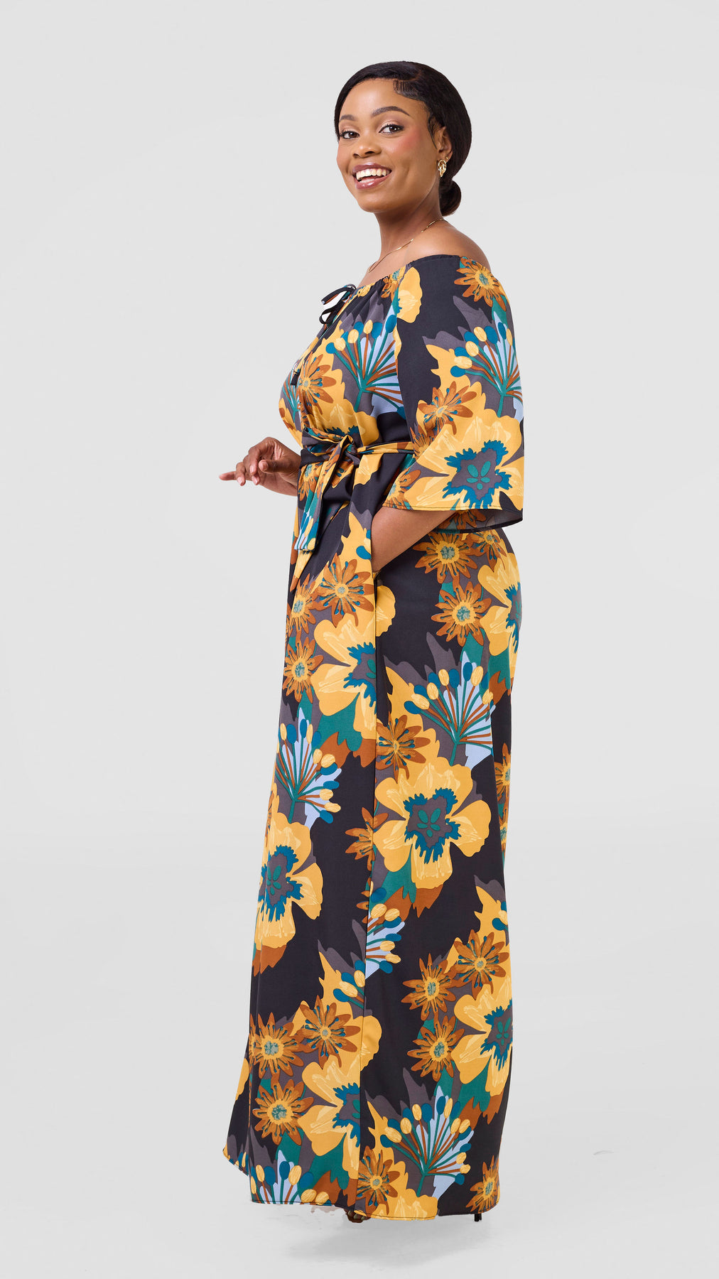 The Vivo Zahari 3/4 Sleeve Off-Shoulder Jumpsuit in Teal and Mustard offers a stylish blend of comfort and flair. Its off-shoulder design and vibrant print create a fresh, confident look, while the 3/4 sleeves provide ease of movement. Perfect for casual outings or special occasions, this jumpsuit enhances your silhouette gracefully, letting you express your unique style with ease.