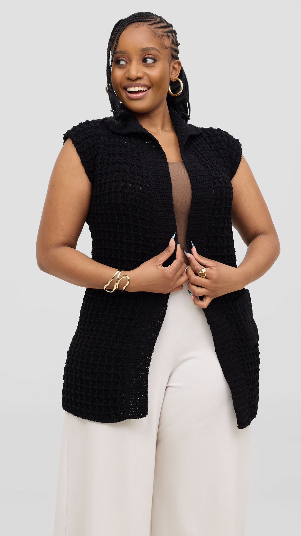 Elevate your layering style with the Timyt Urban Wear Urban Yarn Sleveeless Crocheted - Black, a hand-crocheted sleeveless longline sweater vest designed for both elegance and comfort. Meticulously crafted with a textured open-weave design, this versatile black piece adds a polished touch to any outfit.