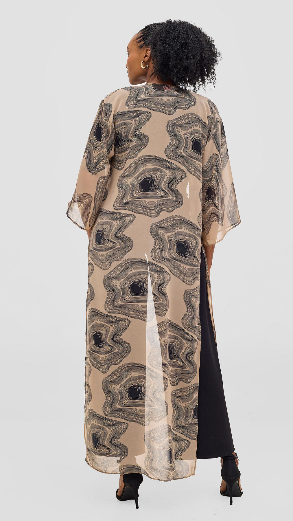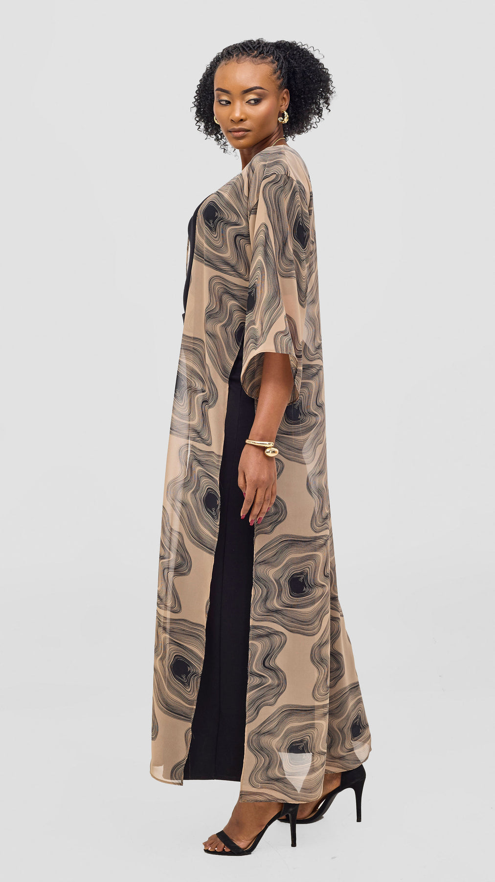 Elevate your style with the Vivo Nandi High Slit Kimono in light tan with a black print. Its flowing design and high slit offer both comfort and a refined silhouette, perfect for layering over any outfit. The warm tones and subtle shimmer bring a touch of elegance to your look, making it ideal for both casual and special occasions.