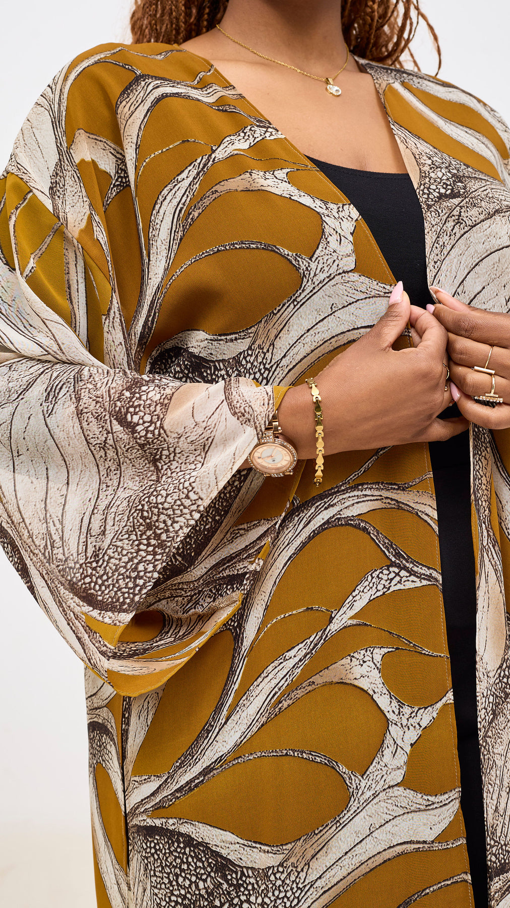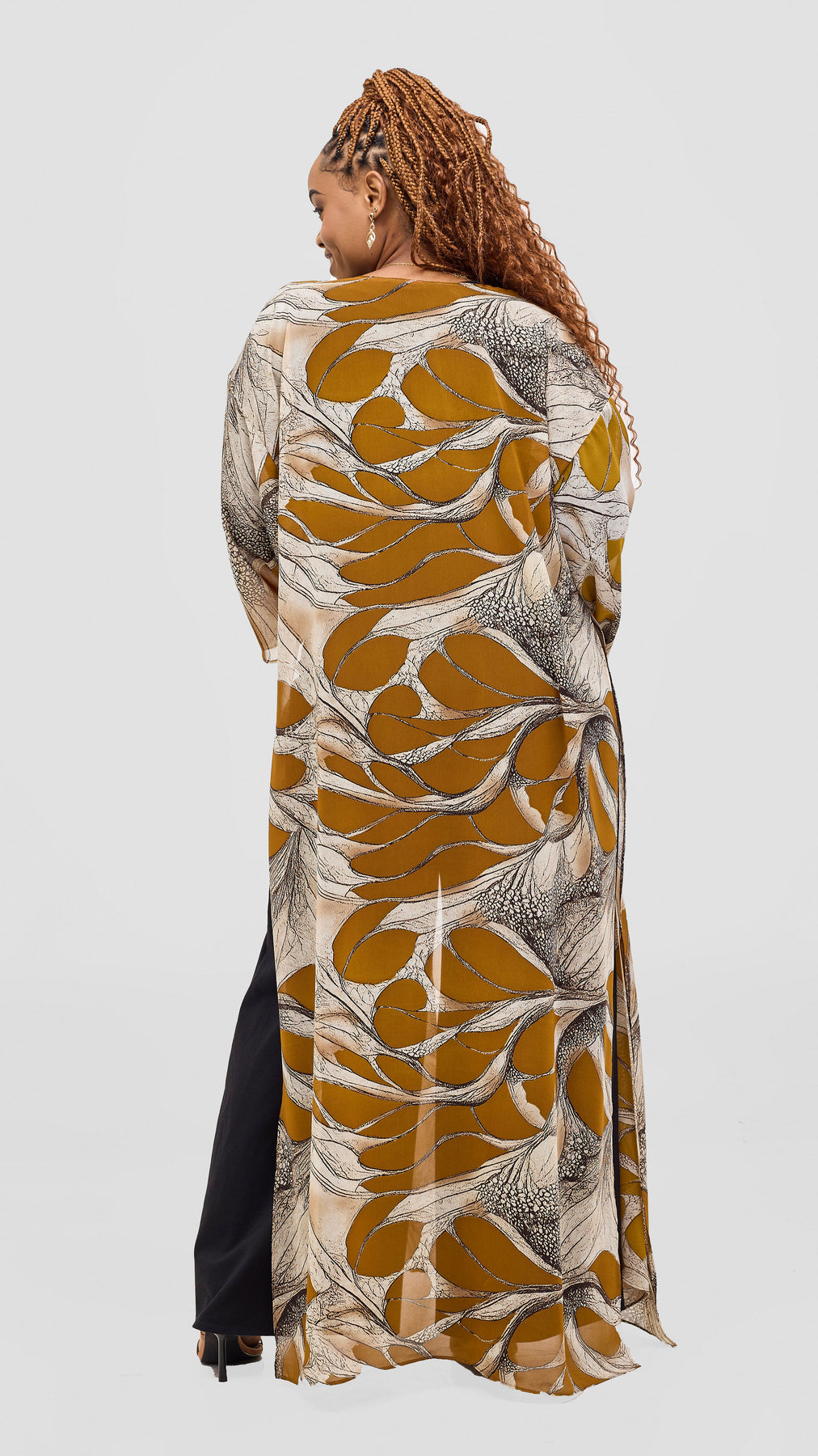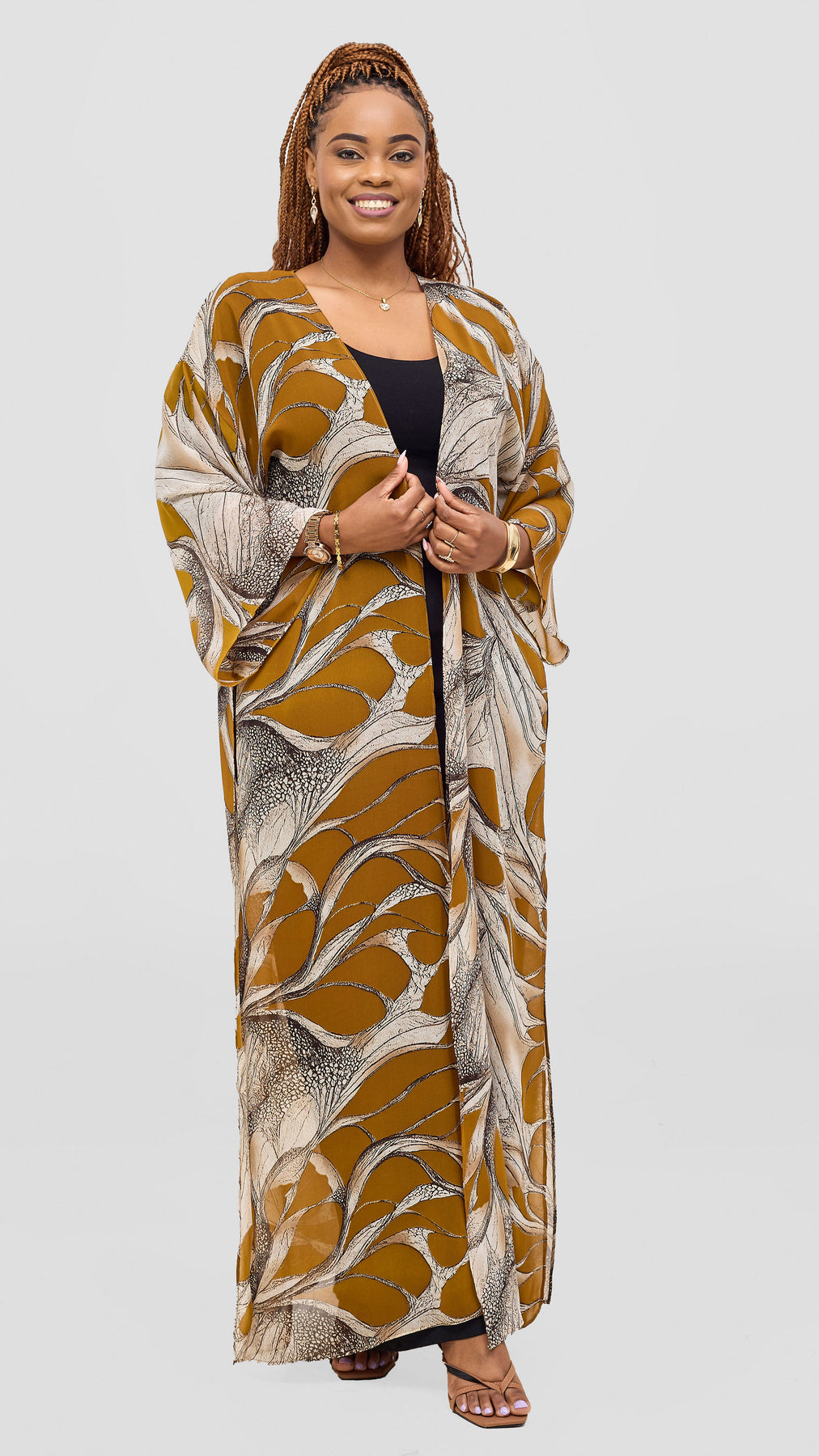 Elevate your style with the Vivo Nandi High Slit Kimono in tan with a gold print. Its flowing design and high slit offer both comfort and a refined silhouette, perfect for layering over any outfit. The warm tones and subtle shimmer bring a touch of elegance to your look, making it ideal for both casual and special occasions.