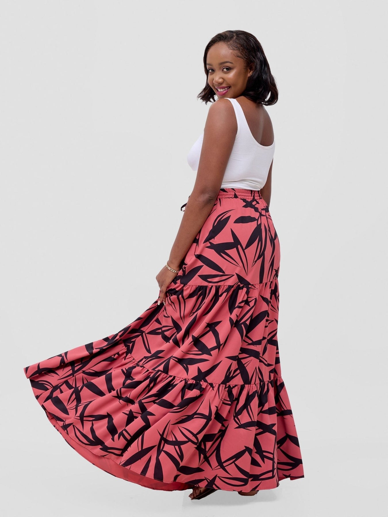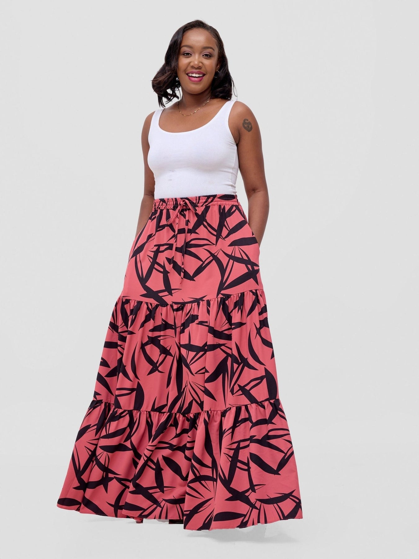 Vivo Serwa Tiered Maxi Skirt - Coral / Black Wera Print - Shopzetu