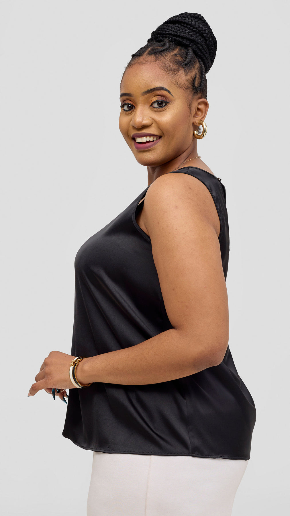 The Vivo Nora Round Neck Sleeveless Top in Black offers a comfortable, breathable fit perfect for warm days or layering. Its sleeveless design and soft fabric provide ease of movement, while the round neckline adds a simple, flattering touch. Ideal for casual outings or as a wardrobe staple, this top supports your need for both style and comfort.