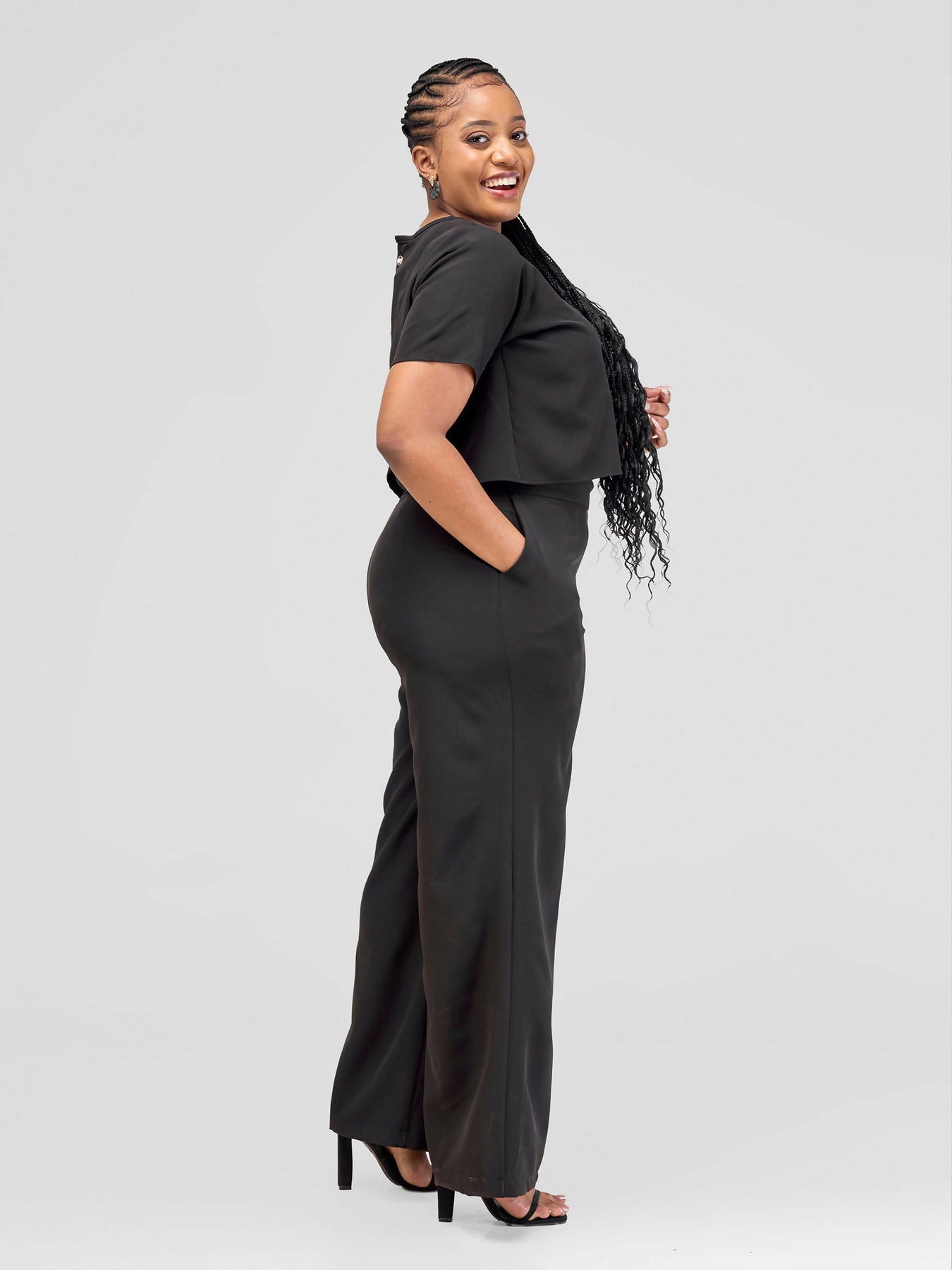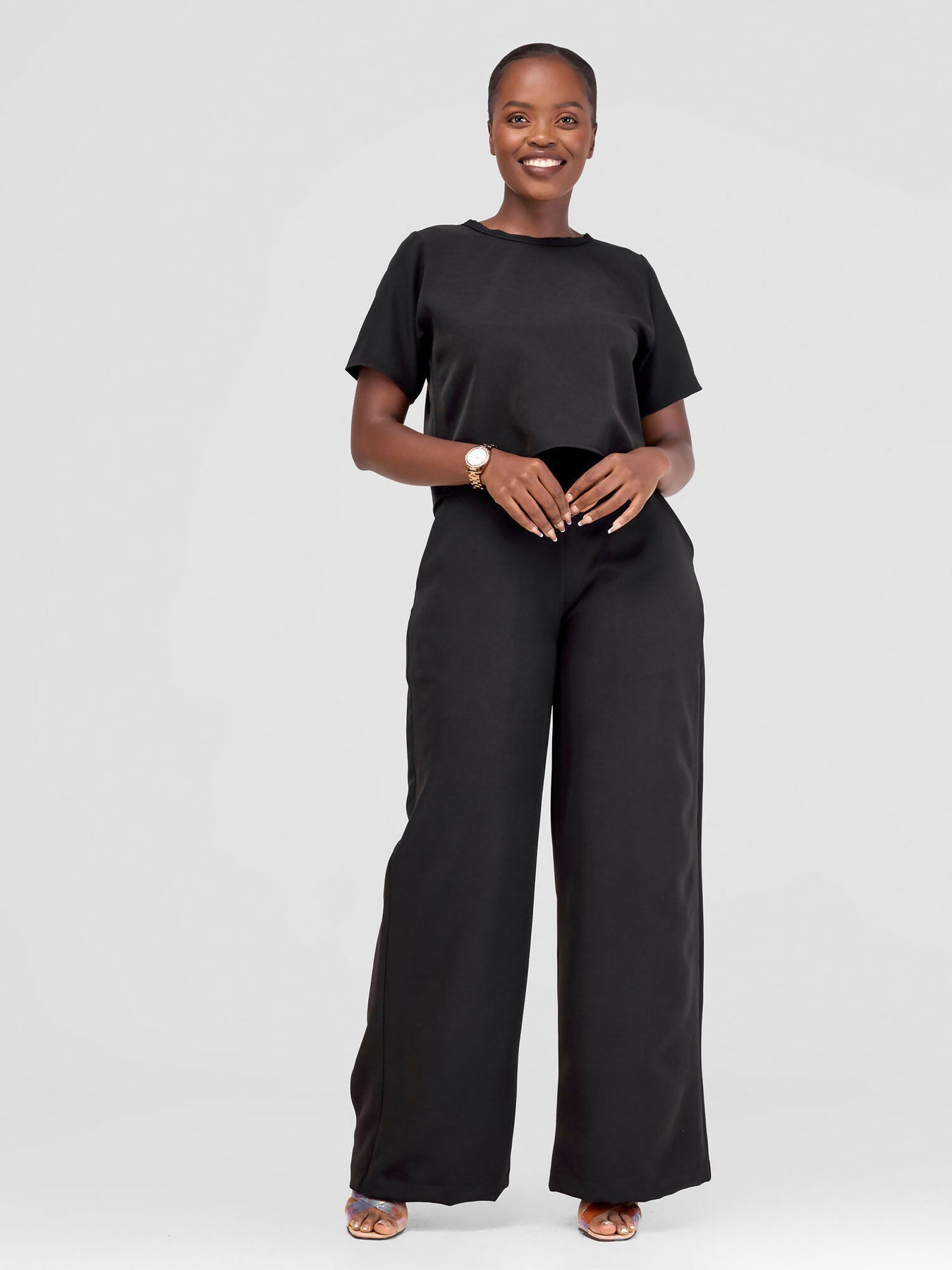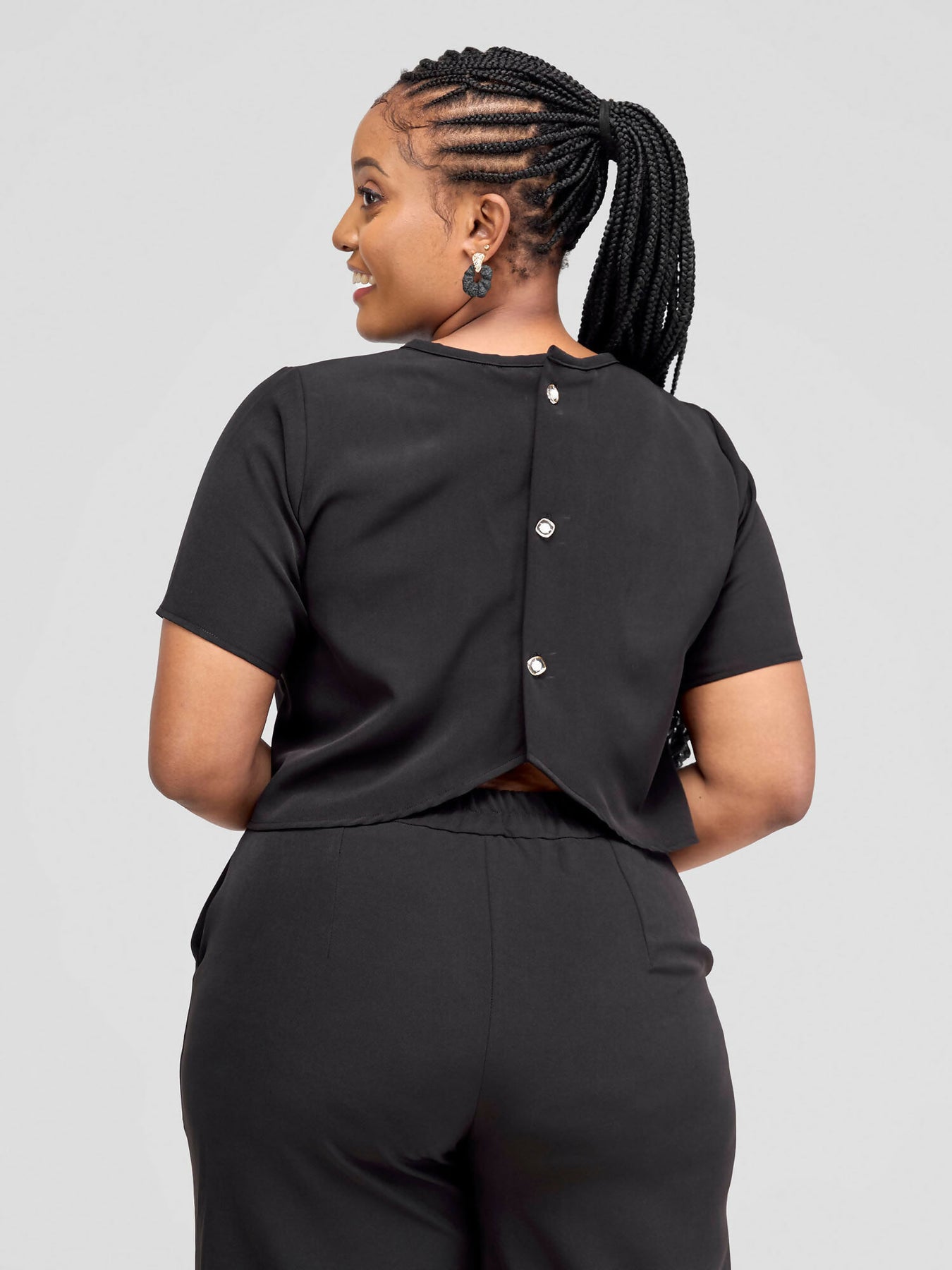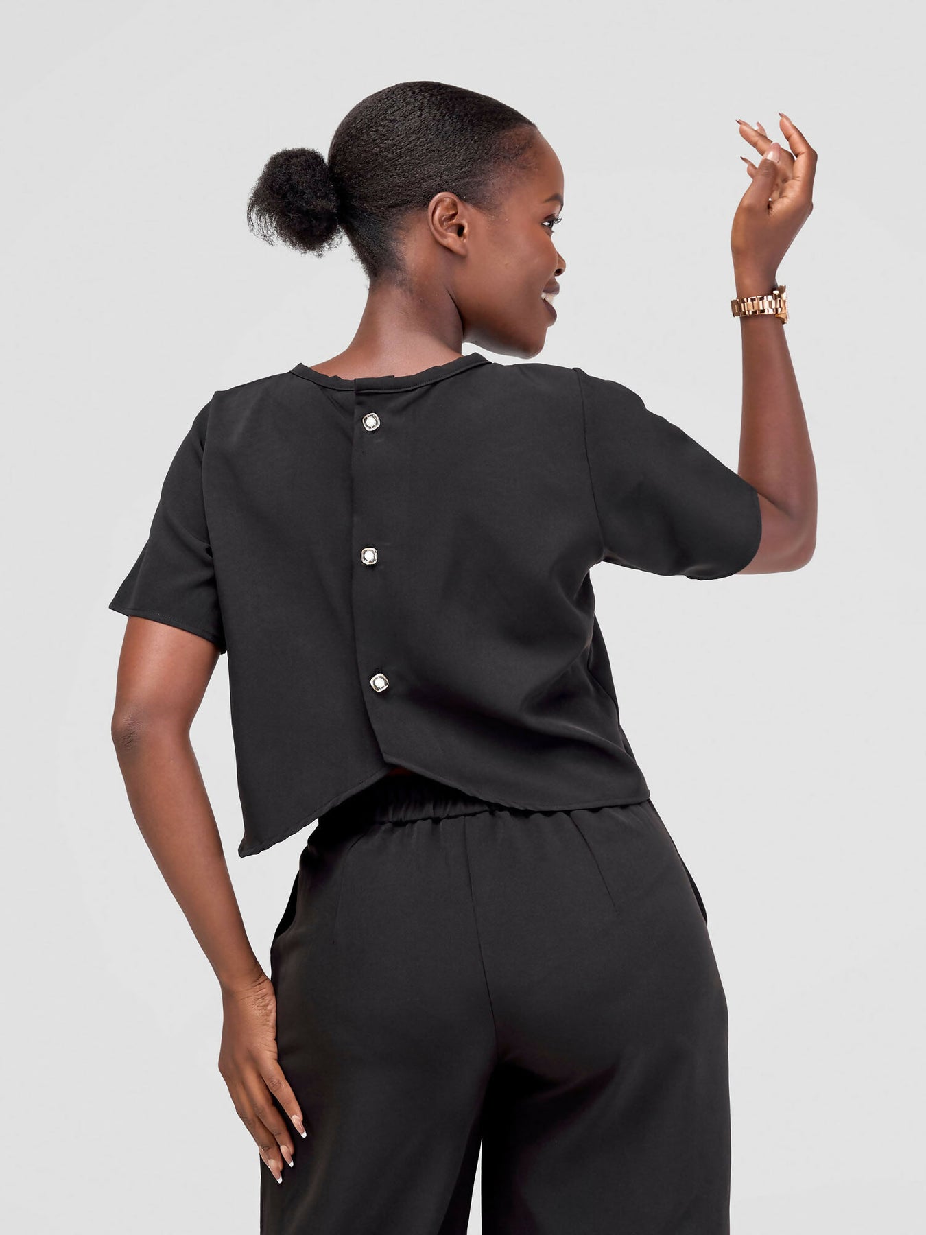 Features: Two-piece, top has buttons at the back, high round neckline, short sleeve, fancy top, pants have elasticated waistline, wide leg, side pockets.
