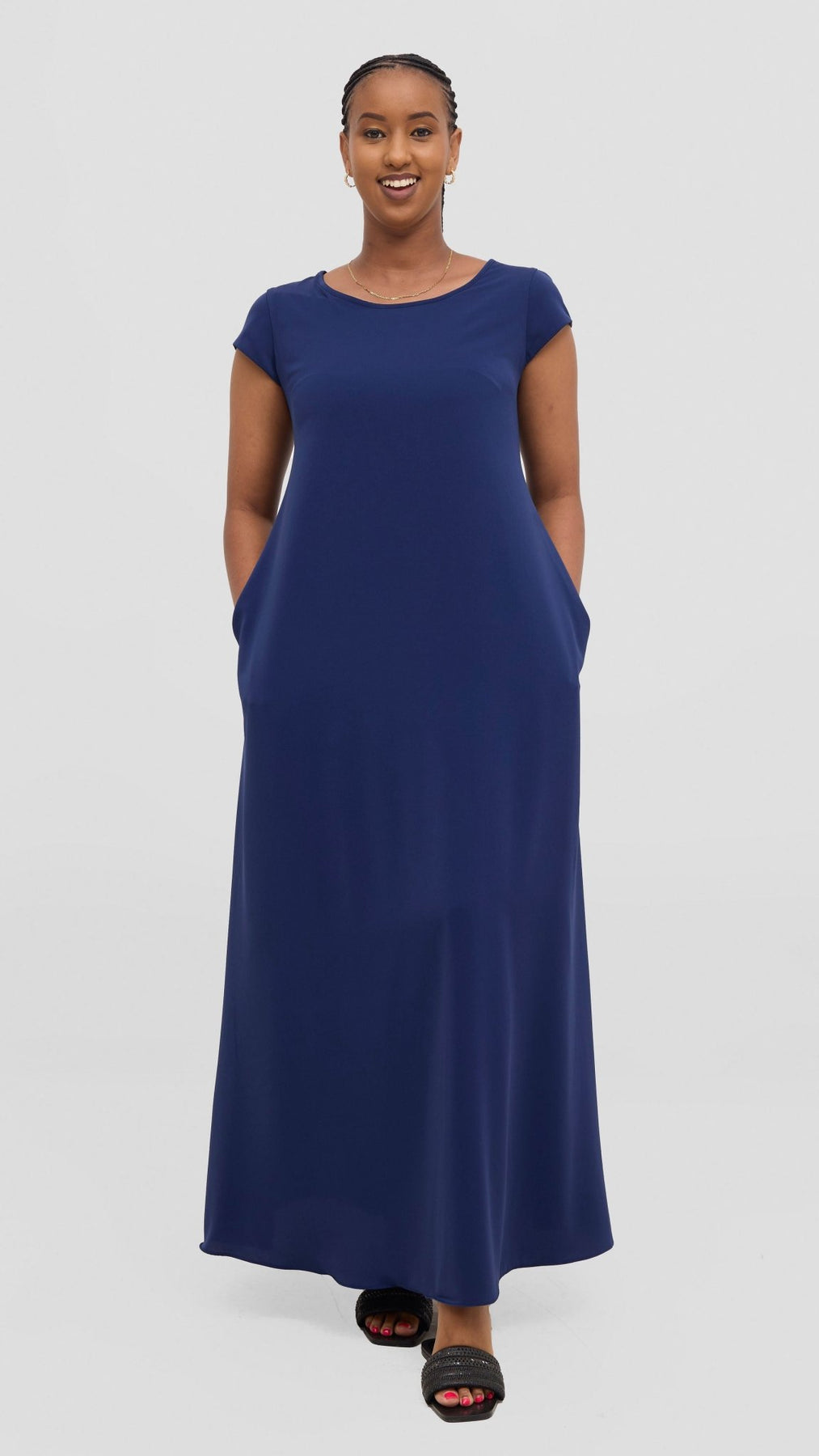 This navy maxi dress features a classic round neck and a flowing silhouette, offering effortless comfort and style. Its solid color design makes it a versatile wardrobe staple, perfect for both casual outings and more polished occasions. Easy to wear and maintain, this dress combines simplicity with elegance for a timeless look.