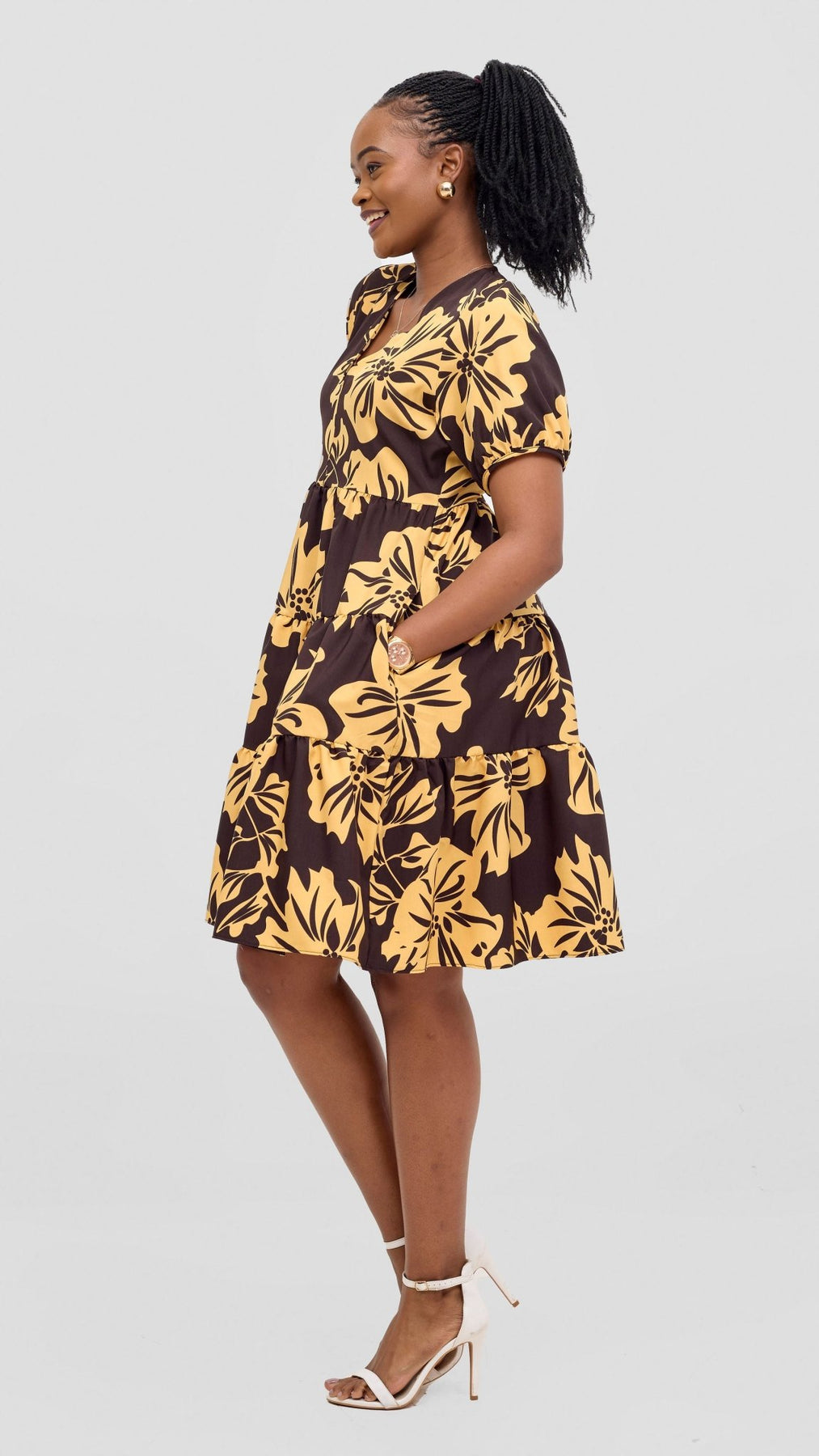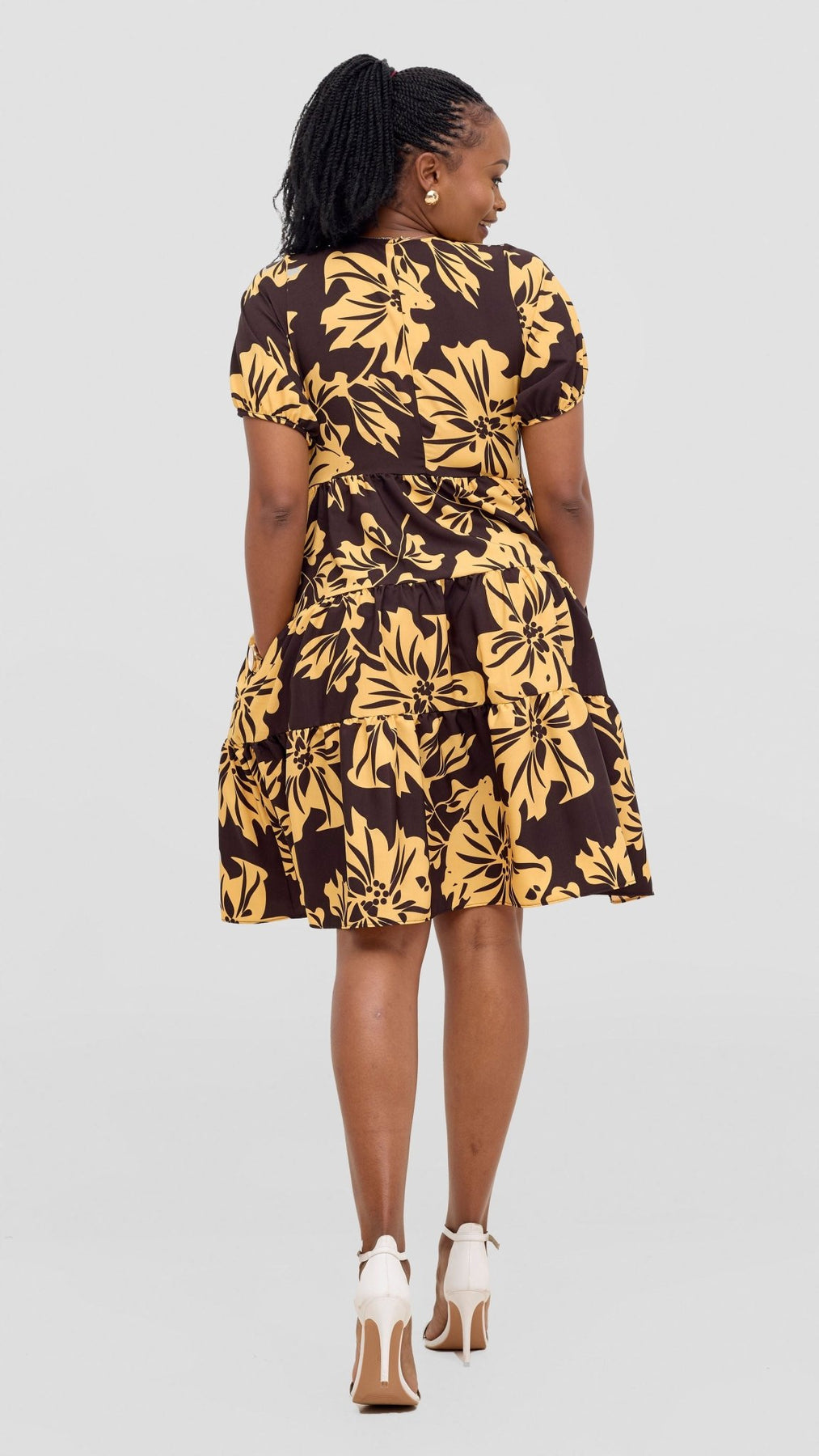 The Vivo Wingu Tiered Knee Length Dress in brown and cream print combines elegance with comfort. Its tiered layers create a flattering silhouette that moves beautifully, making it ideal for both daytime events and evening occasions. This dress offers a stylish, versatile option to enhance your wardrobe with effortless charm.